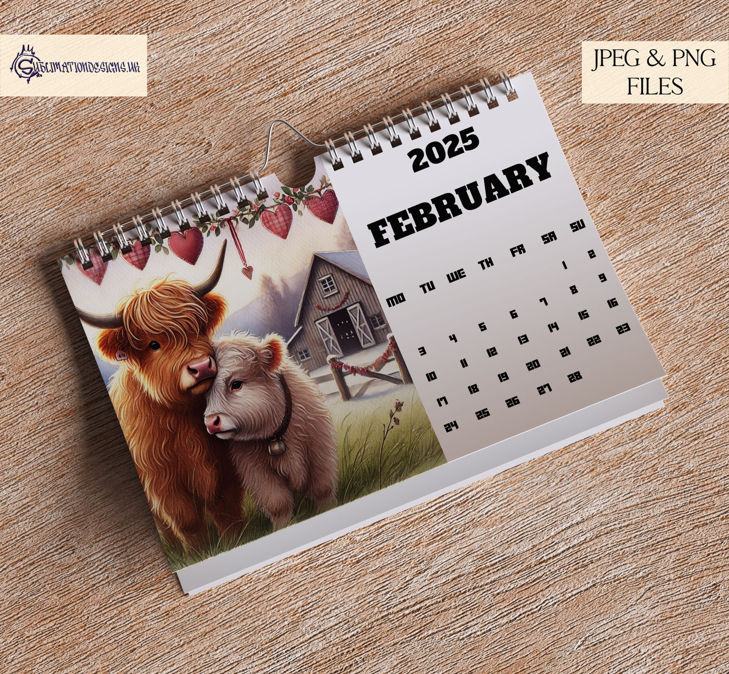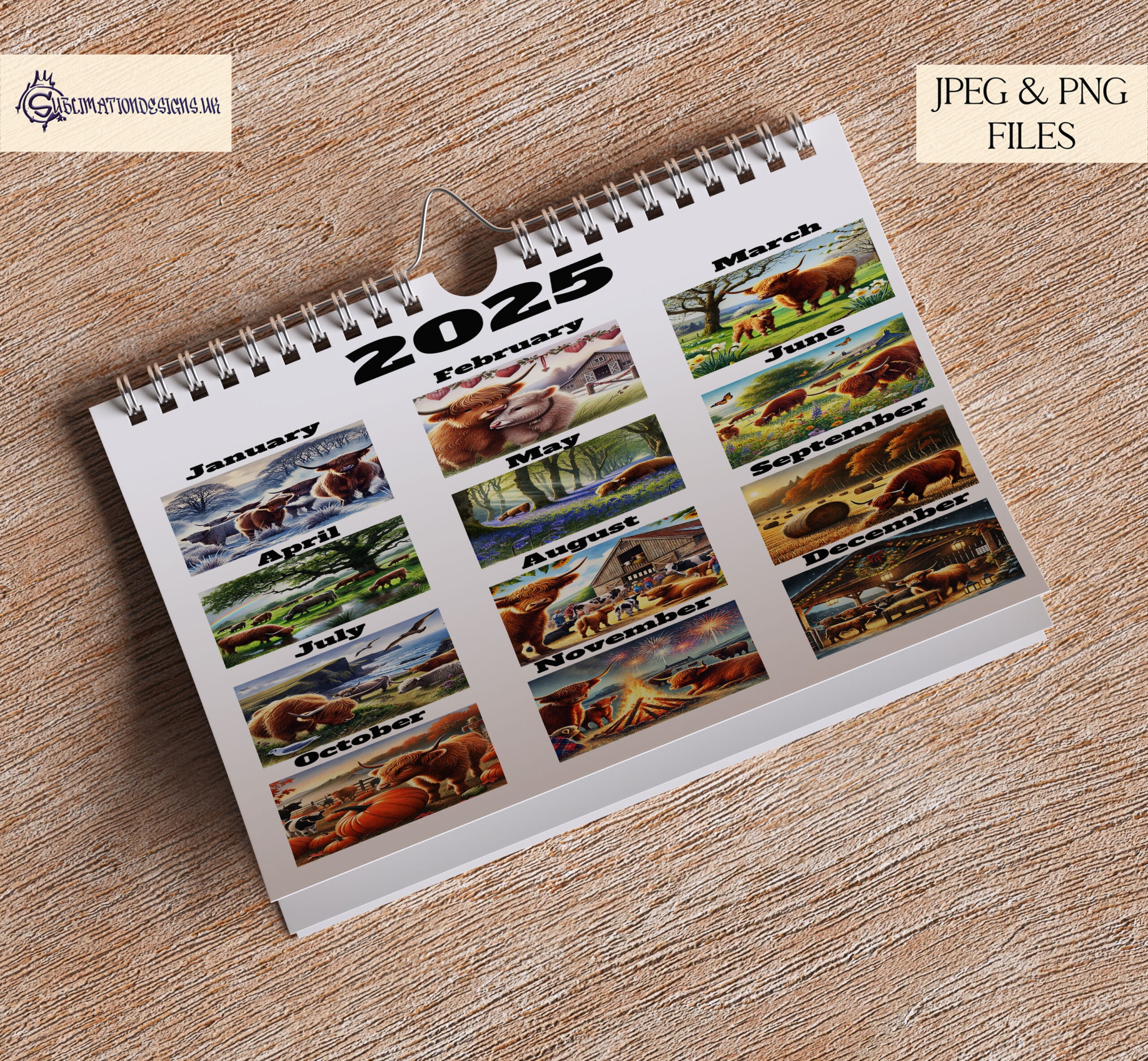 12 Months of Highland Cows Design Set – Rustic Calendar Collection