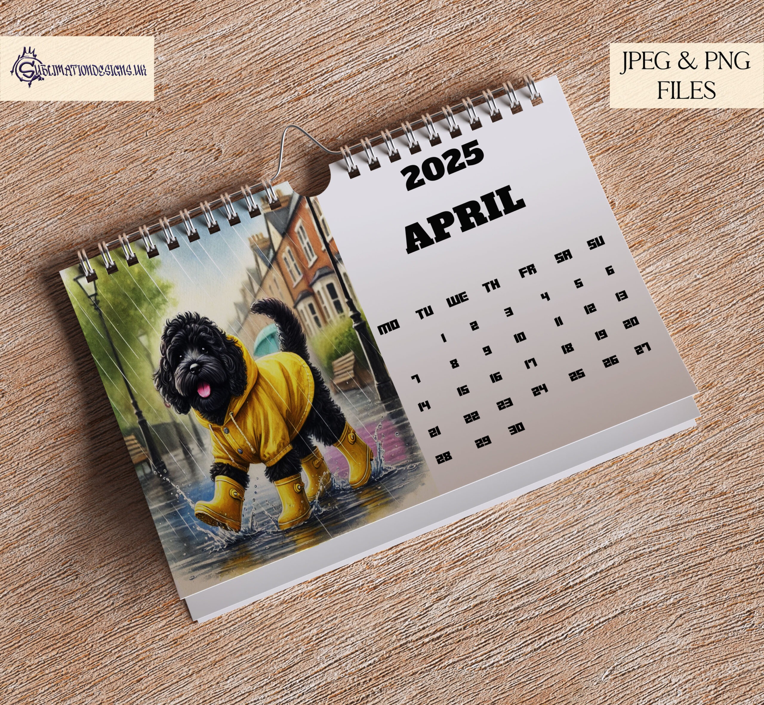 12 individual designs – one for each month, featuring poodle mix dogs in seasonal settings