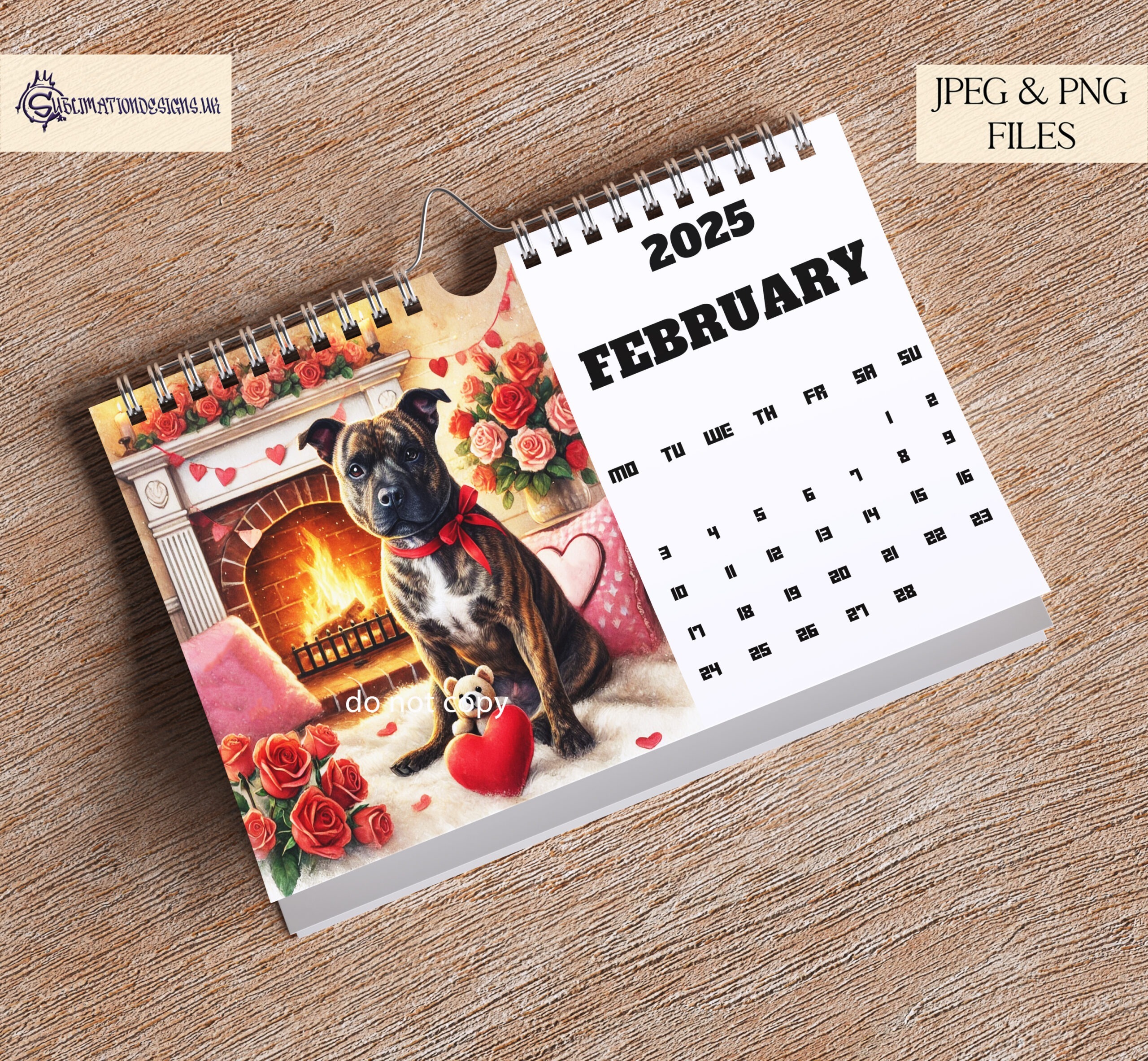 - 12 high-resolution designs featuring Staffordshire Bull Terriers in monthly, seasonal settings