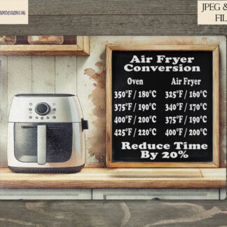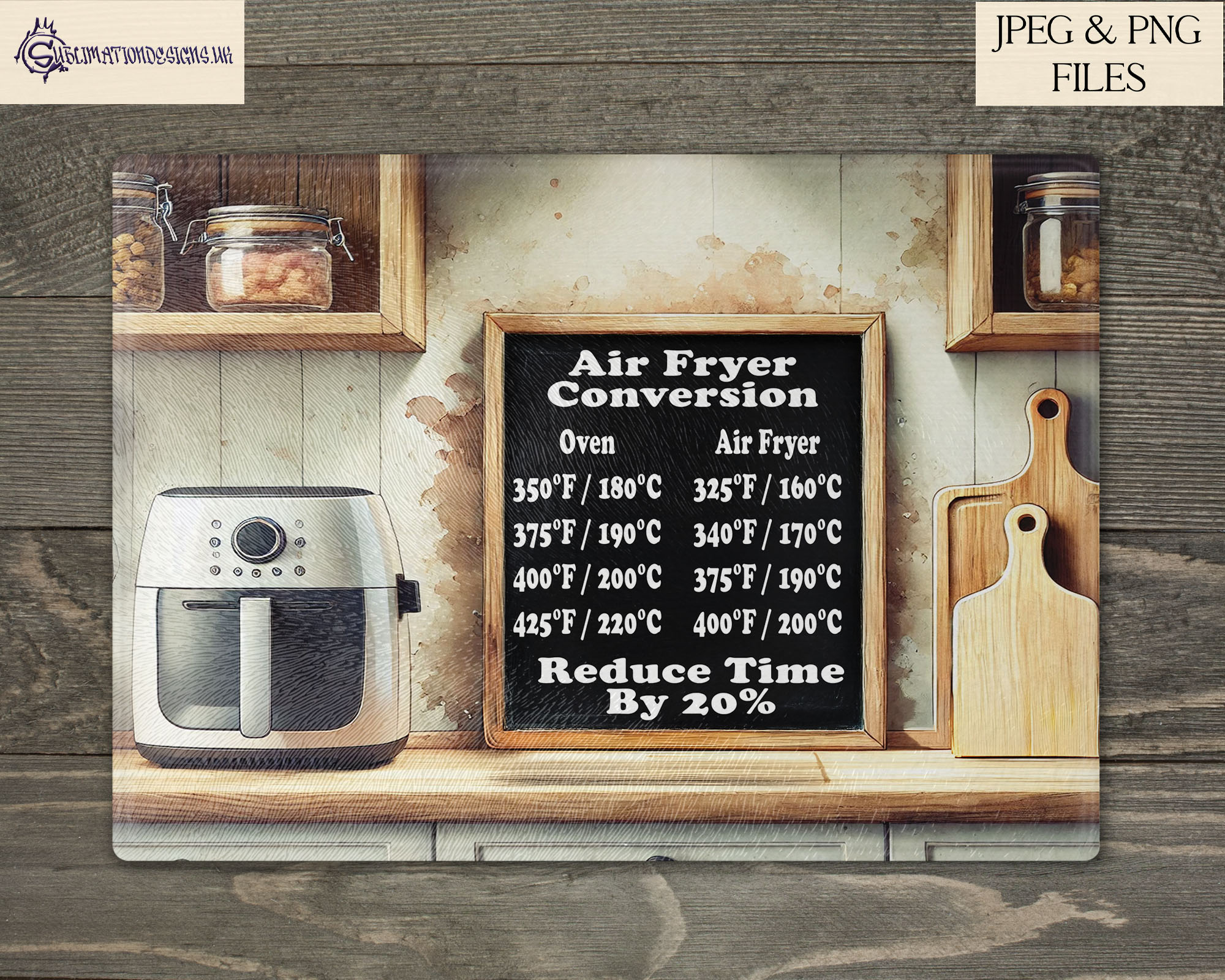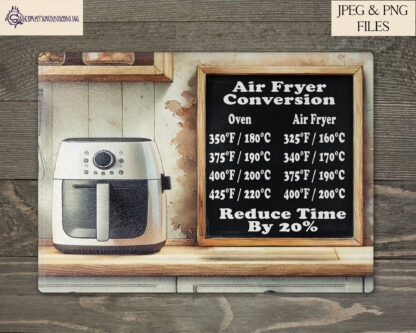 Upgrade your kitchen with the Air Fryer Conversion Chopping Board Design Set, a functional and stylish sublimation set designed to make cooking easier. Featuring a handy air fryer conversion chart, this design set is perfect for kitchen décor, chopping boards, and sublimation projects.