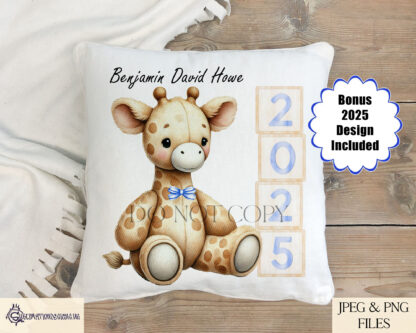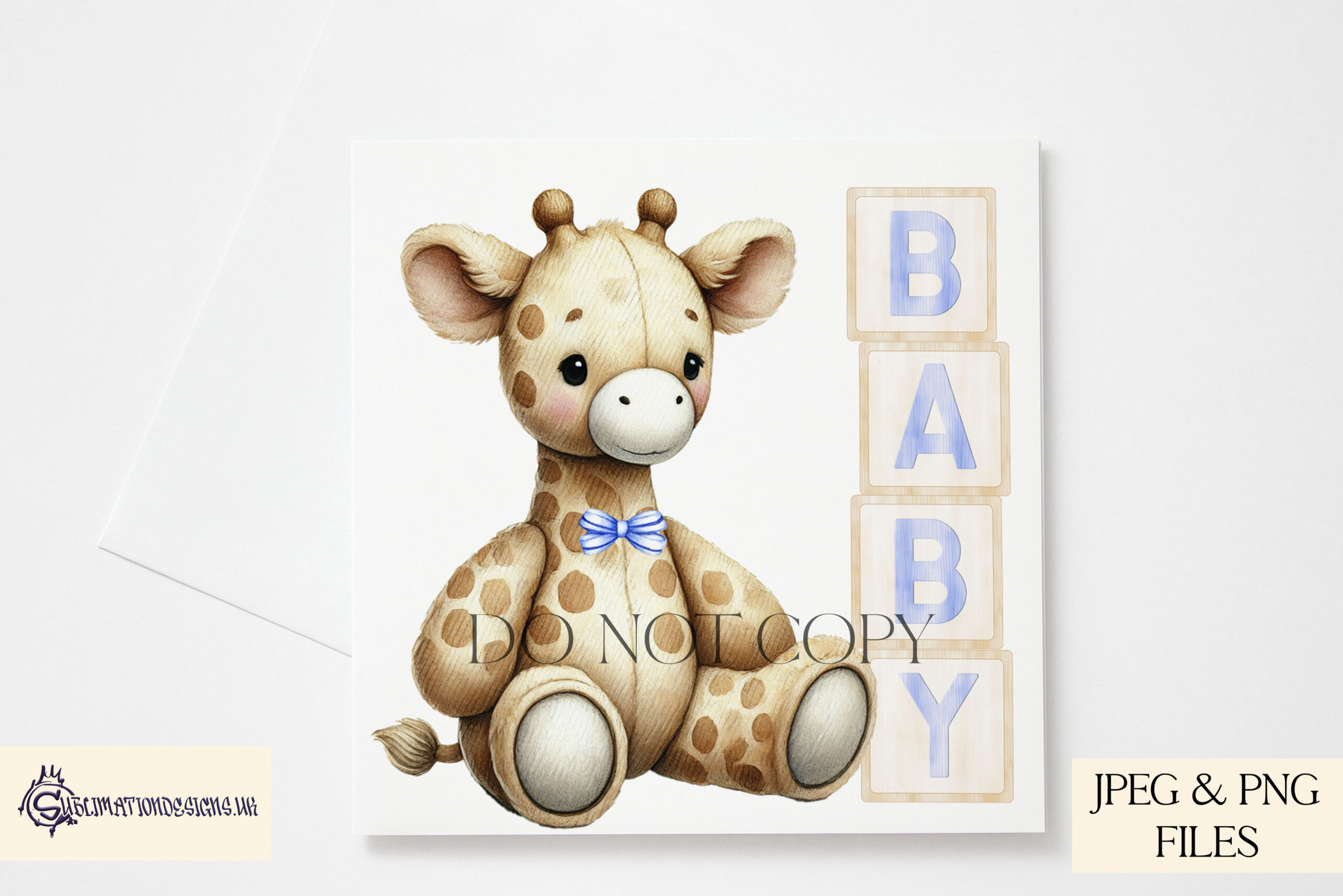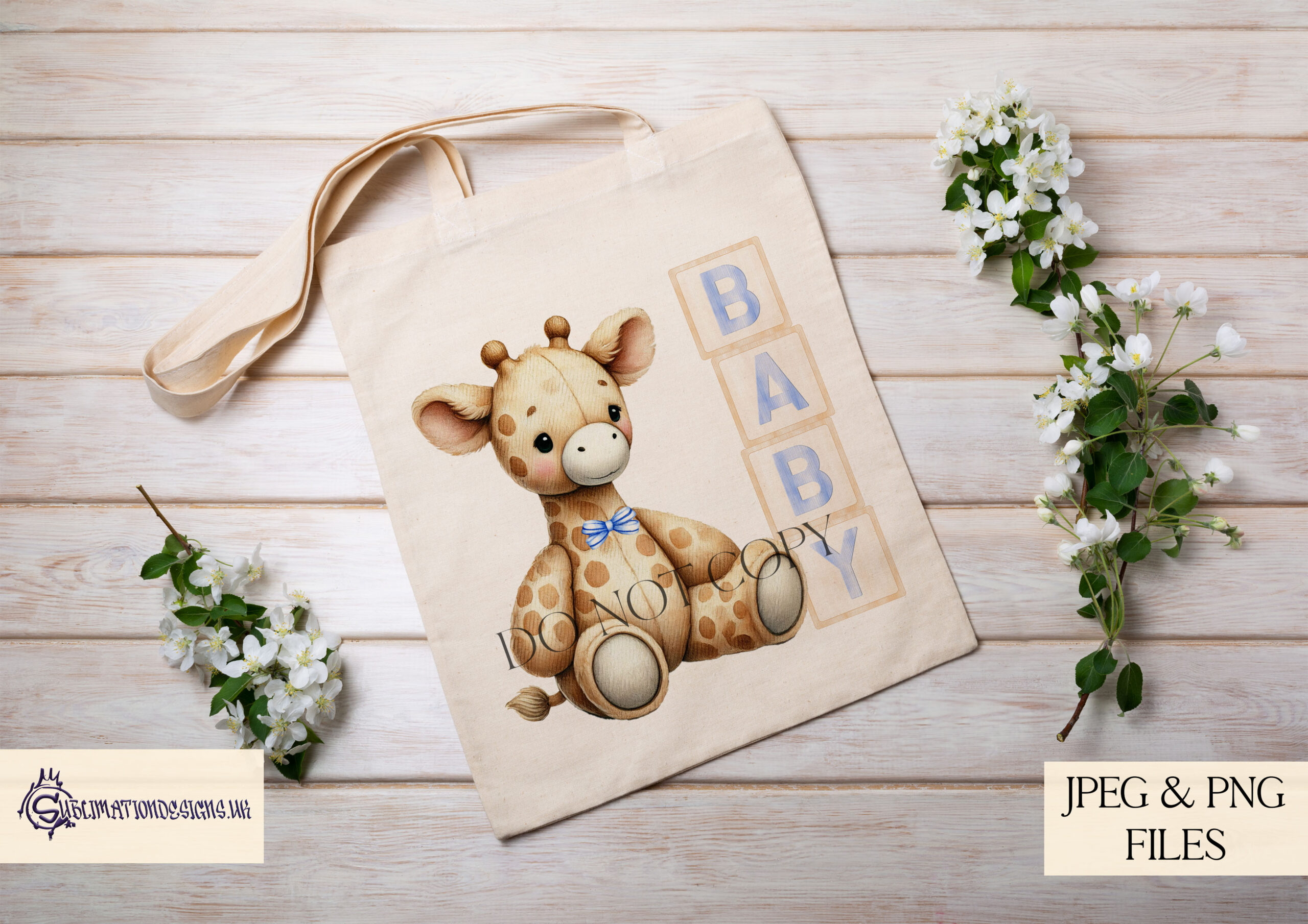 Celebrate new arrivals with our Baby Boy Giraffe Designs Set! This adorable collection features our exclusive artwork of a giraffe seated next to wooden blocks spelling “Baby.” The set includes two variations: one with the giraffe wearing a bow tie and one without. Additionally, we’ve included two bonus designs where the blocks display the year “2025” instead of the word “Baby,” making it perfect for celebrating milestones and keepsakes for this year.
