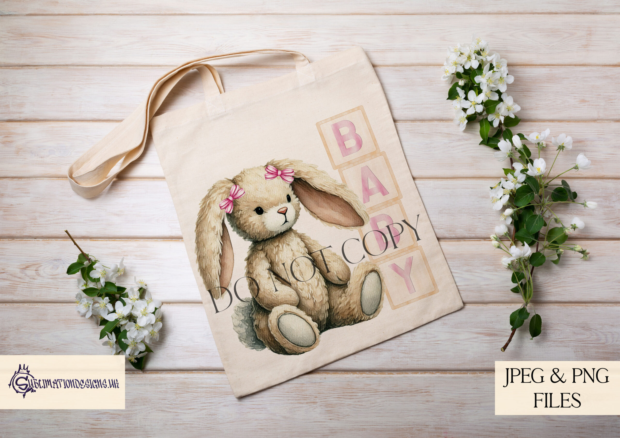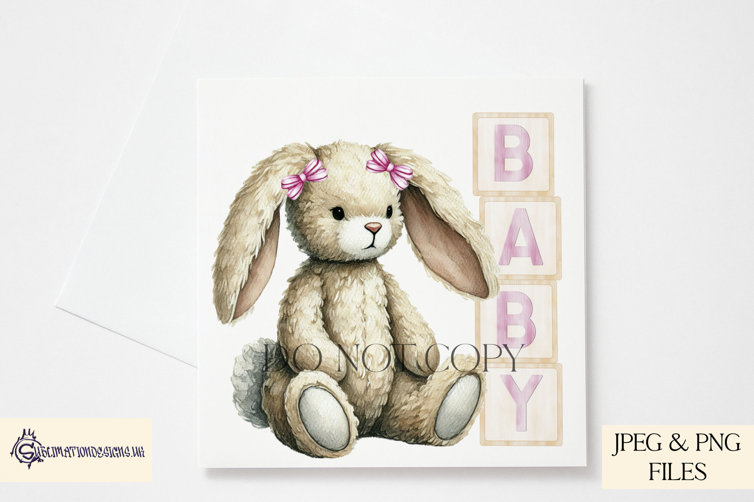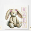 - 1 bunny with pink-themed wooden blocks spelling “Baby” (with and without a bow)