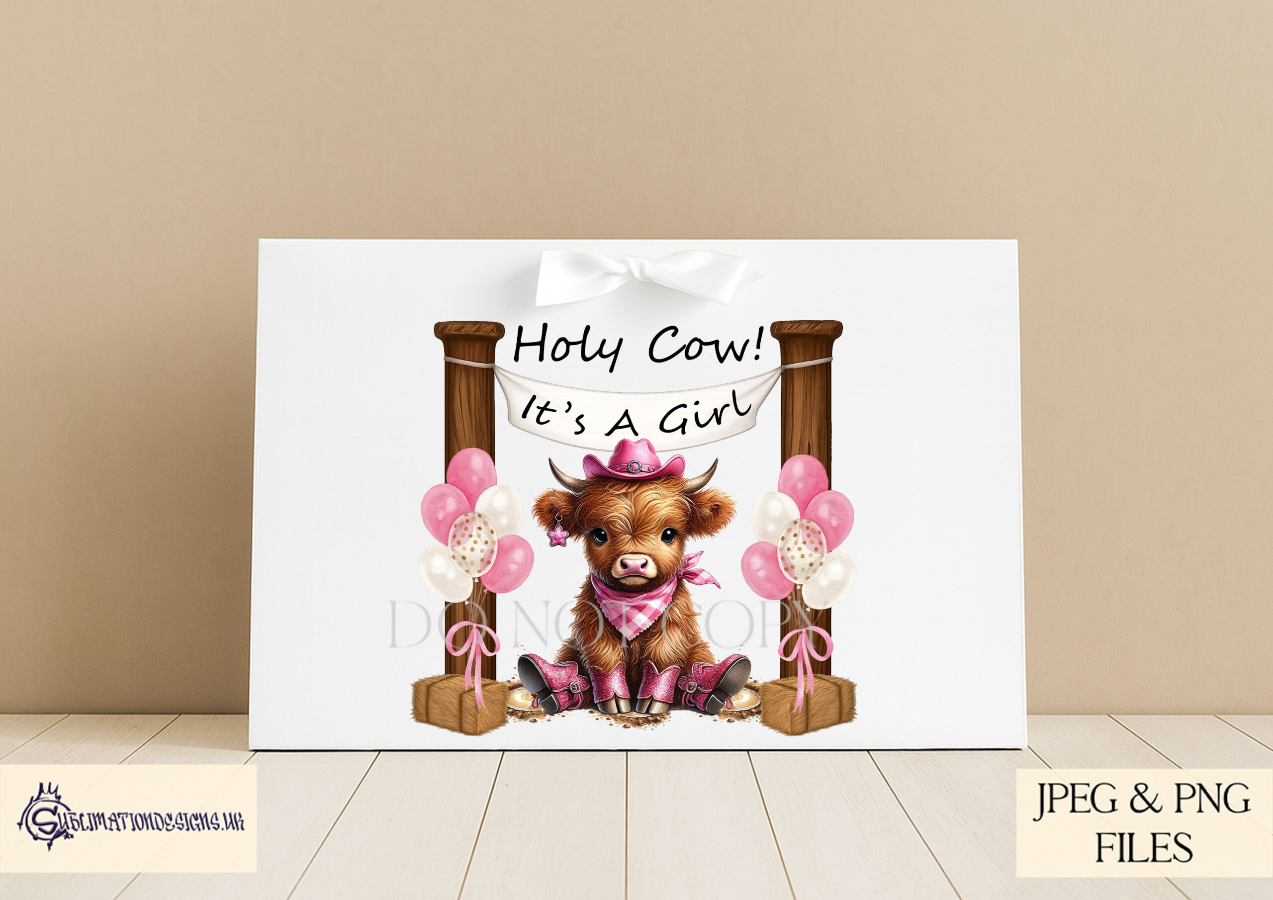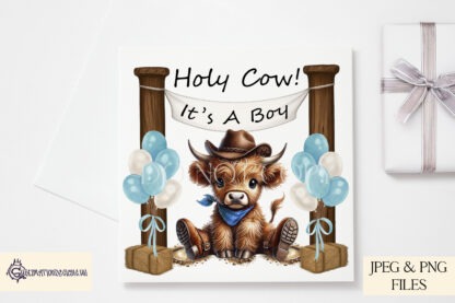 This set includes both a boy and a girl Highland cow, each available in 3 versions: textless, with a blank banner for personalization, and with the fun phrase “Holy Cow! It’s a Boy/Girl”. Ideal for baby shower gifts, nursery décor, or even quirky apparel for the whole family.