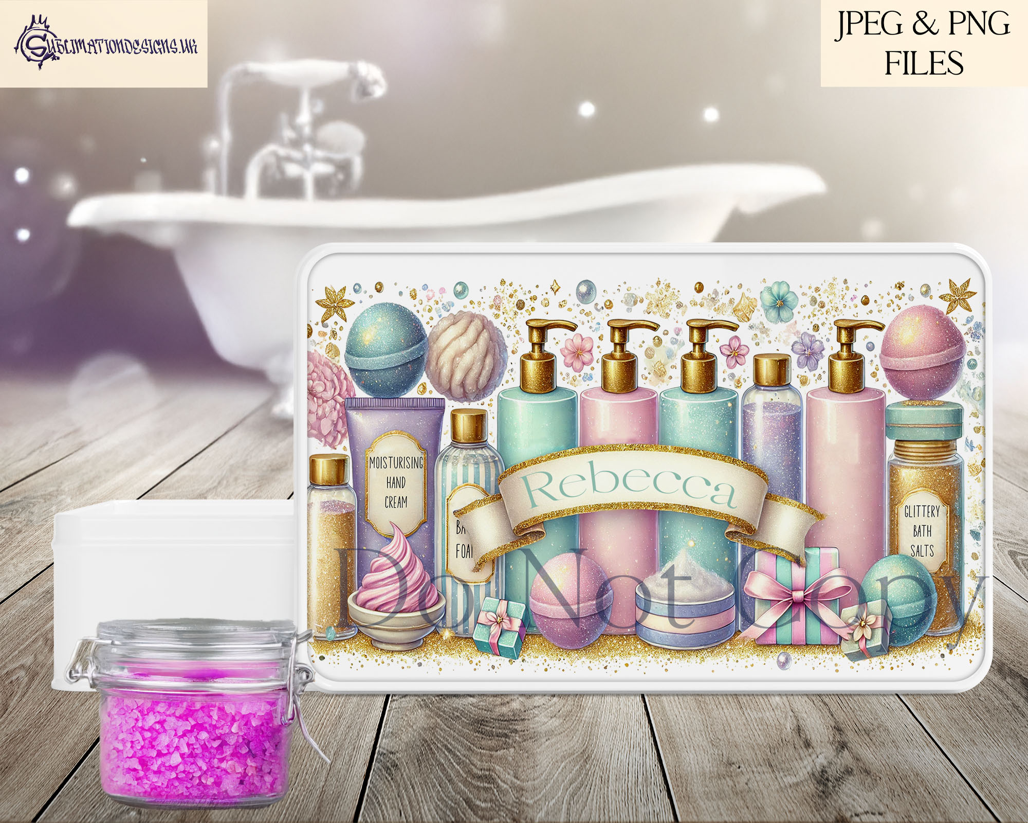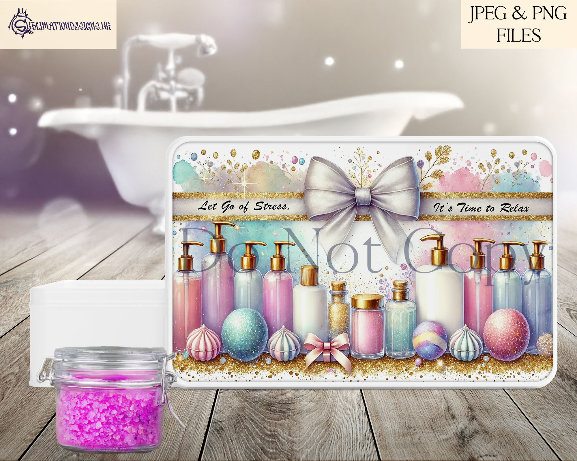 Add a touch of relaxation to your creations with our Bath Time Bliss Design Set! This collection includes 4 stunning designs, perfect for sublimation on tins, wall art, and other personalised products. With 2 pastel and 2 vibrant designs, each offering a ribbon banner for customisation, these versatile templates are ideal for creating unique gifts or decorative pieces.