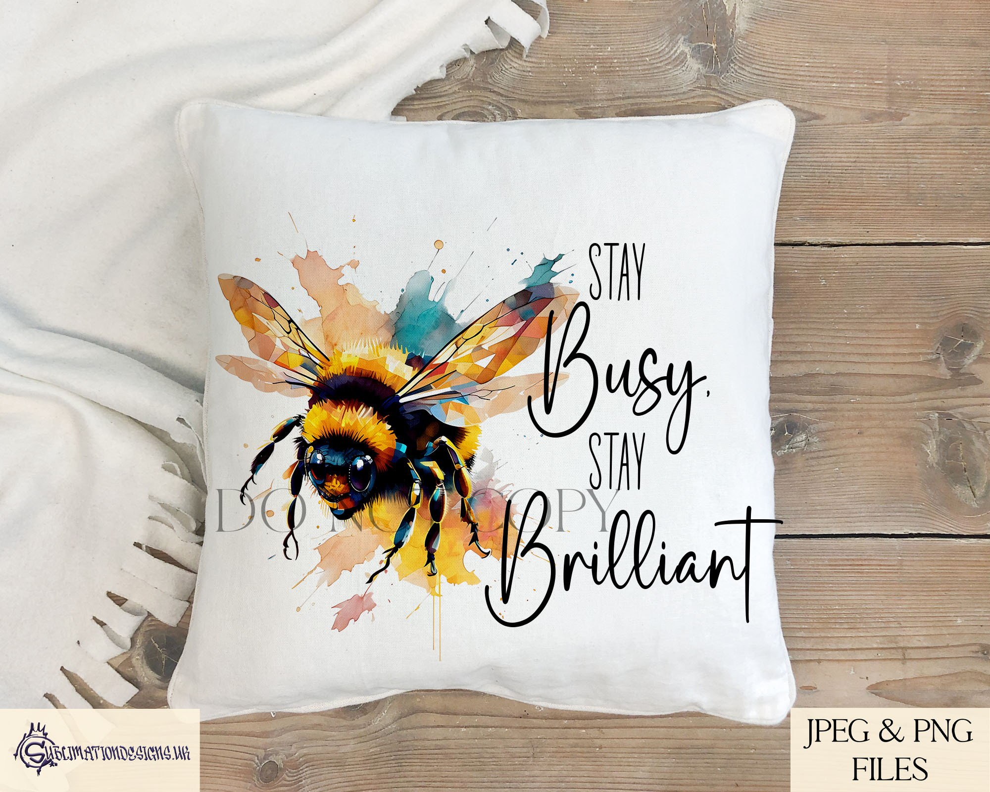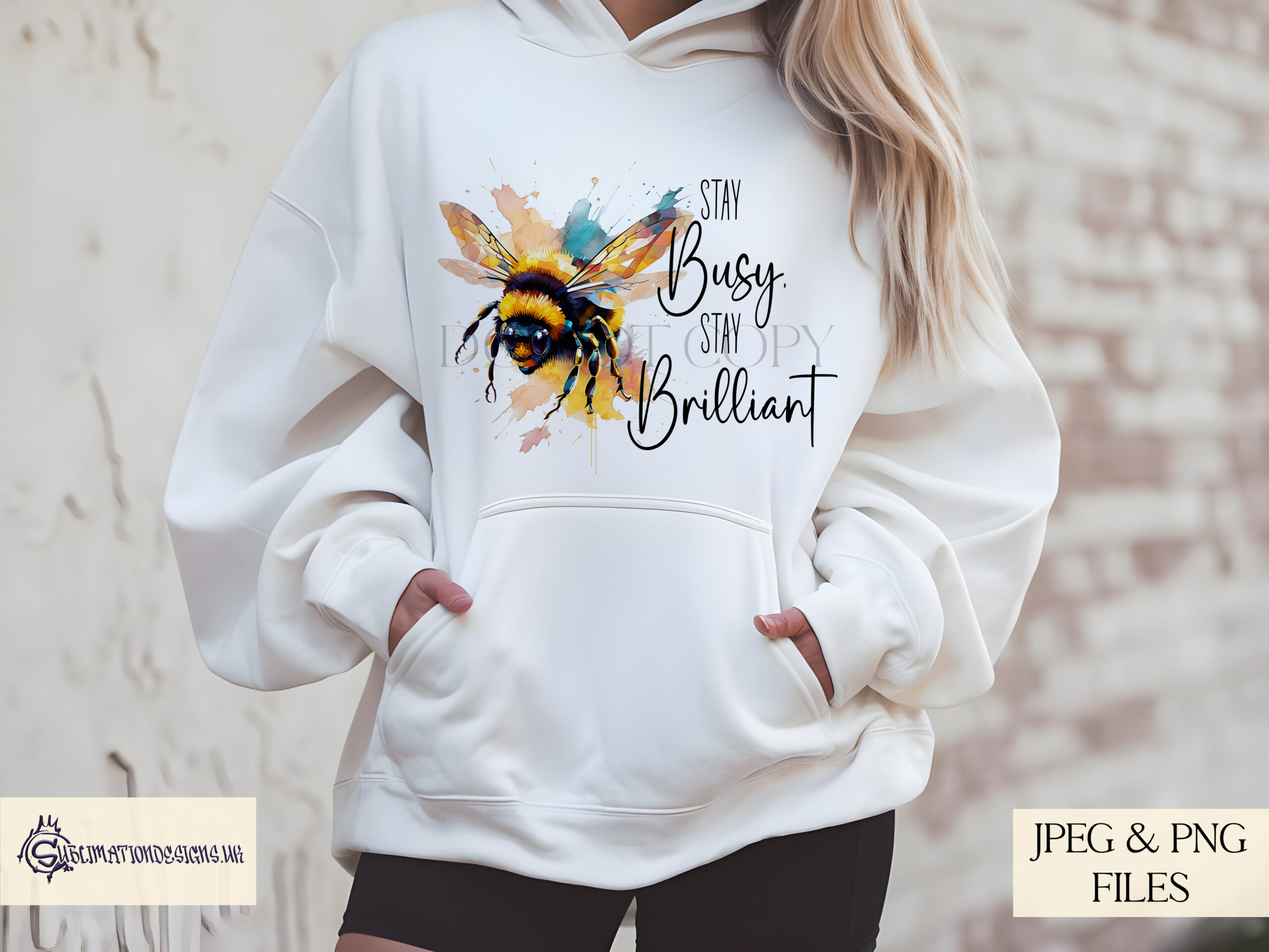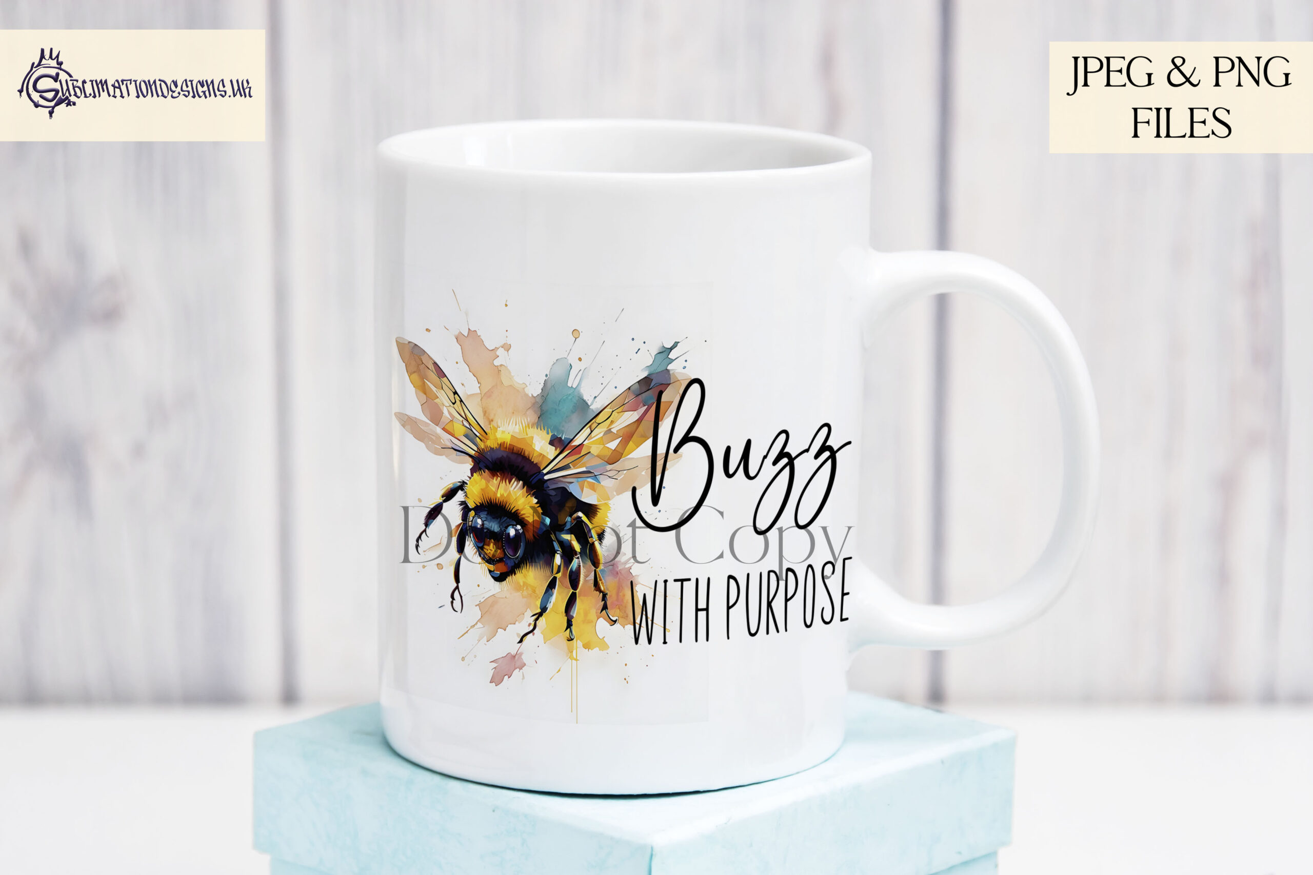 A bold and uplifting Bee Positivity Design Set, featuring a paint-splash bee with two motivational wording options. Includes “Buzz with Purpose” and “Stay Busy, Stay Brilliant”. Ideal for sublimation gifts, personalised keepsakes, and crafting. Comes in JPEG and PNG formats with three mock-ups included.