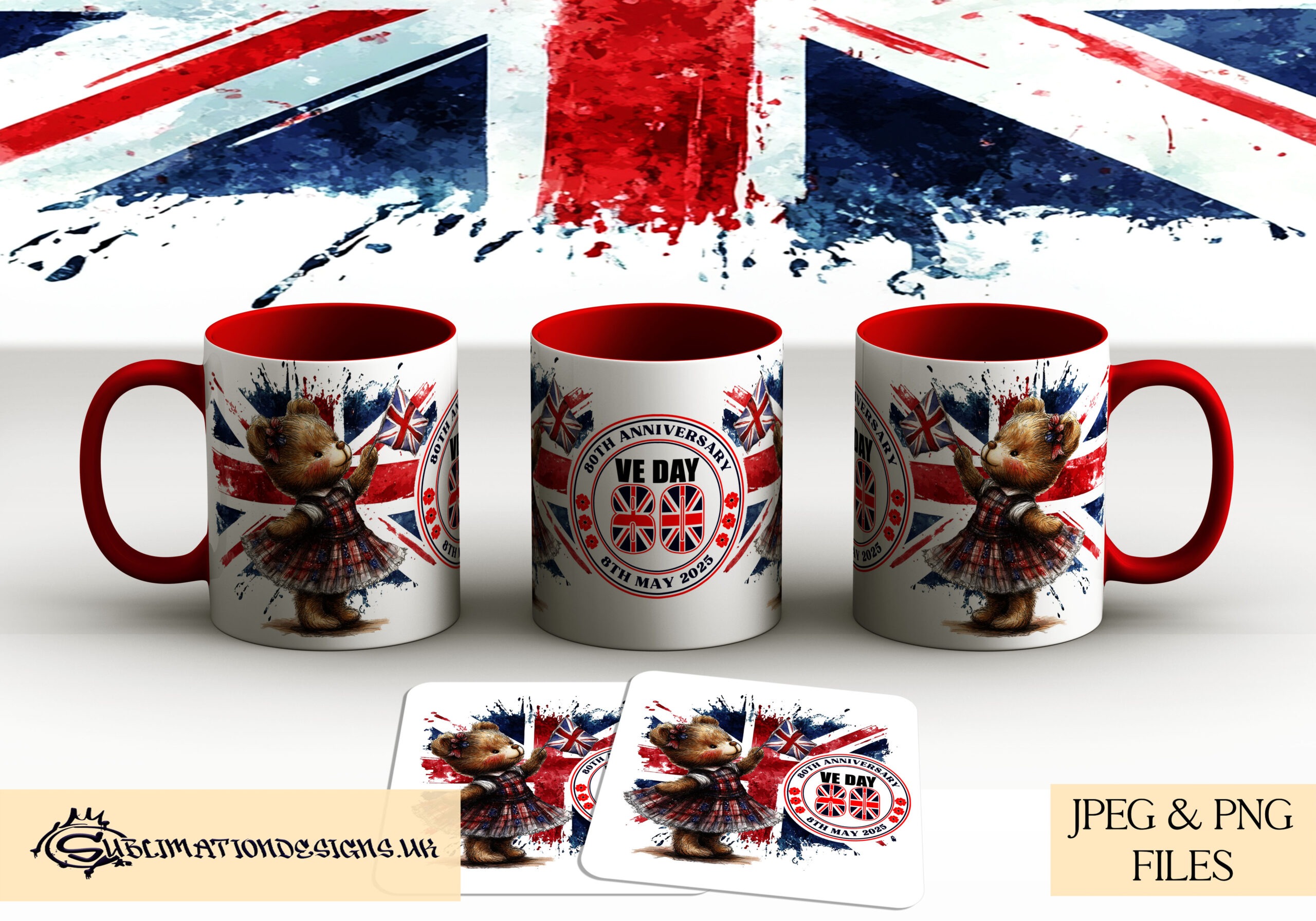 This set is perfect for crafters looking to create unique, commemorative items for VE Day 80. Whether you’re designing mugs, flags, chopping boards, tote bags, or bunting, Betsy Bear is a heart-warming, family-friendly design to honour the occasion. The pack includes five beautifully composed designs – two mug wraps, two resizable square designs featuring the VE Day 80 emblem, and one striking textless version of Betsy Bear standing proudly against a Union Jack backdrop.