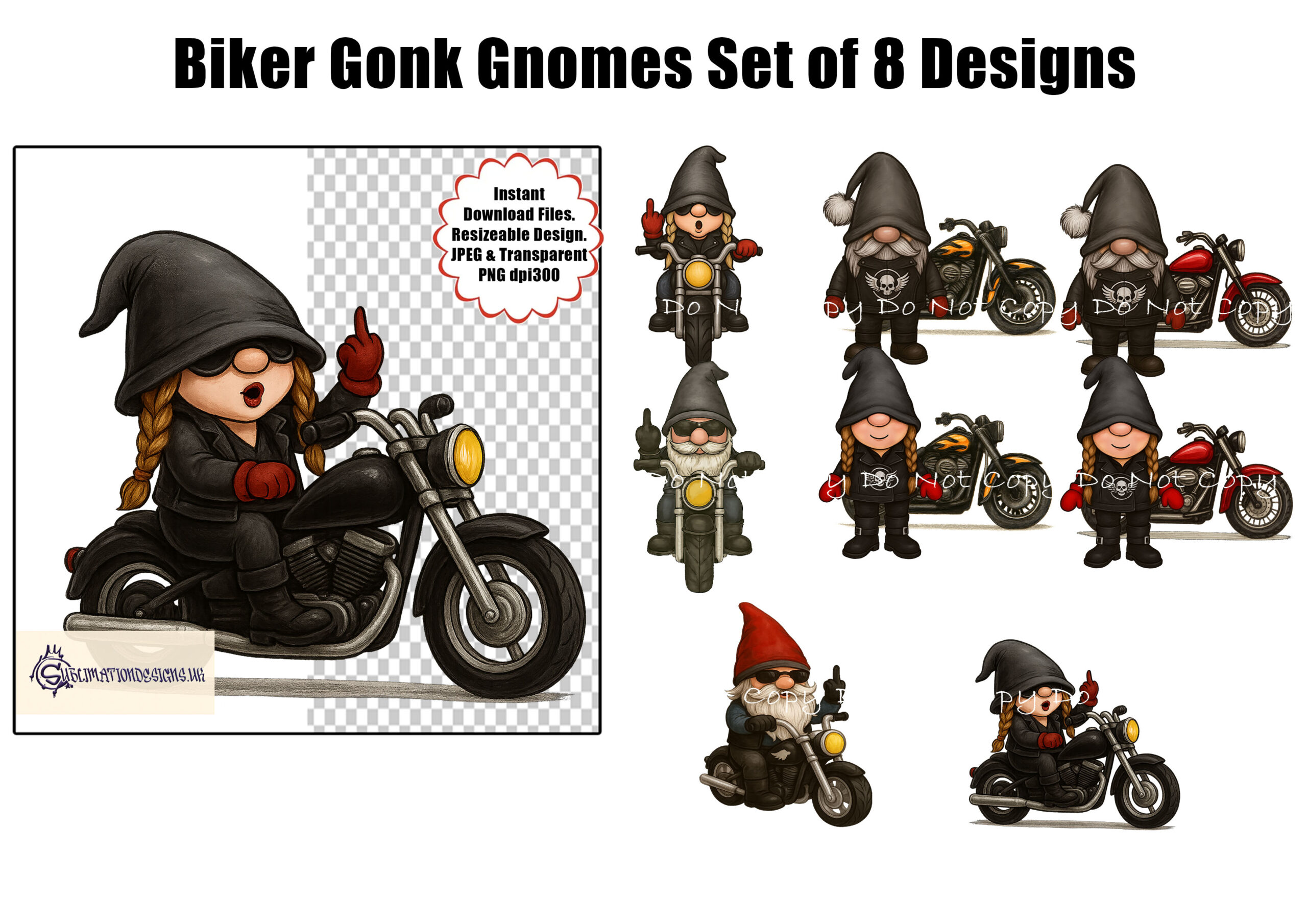 8 designs of biker gonk gnomes with motorbikes, including cheeky middle finger versions. Perfect for novelty gifts, mugs, and t-shirts. Comes with 3 mock-ups and a commercial licence.