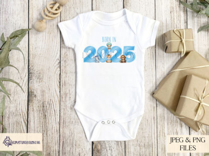 This Born in 2025 Safari Animal Design Set includes 2 designs in blue and pink themes featuring safari animals. Perfect for baby grows, cards, and nursery décor. Includes JPEG and PNG files with 4 mock-up images. Create up to 500 physical products with instant digital download.