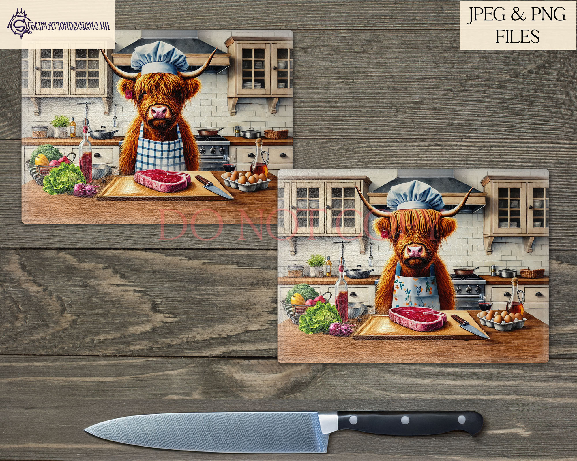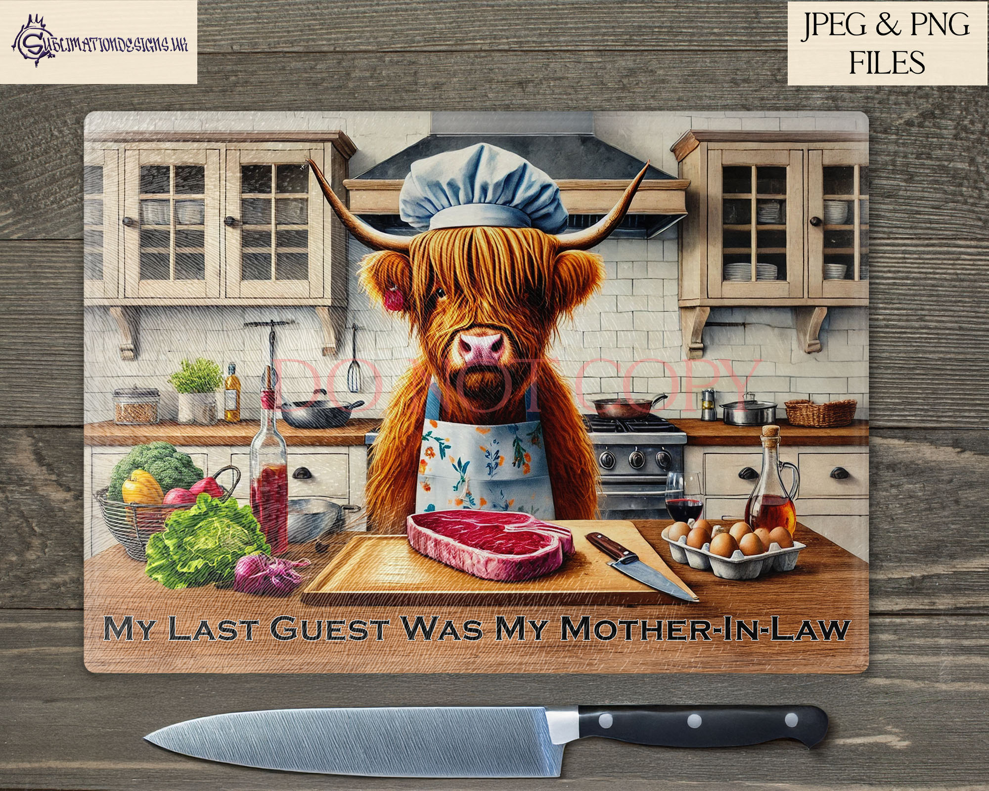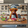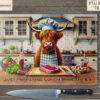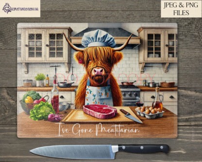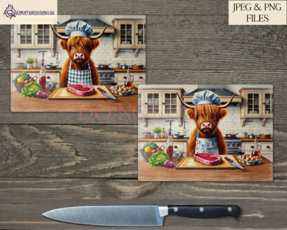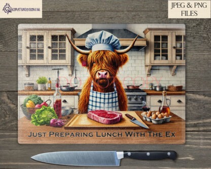Add a dash of dark humour to your kitchen décor with our Cannibal Highland Cow Kitchen Comedy Design Set. This unique collection features two hilarious designs of male and female Highland cow chefs preparing steaks in a kitchen. Each design comes textless and with two pre-written humorous quotes: “Just Preparing Lunch With My Ex” and “The Last Guest Was My Mother-In-Law.” Perfect for adding a comedic twist to chopping boards, kitchen prints, and more, this set also allows you to add your own funny quotes for a personalised touch.