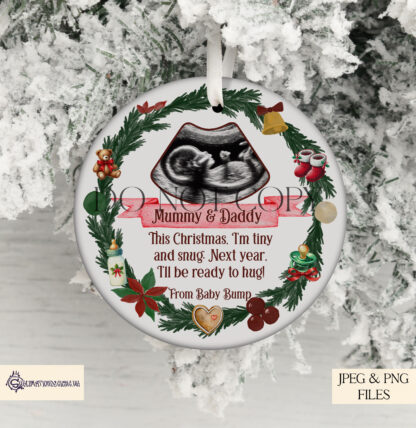 Celebrate the anticipation of a new arrival this holiday season with our Christmas Baby Scan Image Design Set! This delightful collection features a festive wreath adorned with baby items like a bottle, teddy, and booties, with a space to insert a baby scan image. Ideal for creating personalised baubles and keepsakes, this set includes four colour options (red, green, blue, and pink) and several text and customisable options, making it the perfect addition to your Christmas décor.