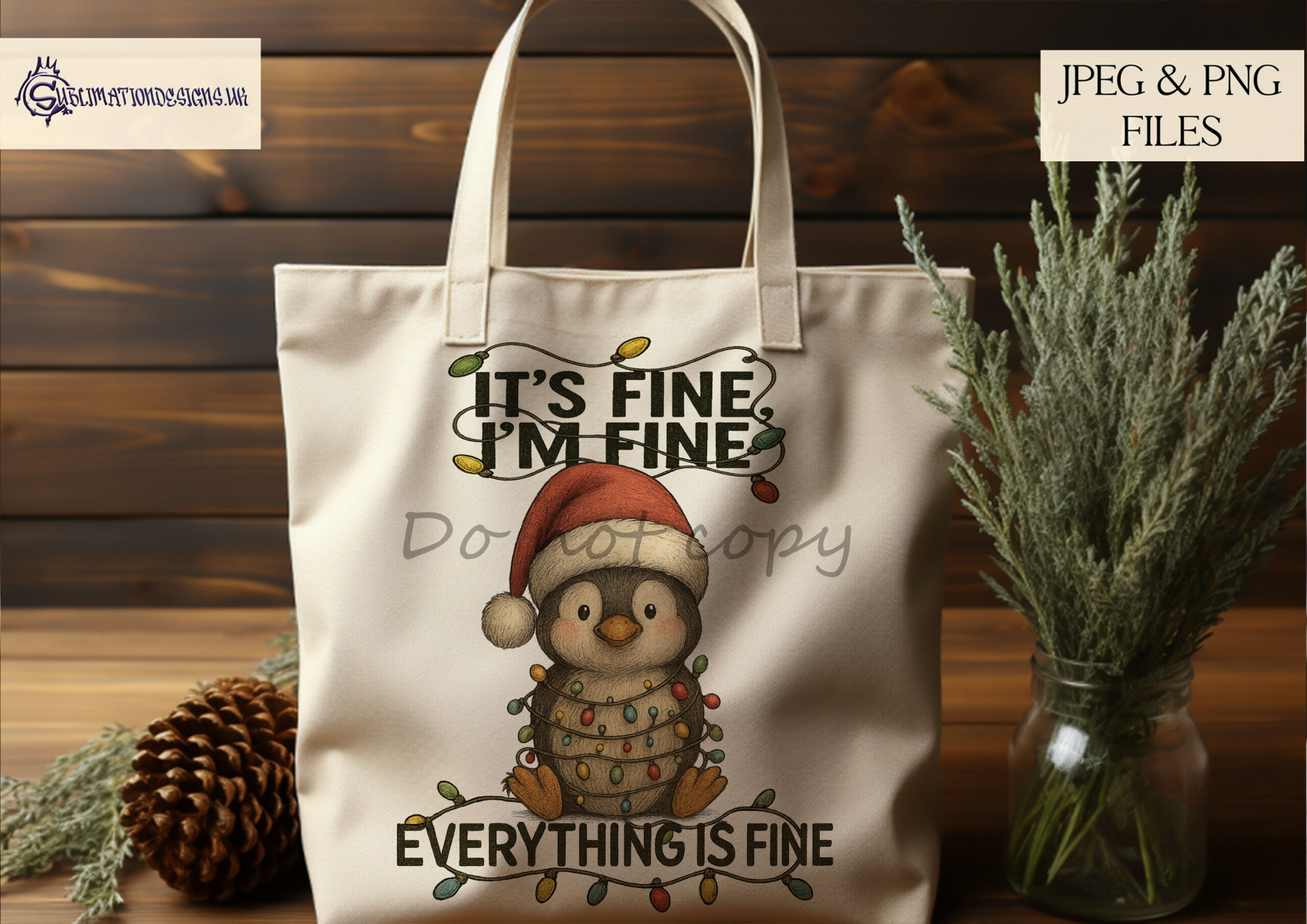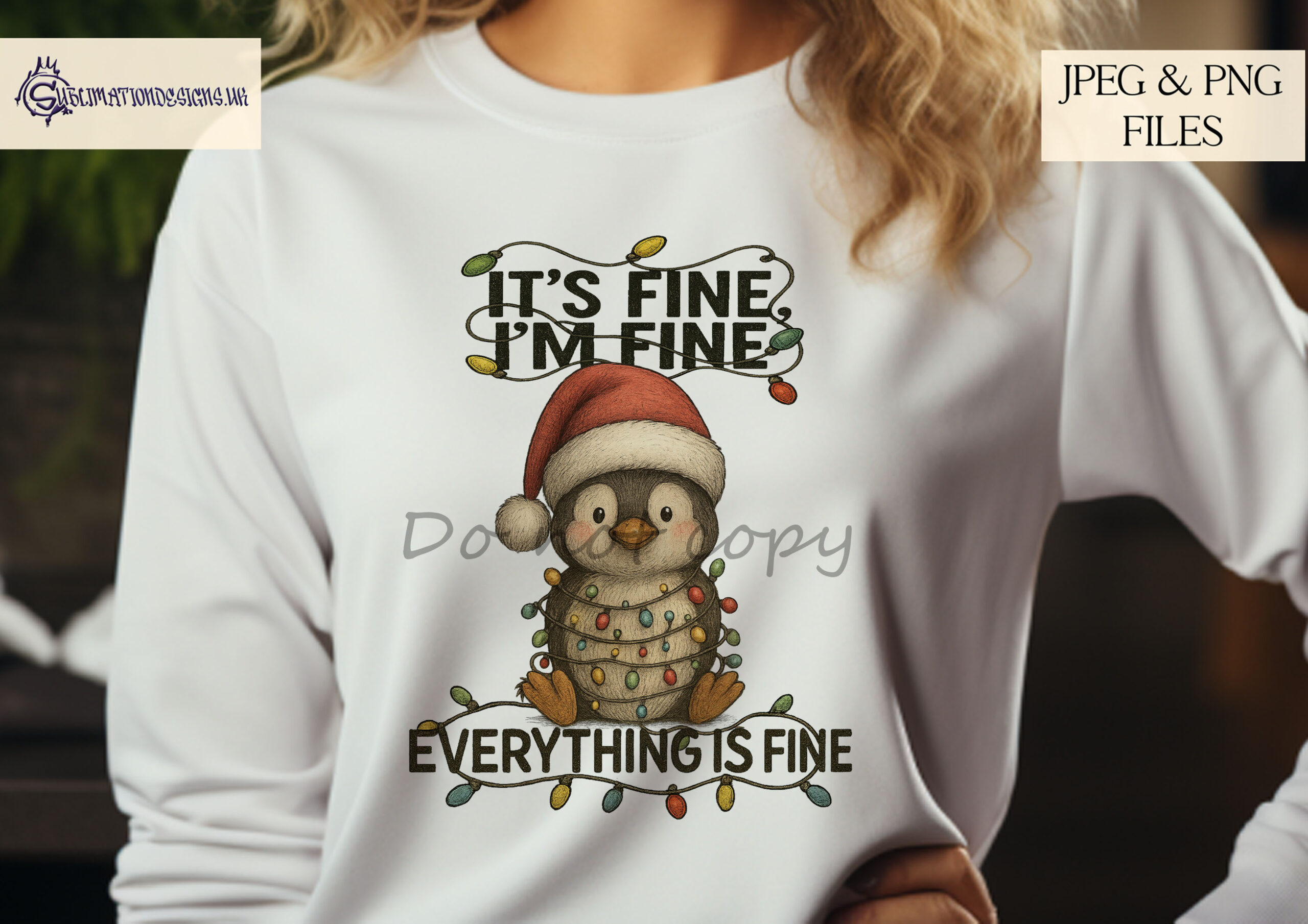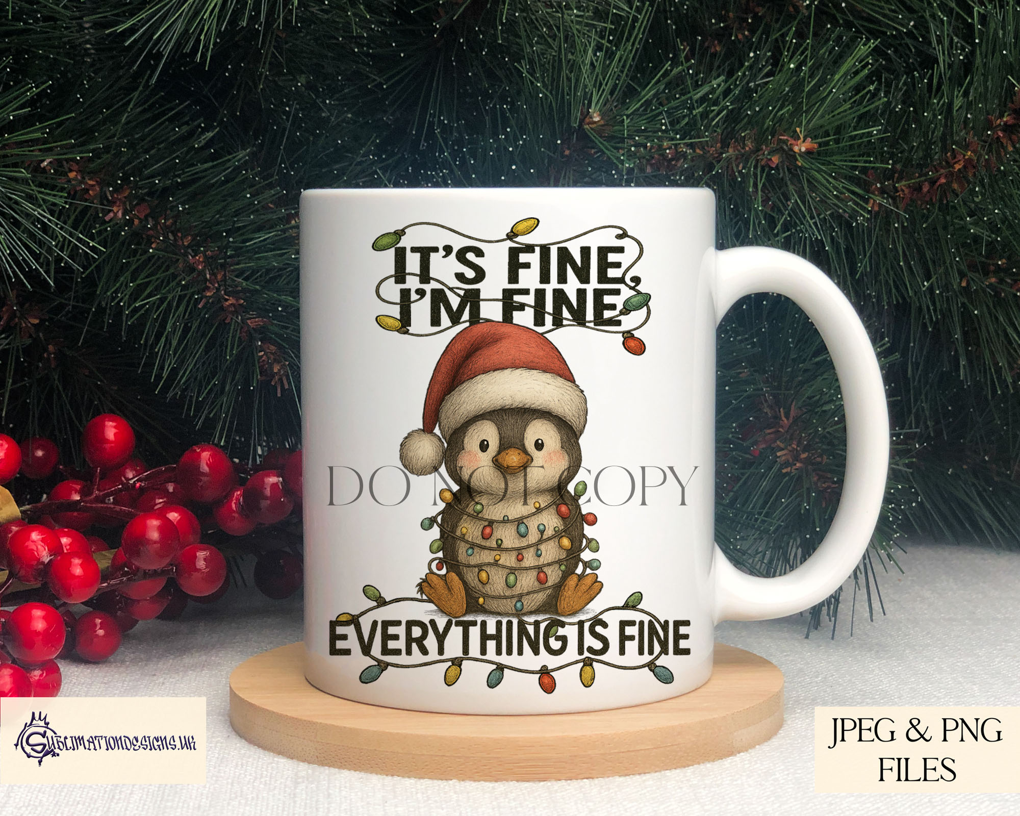 Add festive humour to your Christmas creations with our Christmas Tangled Penguin Designs Set. This fun collection includes 2 variations featuring a penguin tangled up in Christmas lights. One version is textless for easy personalisation, and the other includes the witty phrase “It’s Fine, I’m Fine, Everything is Fine.”