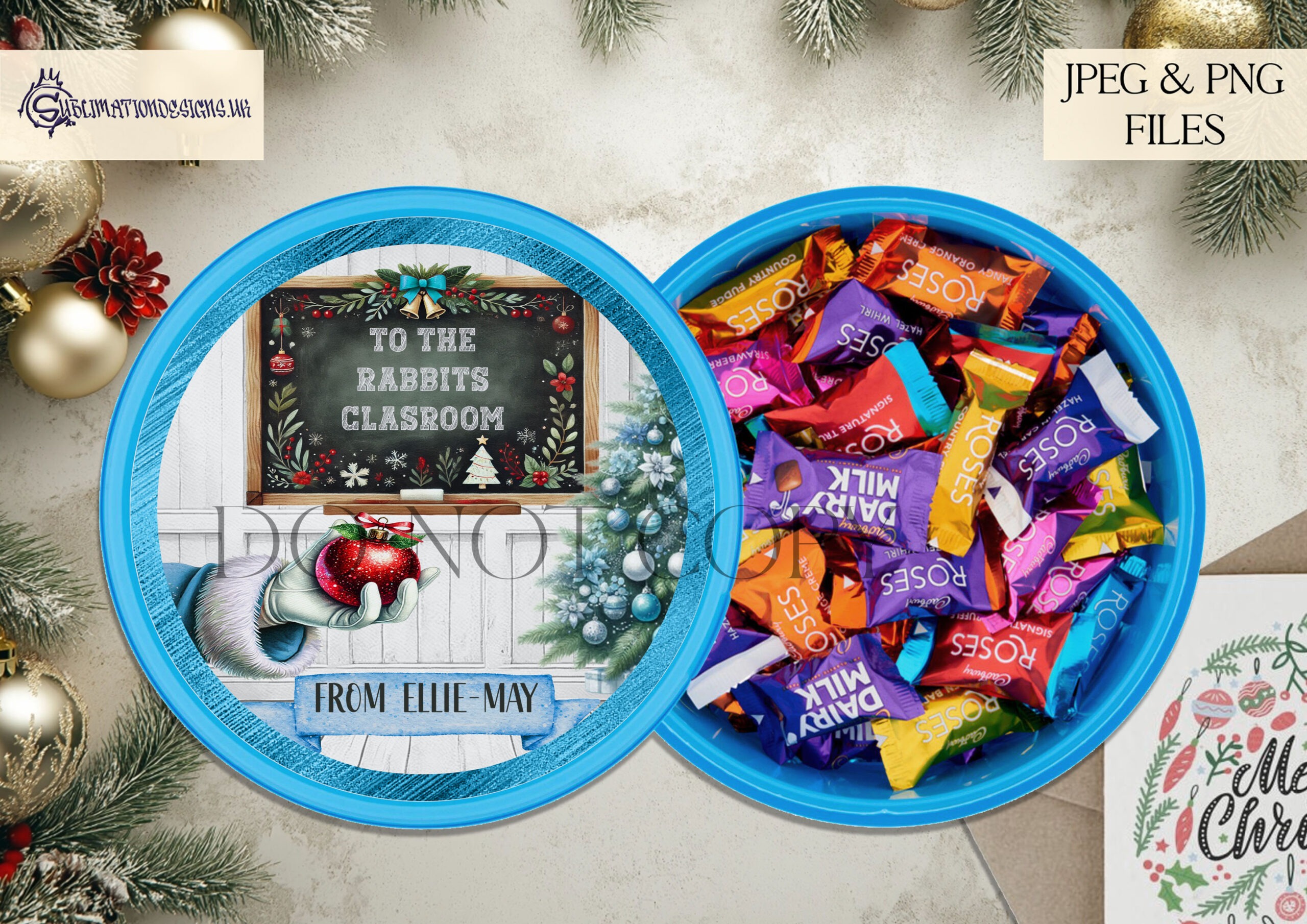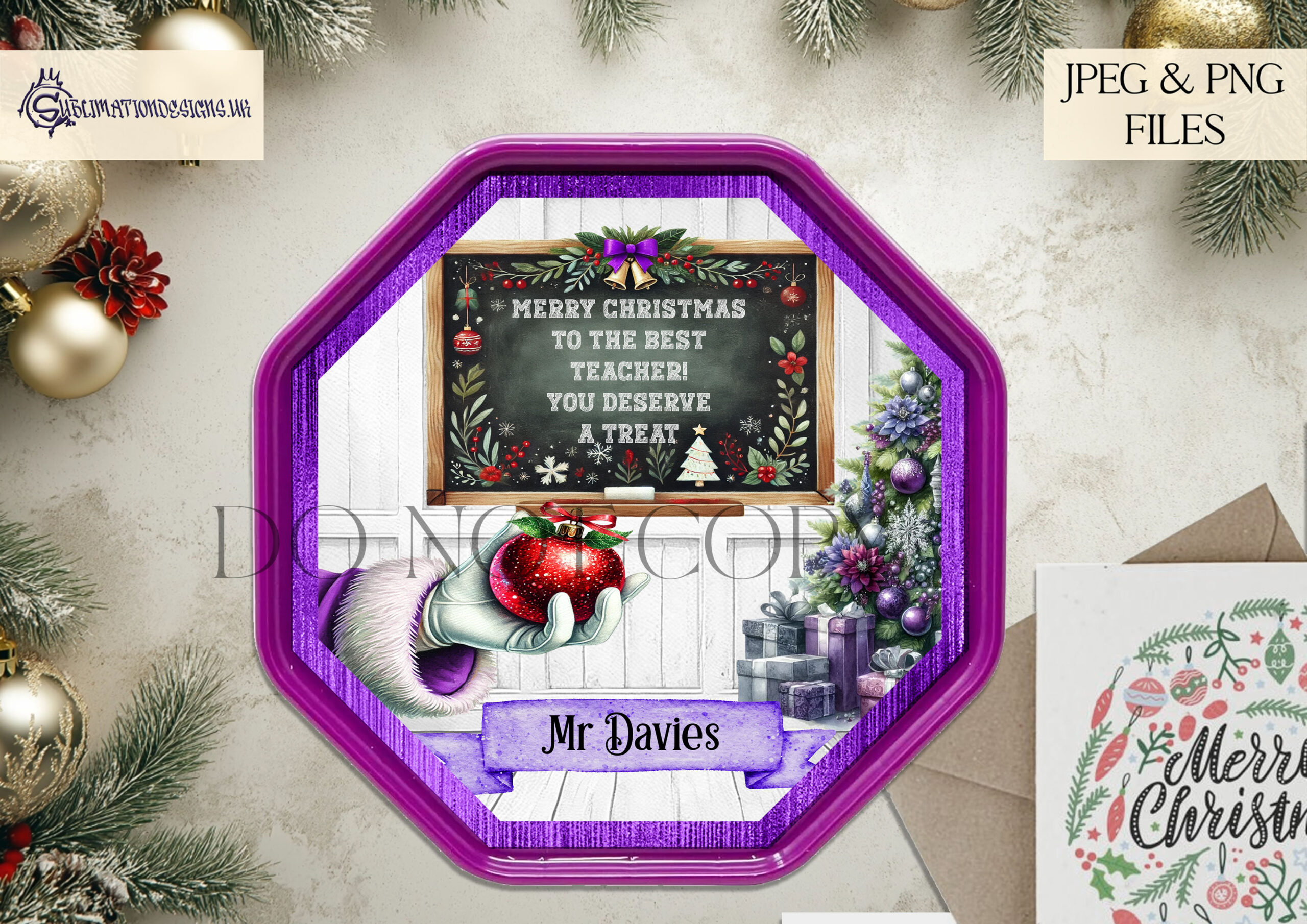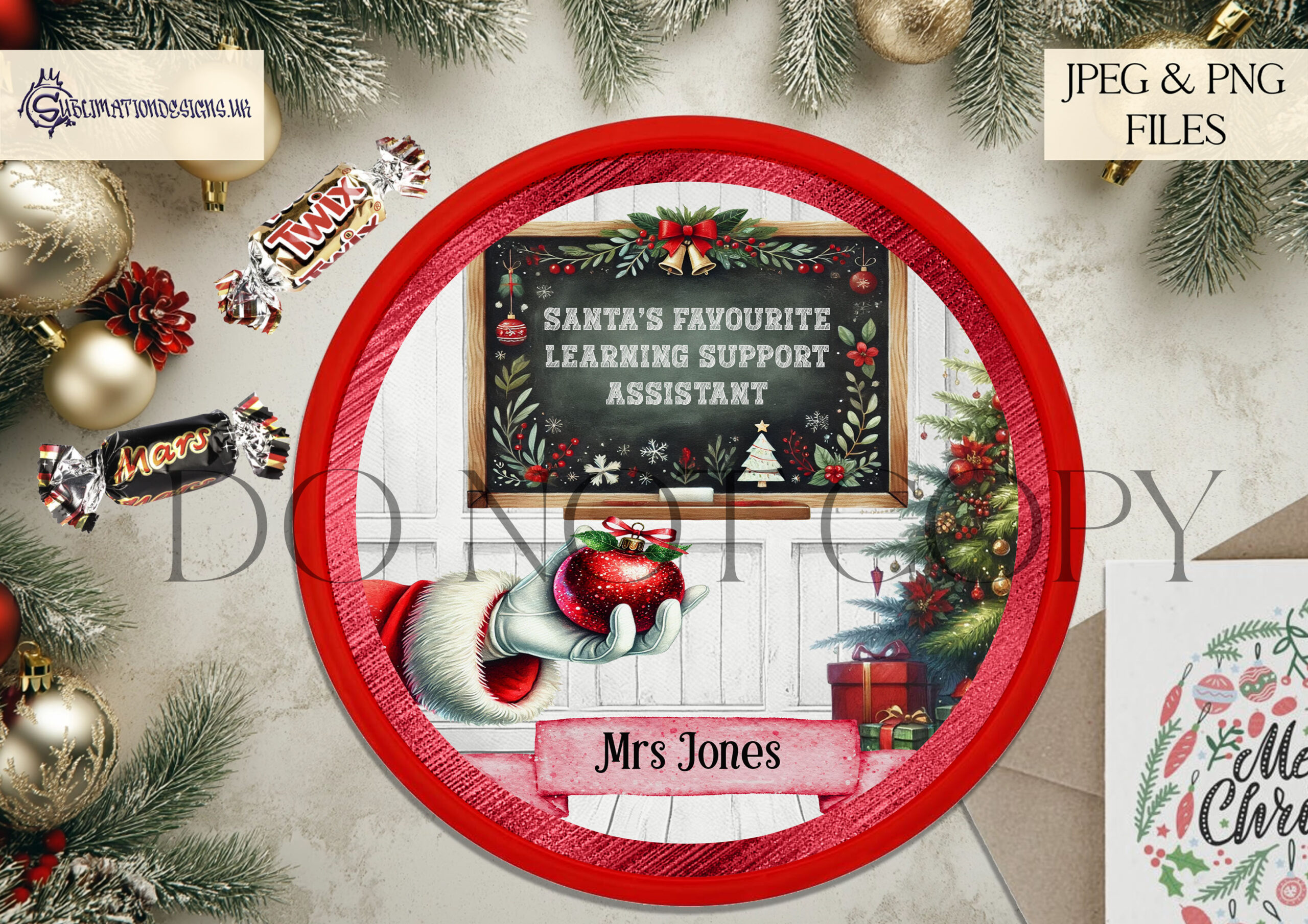 Show appreciation to teachers this holiday season with our Christmas Teacher Tub Topper Design Set! This set includes 4 festive designs in colours matching popular Christmas tubs, featuring Santa holding a bauble shaped like a red apple, along with a textless chalkboard and ribbon, allowing space for personalised messages and names. Perfect for teachers, teaching assistants, LSAs, and more, these toppers make thoughtful, easy-to-personalise gifts.