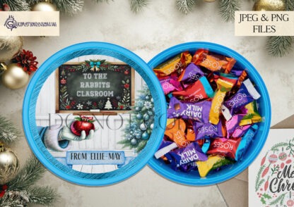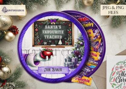 This Christmas Teacher Tub Topper Design Set includes 4 customisable designs matching Heroes, Celebrations, Quality Street, and Roses tubs. Features Santa with a bauble and space for a personalised message. Includes high-resolution JPEG and PNG files with 4 mock-ups. Create up to 500 physical products with instant digital download.