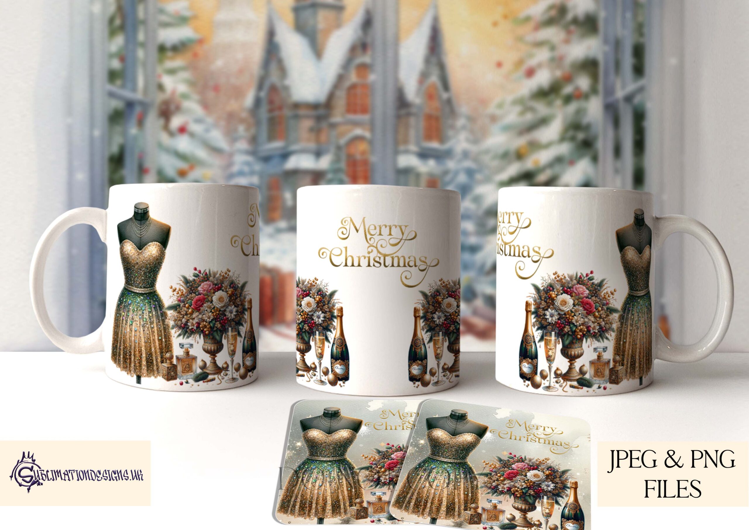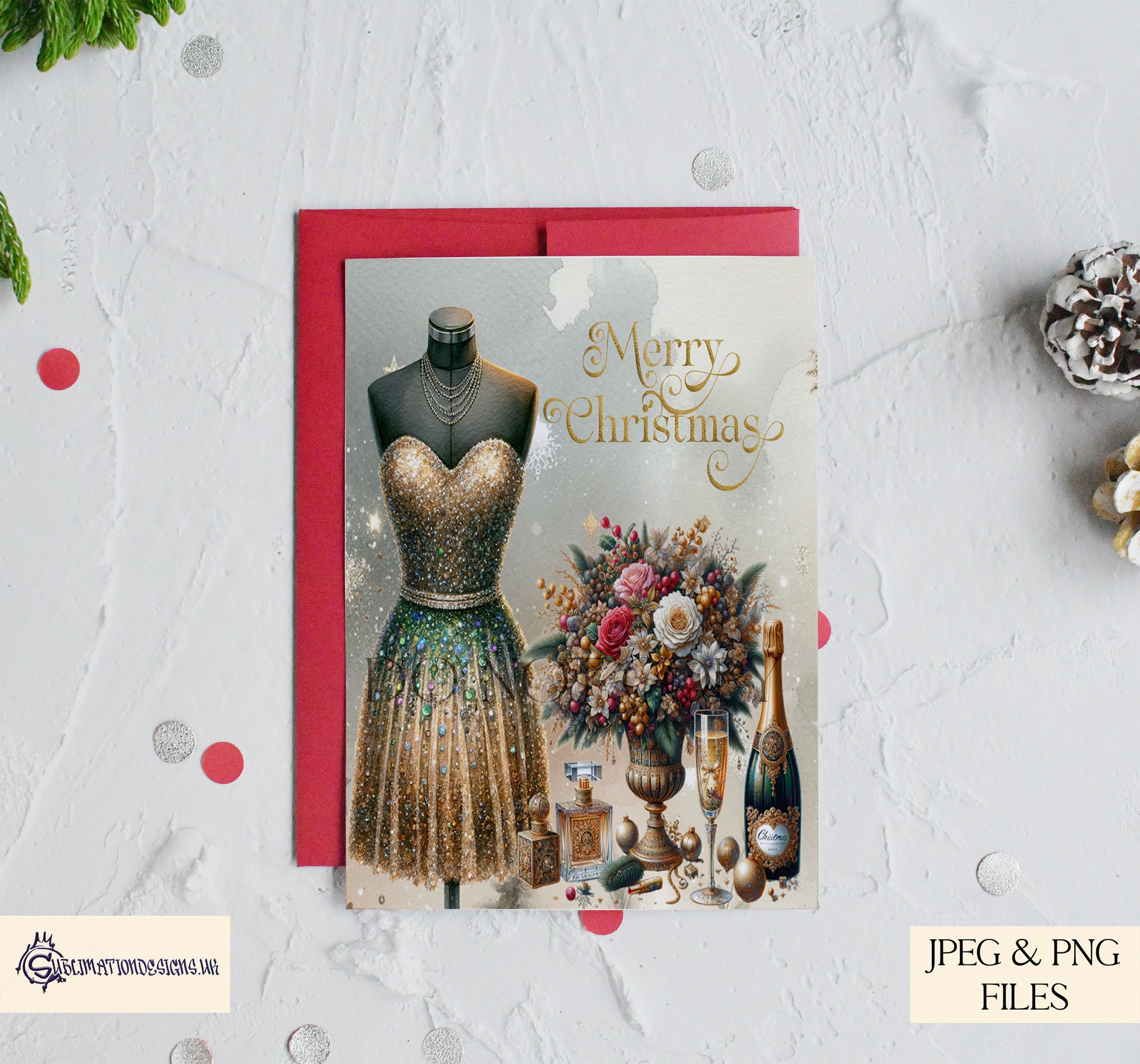The Classy Lady Glitzy Christmas Set features glamorous illustrations of sequined party dresses, champagne, baubles, perfumes and lipsticks. Perfect for chic and stylish holiday projects, this set includes textless options, festive greetings and versatile designs for mugs, bookmarks and more.