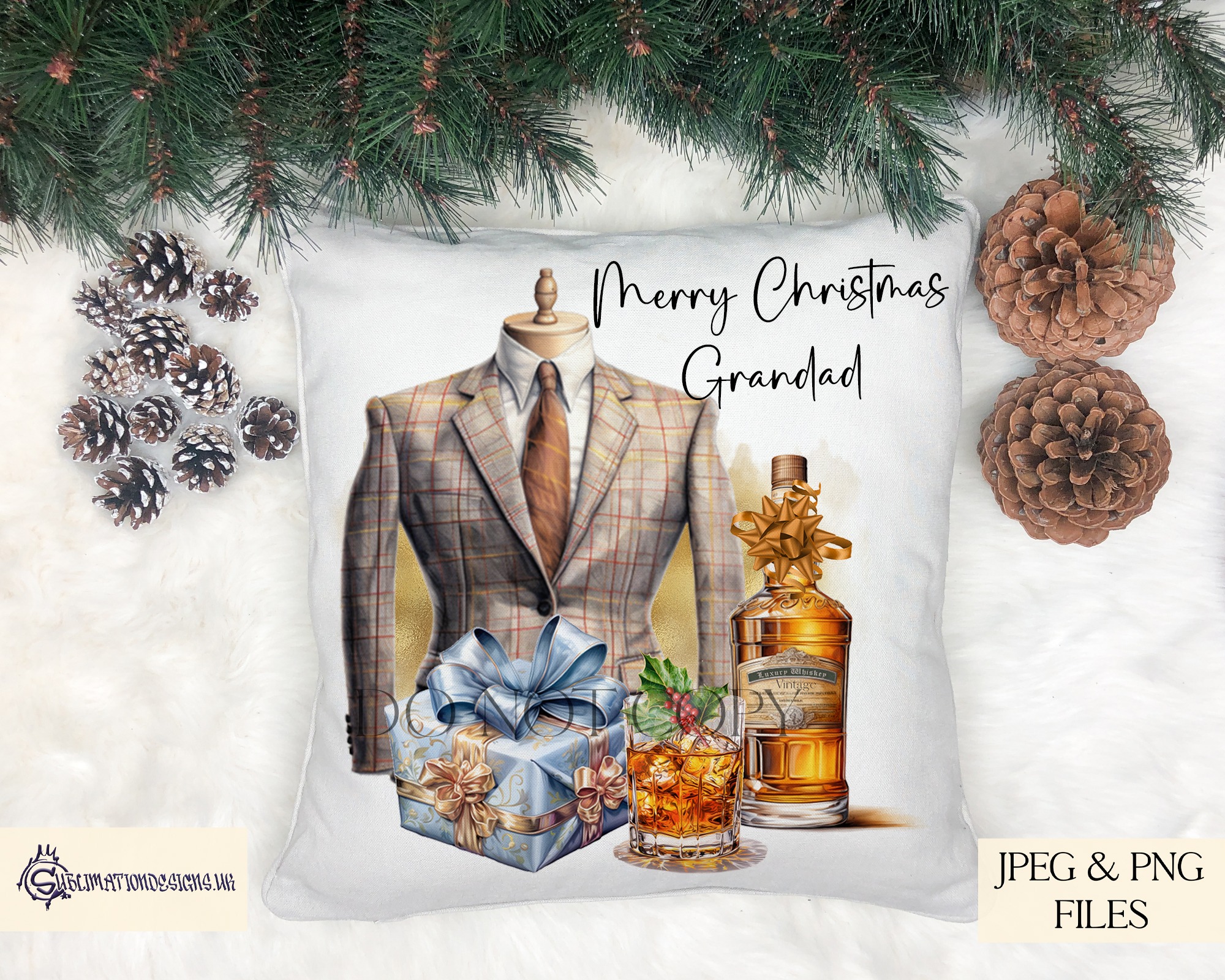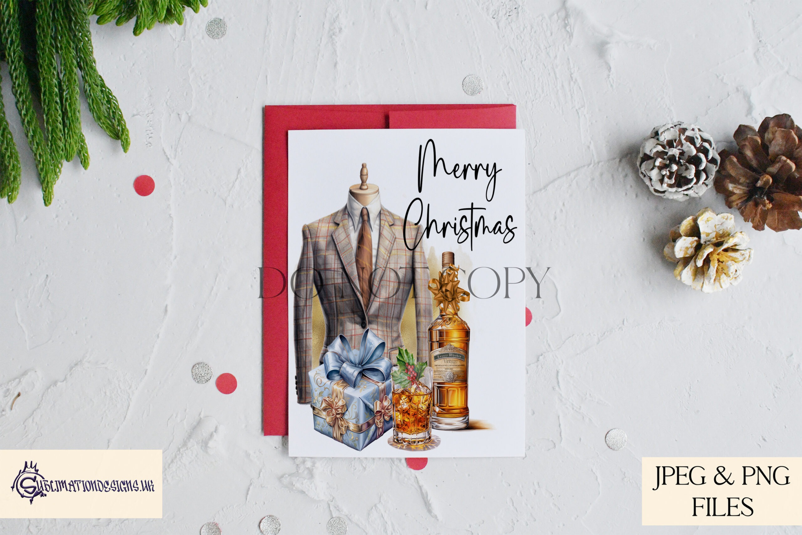 The Vintage Gentleman at Christmas Set captures old-world charm with a classic gentleman in a tweed jacket, whiskey, foil-wrapped gifts and golden accents. Designs include a textless image, “Merry Christmas” and the playful phrase “The Man, The Myth, The Legend.”