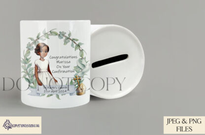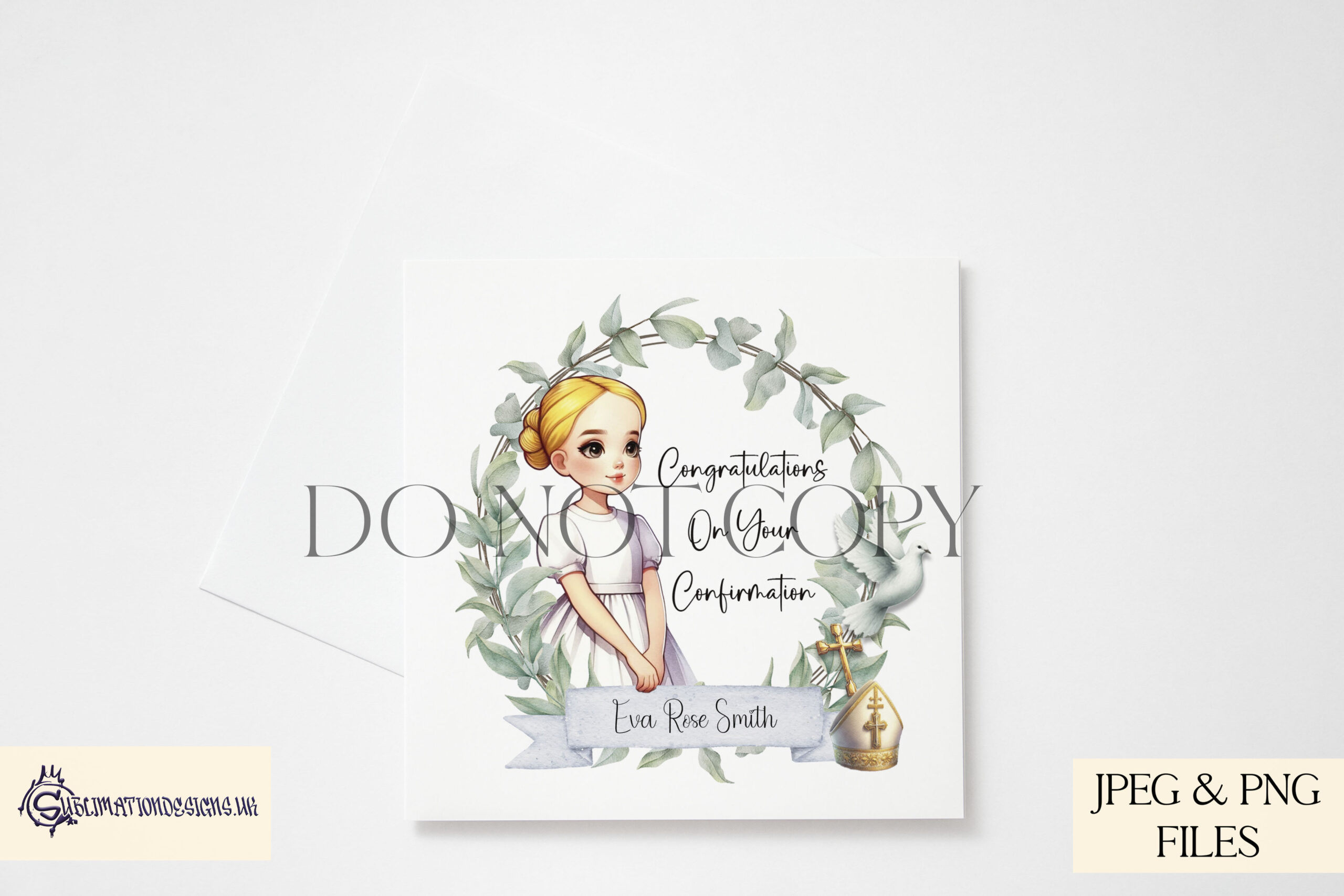 Each girl design is presented in two variations – one with the wording “Congratulations on Your Confirmation” and one textless version for full personalisation. Additional symbolic elements such as a dove, cross, and minister’s hat are included for added significance. Perfect for creating gifts, keepsakes, or décor that honours a young girl’s Confirmation day.