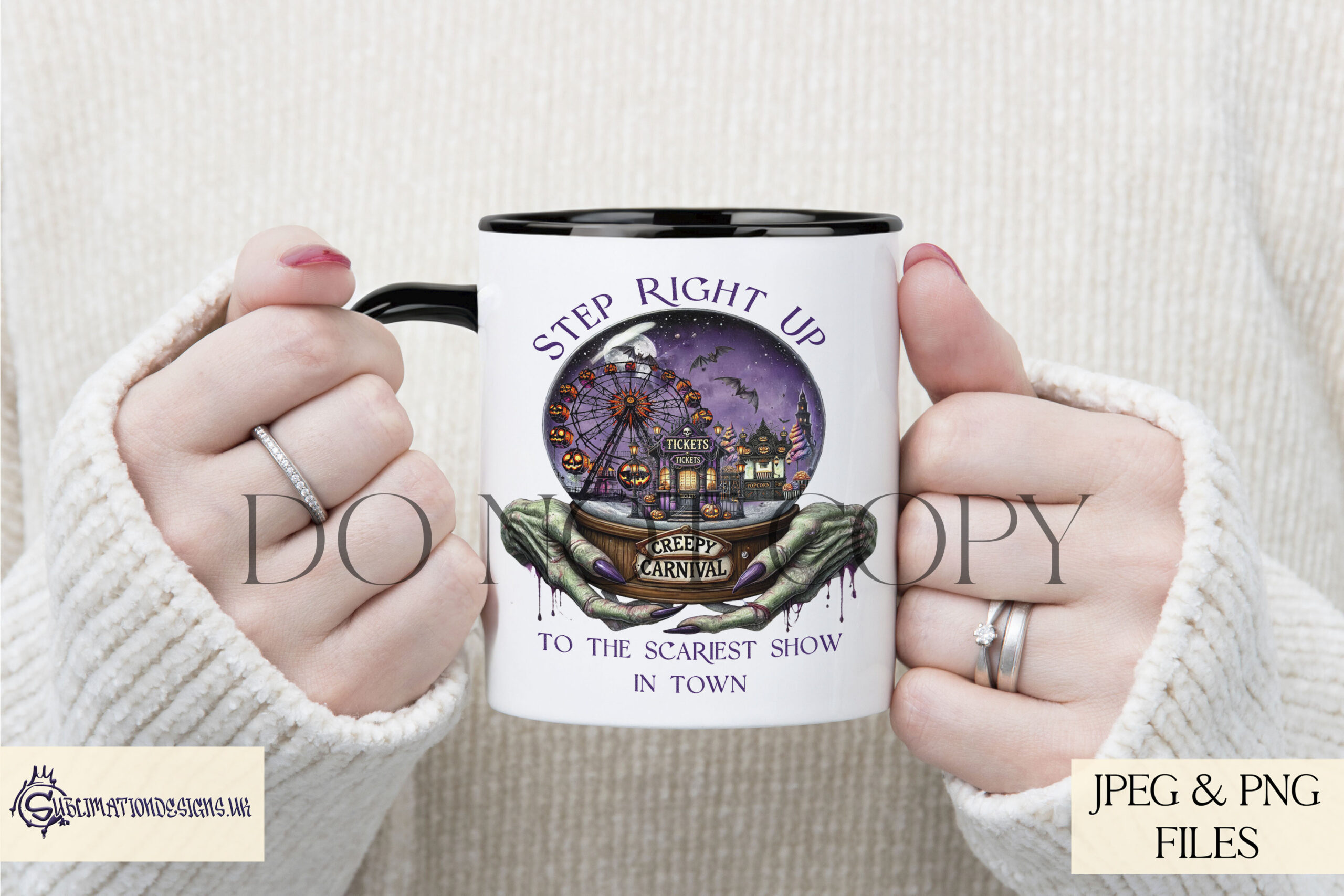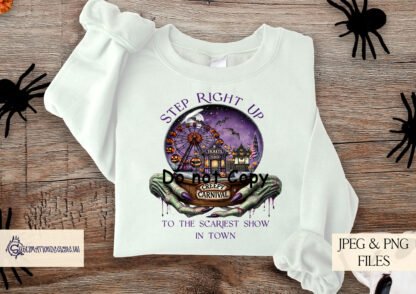 Step into the eerie world of our Creepy Carnival Design, a hauntingly unique creation perfect for Halloween and more. Featuring witch-like hands holding a crystal ball against a creepy carnival backdrop, this design is sure to bring chills and thrills to your projects. The design comes in two variations: textless and with the phrase “Step right up to the scariest show in town.” Ideal for creating Halloween décor, apparel, mugs, and more, this design is a must-have for spooky season crafting.