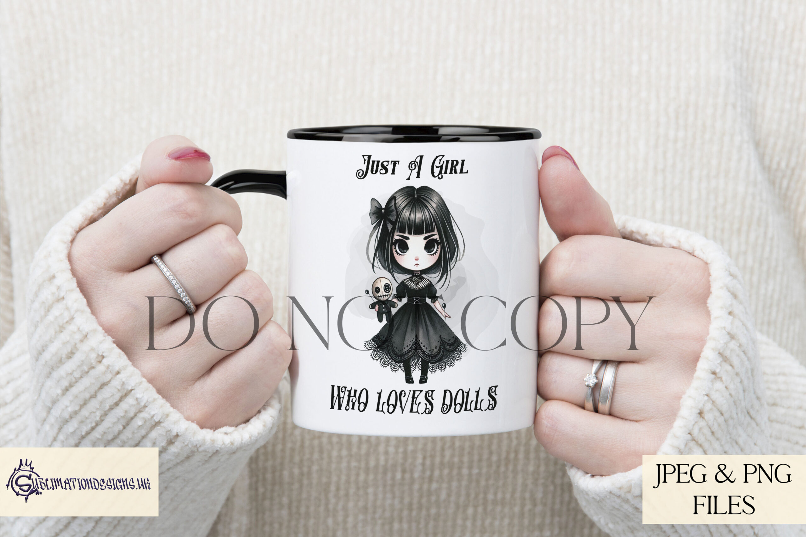 Add a playful gothic twist to your creations with the Cute Comedy Gothic Design Set, featuring a young gothic girl and her voodoo doll. This collection includes 6 charming designs, offering both textless options and designs with the whimsical wording, “Just a Girl That Loves Dolls.” Perfect for crafting unique gothic-themed products that stand out.