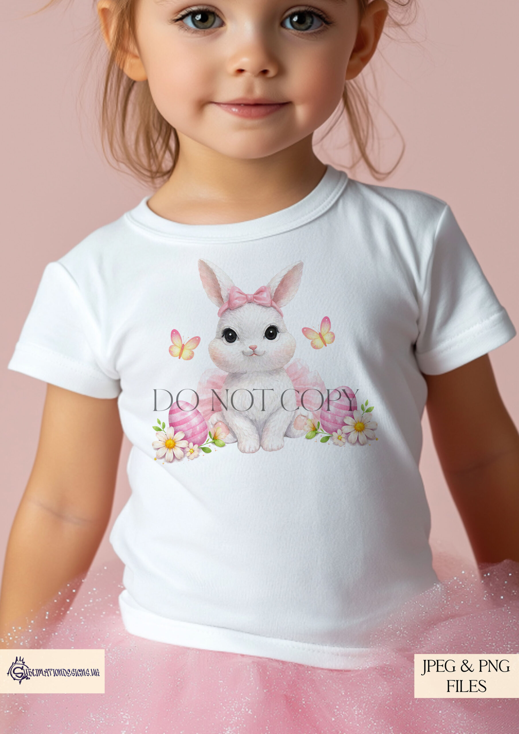 Each design features a sweet Easter bunny sat in a pink tutu with a matching hairbow. The soft, cute style makes it ideal for children’s apparel and keepsake gifts.