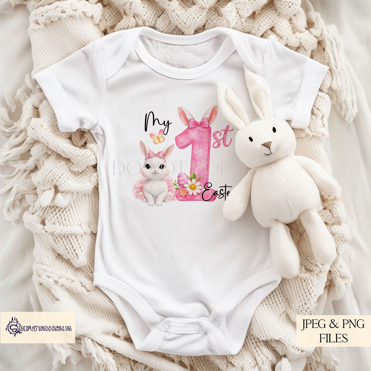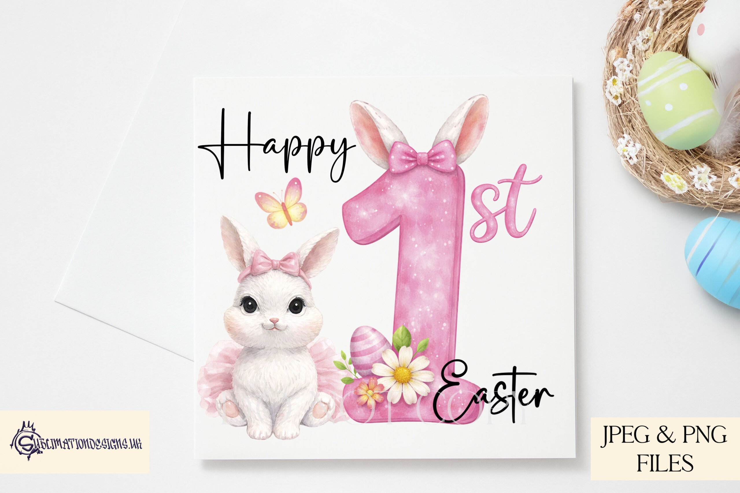 There is one plain version, one version with Easter eggs and butterflies, one “1st” version, and one “1st Easter” version. This gives you a flexible mix for general Easter gifts and milestone items.