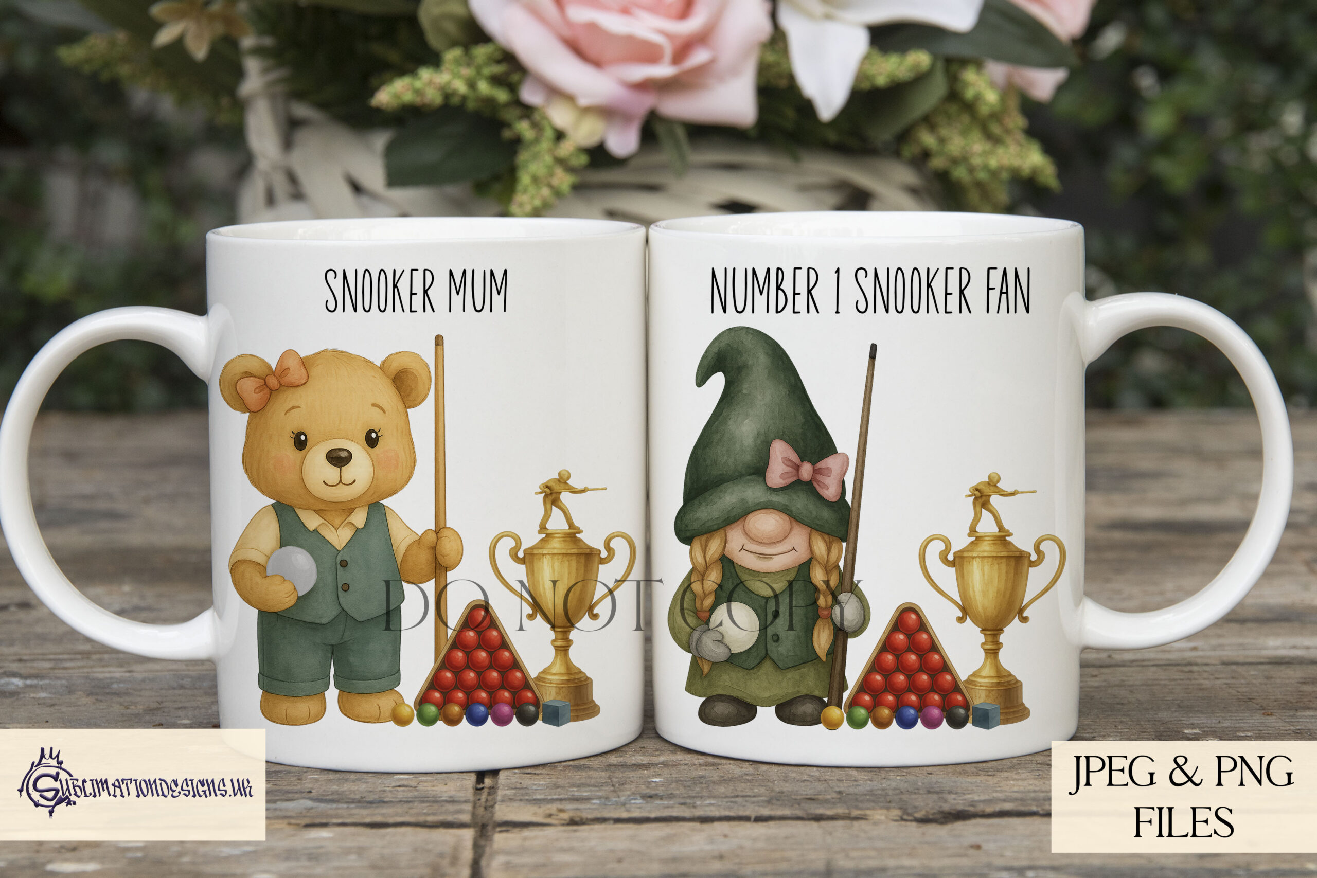 Each design includes snooker cue, chalk, cue ball, full ball set and trophy