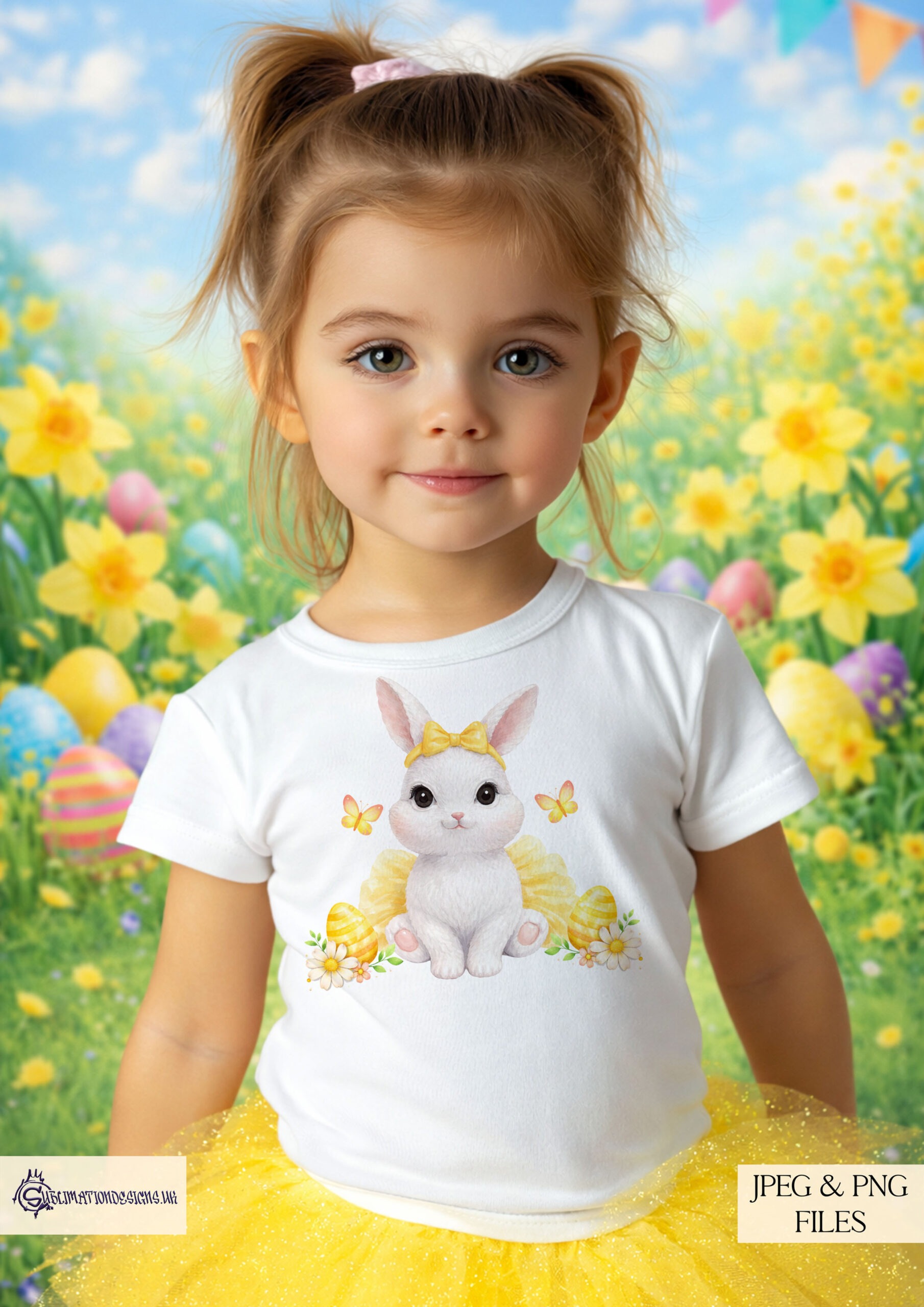 Each design features a sweet Easter bunny sat in a yellow tutu with a matching hairbow. The soft, cute style makes it ideal for children’s apparel and keepsake gifts.