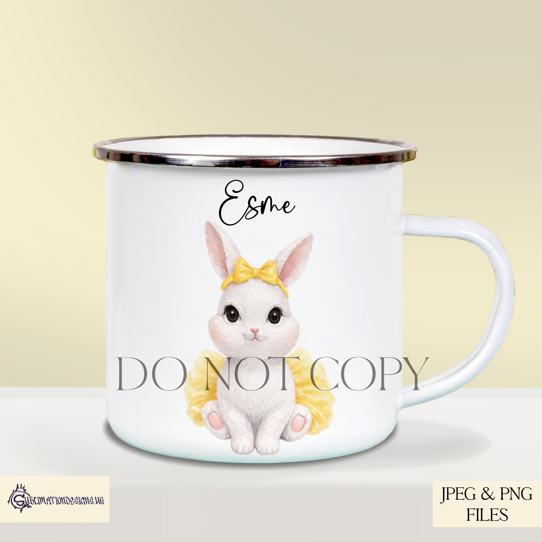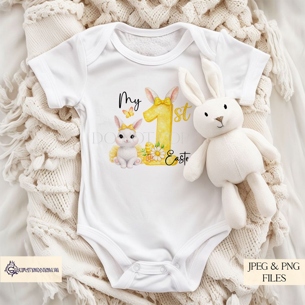 Cute Yellow Tutu Easter Bunny Set of 4 includes a bunny sat in a yellow tutu with matching hairbow, with plain and decorated options plus “1st” and “1st Easter” versions. Supplied in JPEG and PNG with 4 mock ups and a commercial licence for up to 500 physical products.