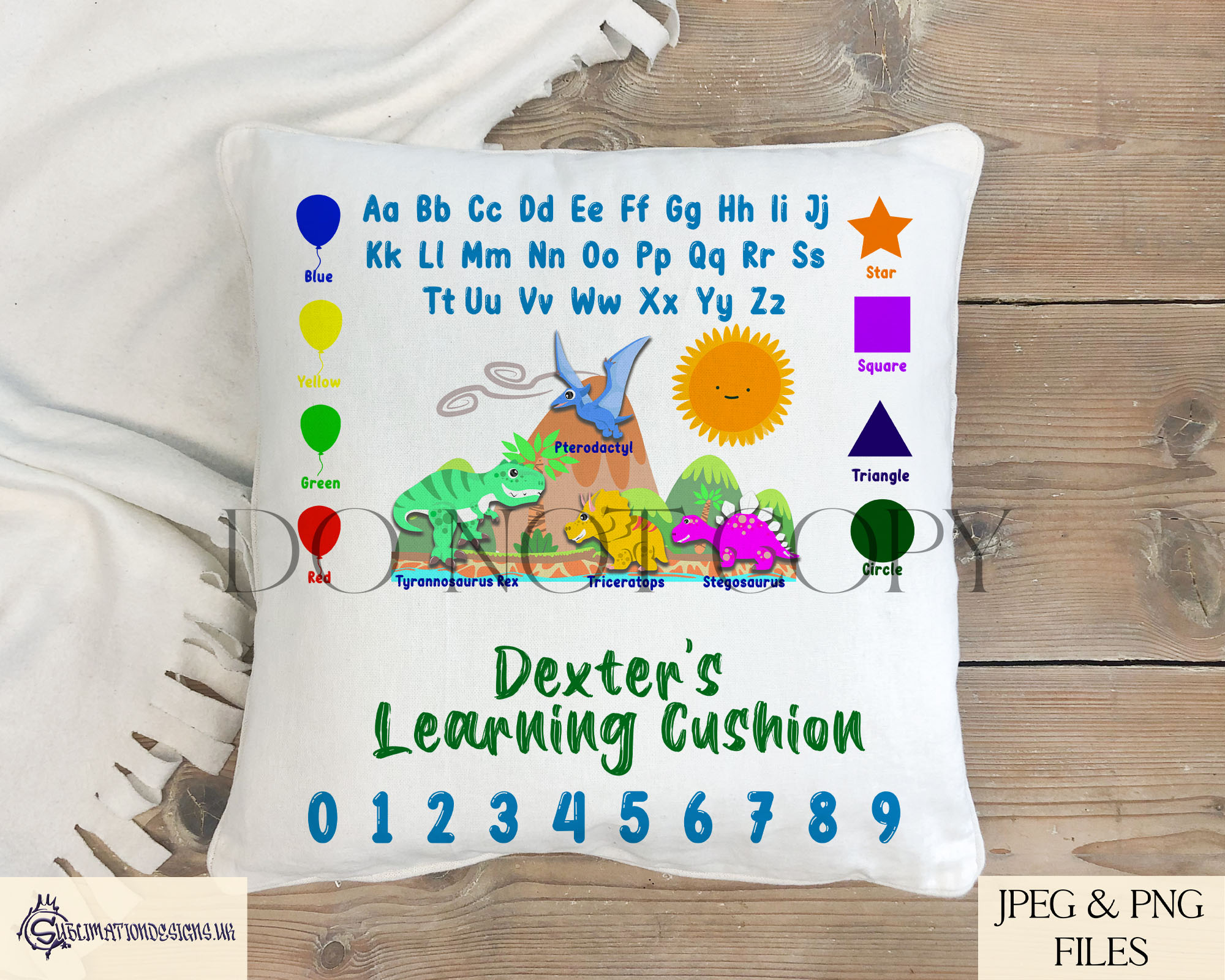Introduce a fun and educational element to children’s spaces with our Dinosaur Learning Pillow Design Set! This sublimation-ready set features engaging dinosaur-themed educational content, including alphabet, numbers, colours, shapes, and dinosaur names. Designed exclusively for learning pillows, this set is perfect for young dinosaur lovers.