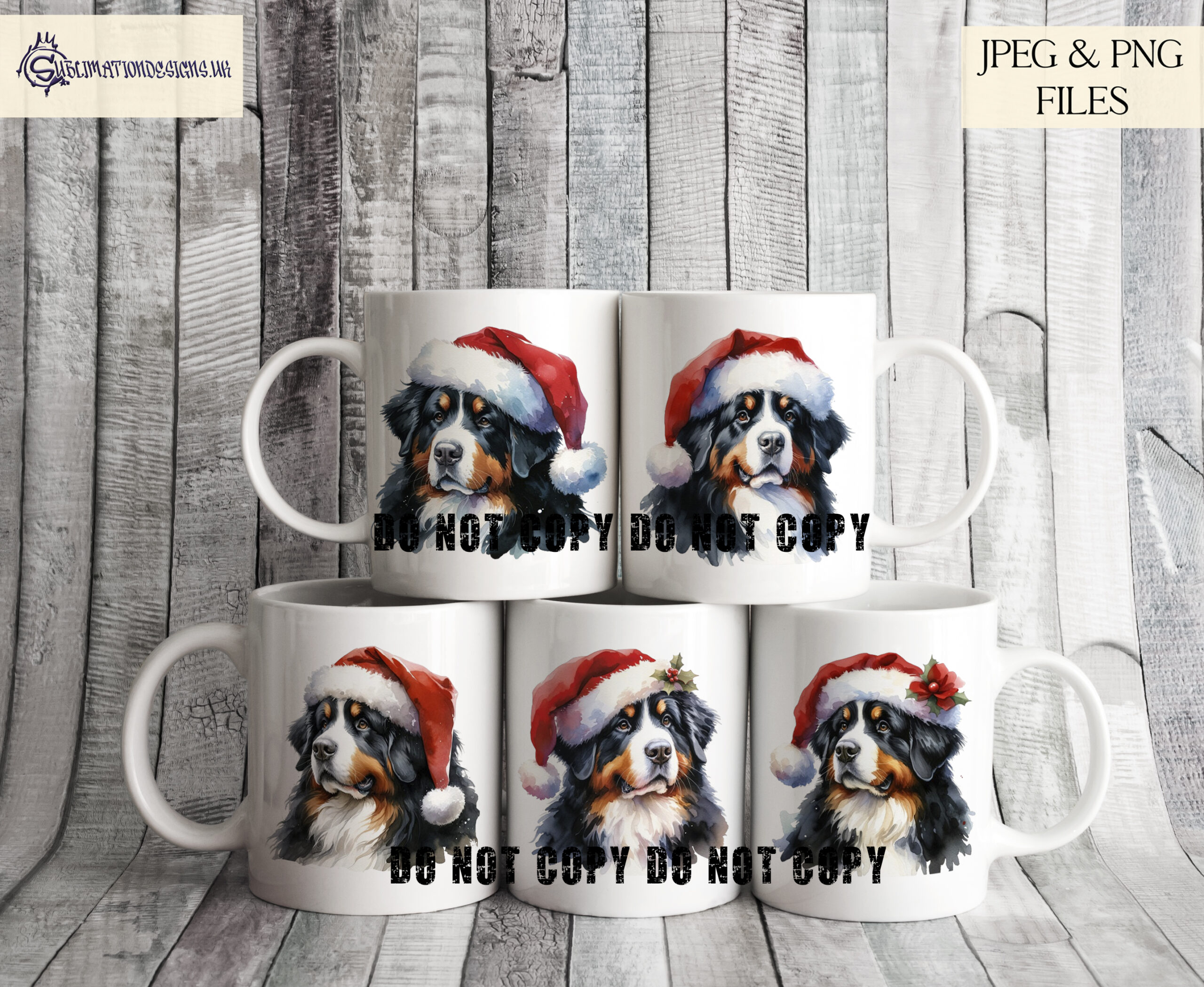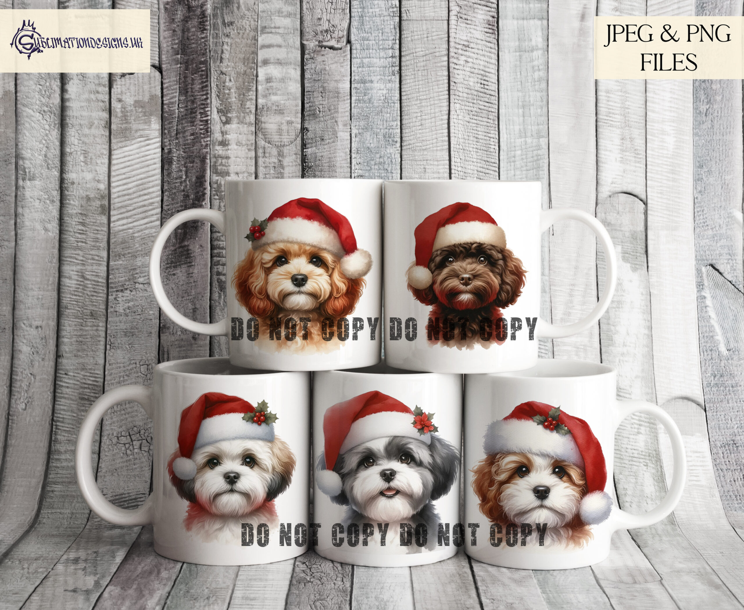 Each design showcases a different dog breed in a festive Christmas setting, making this bundle ideal for mugs, cards, baubles, cushions, apparel, and more. Perfect for any dog lover or pet-themed Christmas creation.