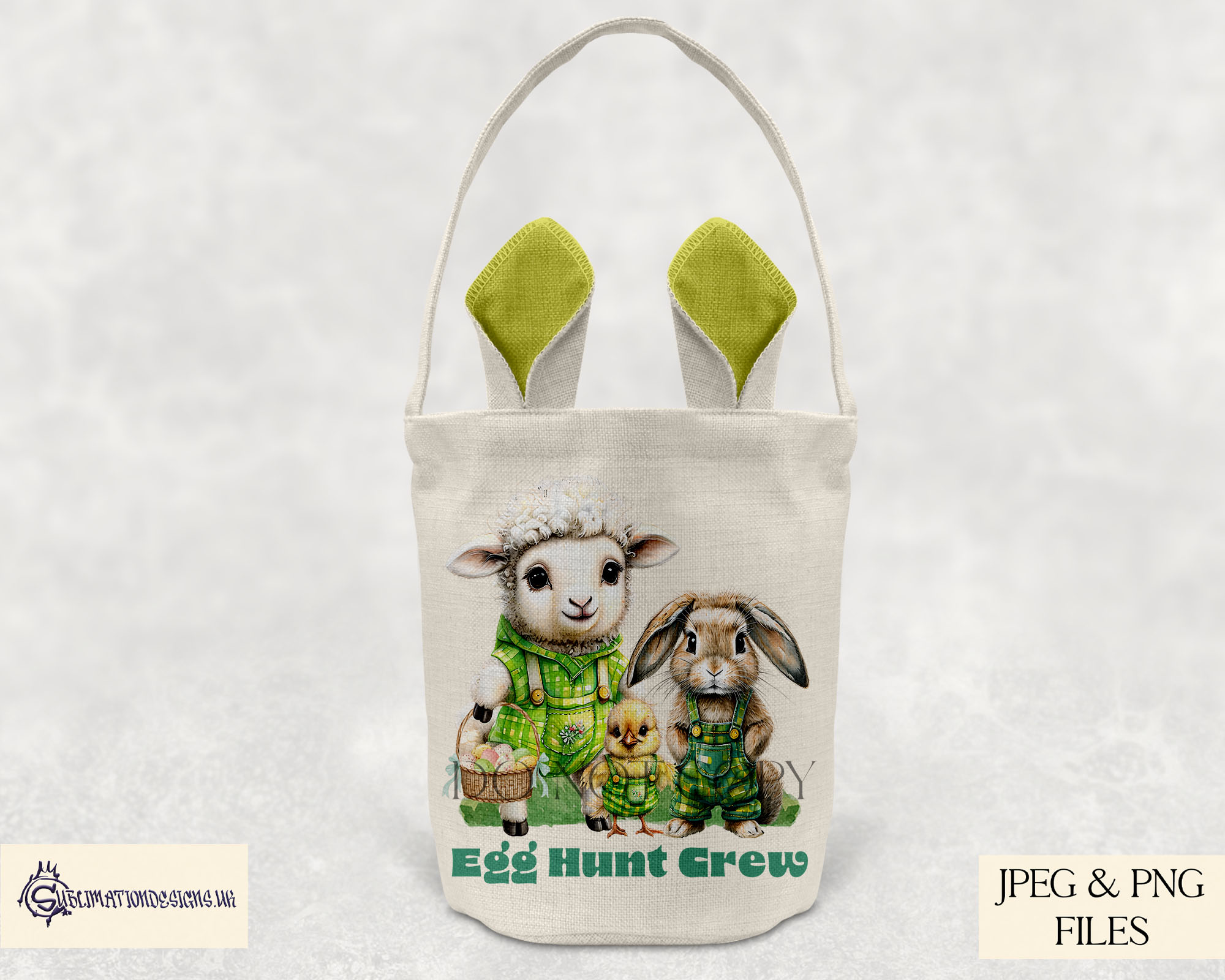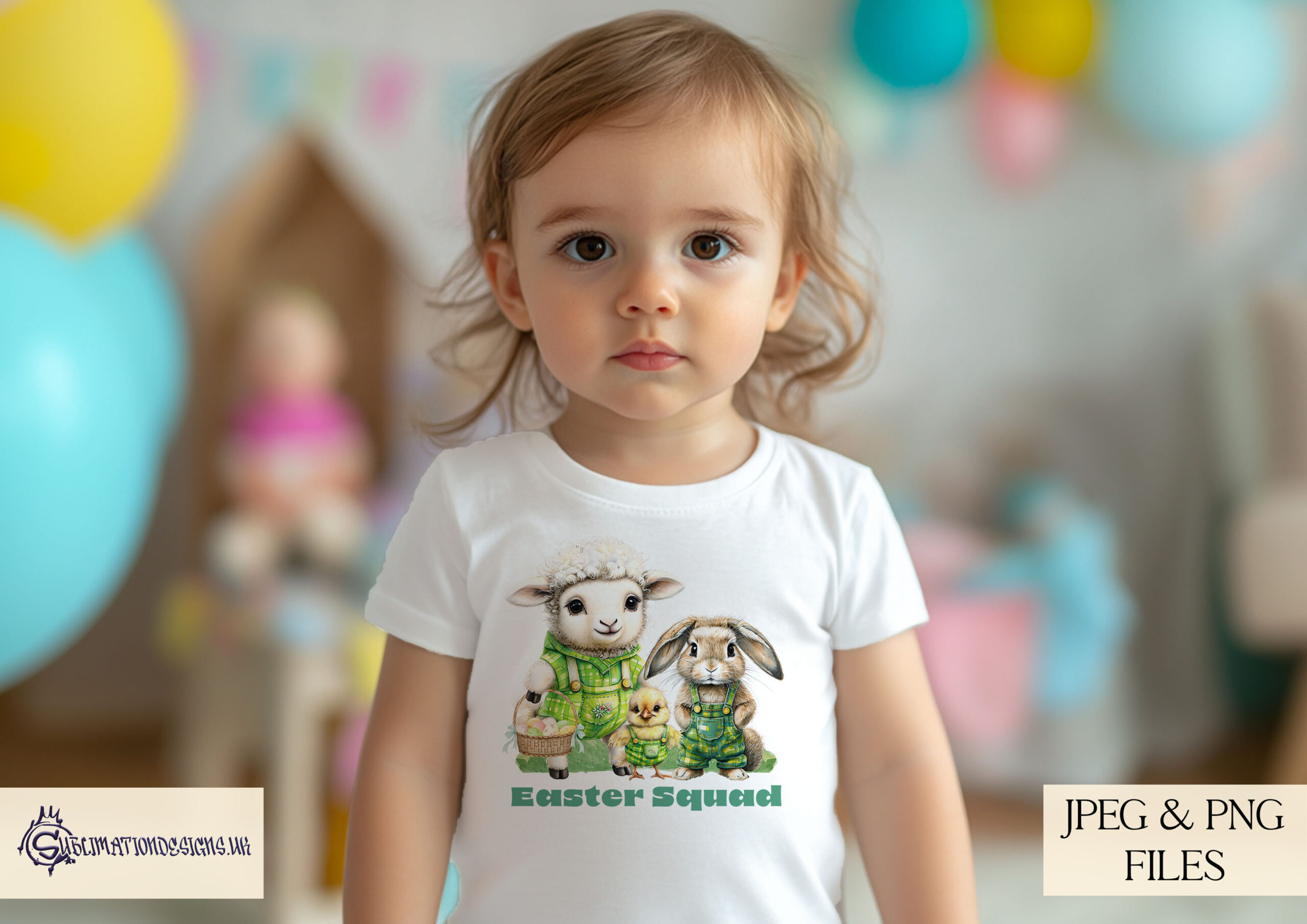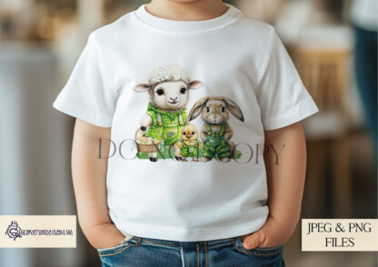 A fun and festive Easter design set, featuring a lamb, bunny rabbit, and chick wearing patterned dungarees with an Easter backdrop. Includes three variations: textless, “Egg Hunt Crew”, and “Easter Squad”, making it ideal for sublimation projects, children’s apparel, and personalised gifts. Comes in JPEG and PNG formats with three mock-ups included.