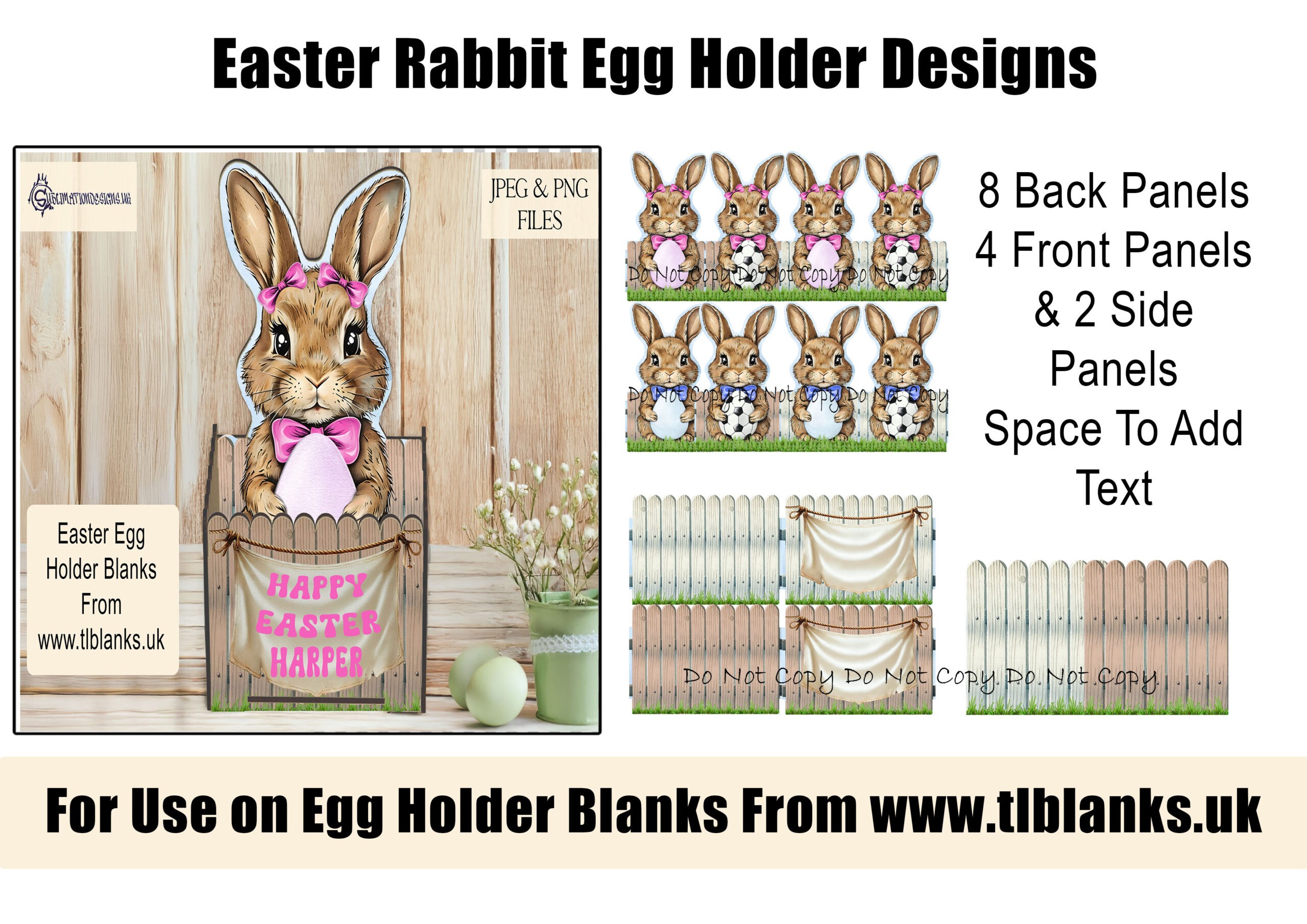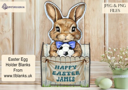 A versatile Easter Bunny design set created for TLBlanks.uk Easter Egg Holders. Features 3 panels (front, back, and sides), available in white and brown fence styles. 8 back panel variations include a boy bunny with blue egg or football and girl bunny with pink egg or football. Perfect for Easter crafting, sublimation, and personalised gifts. Comes in JPEG and PNG formats with three mock-ups included.