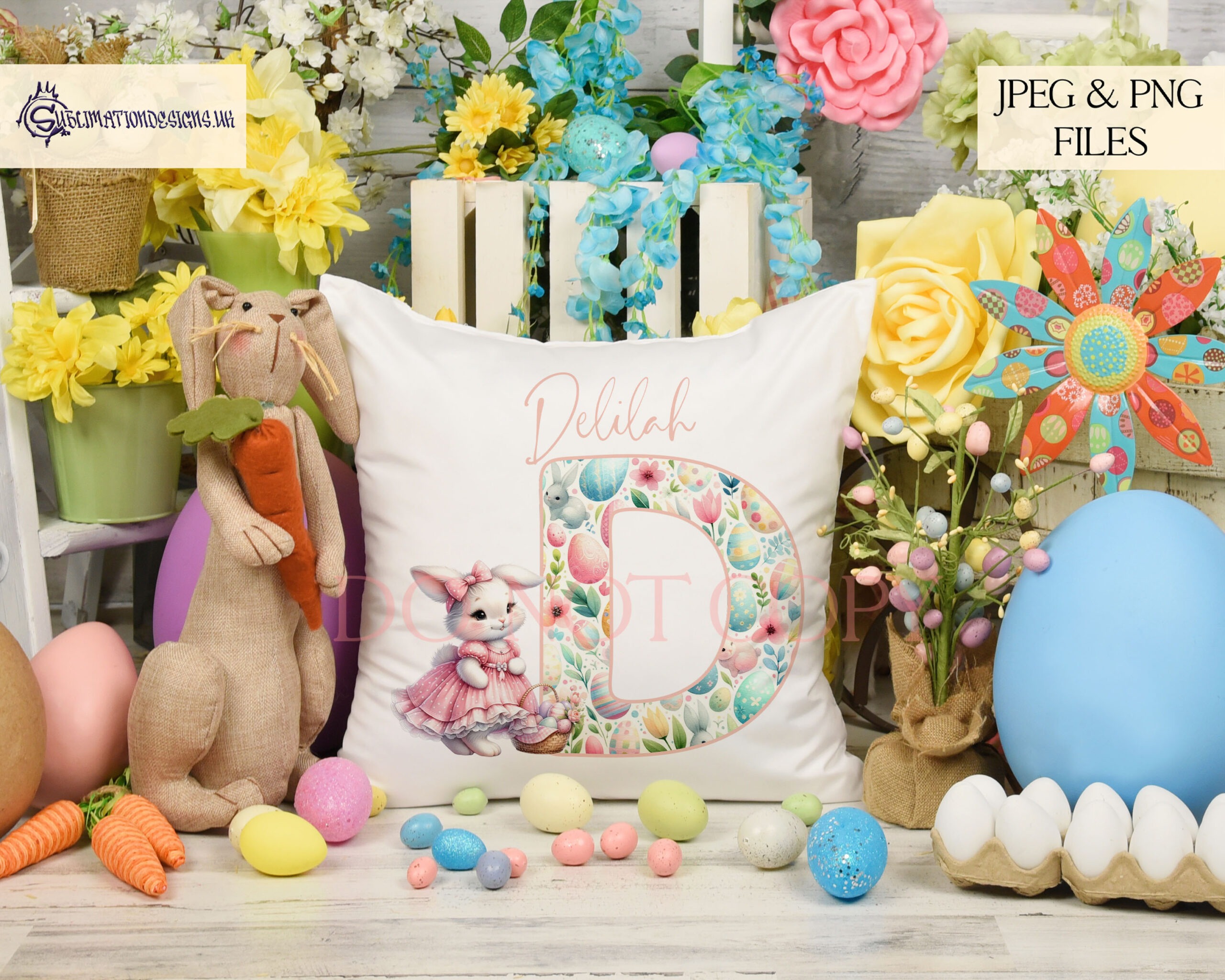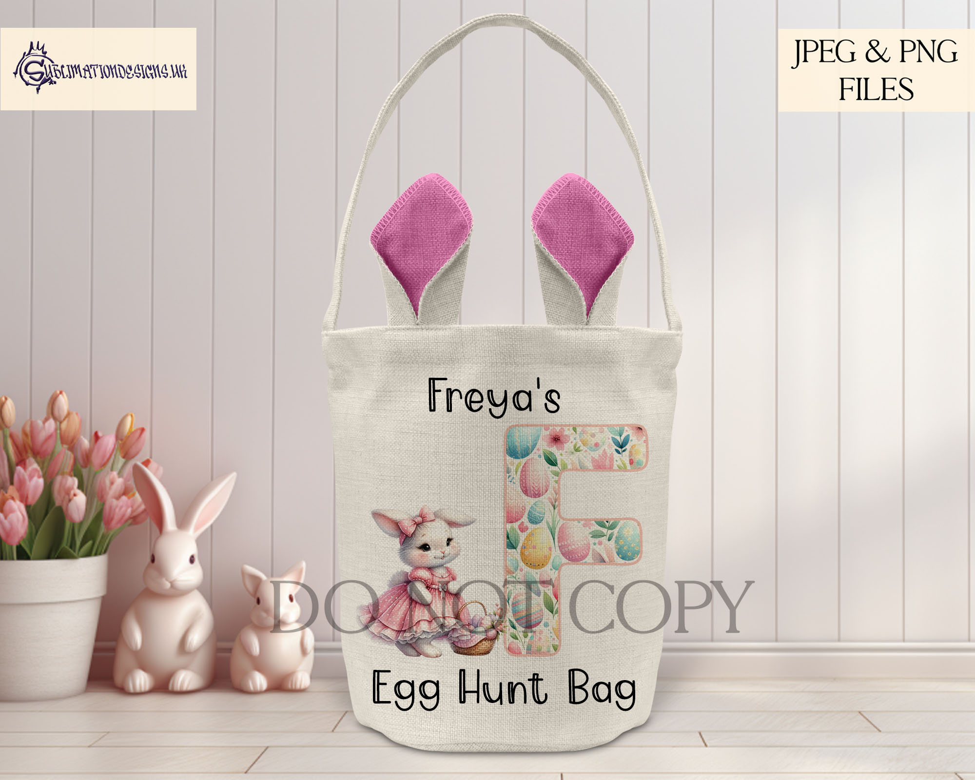 - 26 alphabet files: Each featuring a unique patterned letter and Girl Easter Bunny illustration