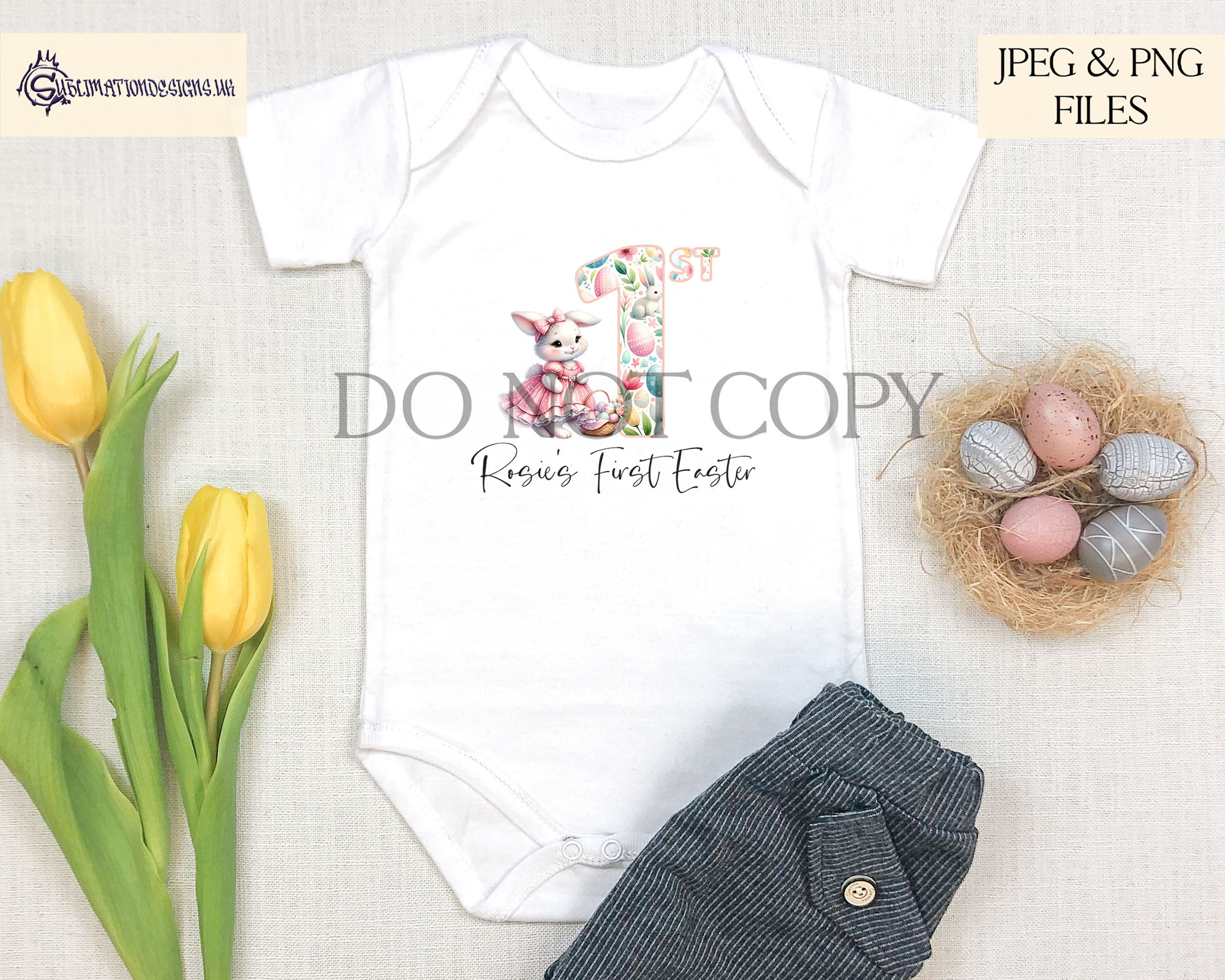 - 1 “My First Easter” design: Customisable with a background option