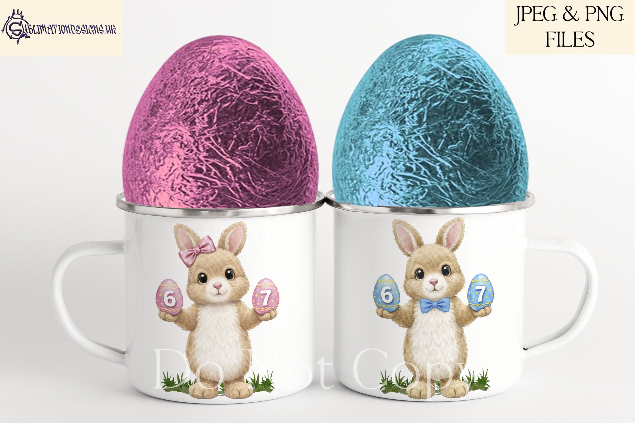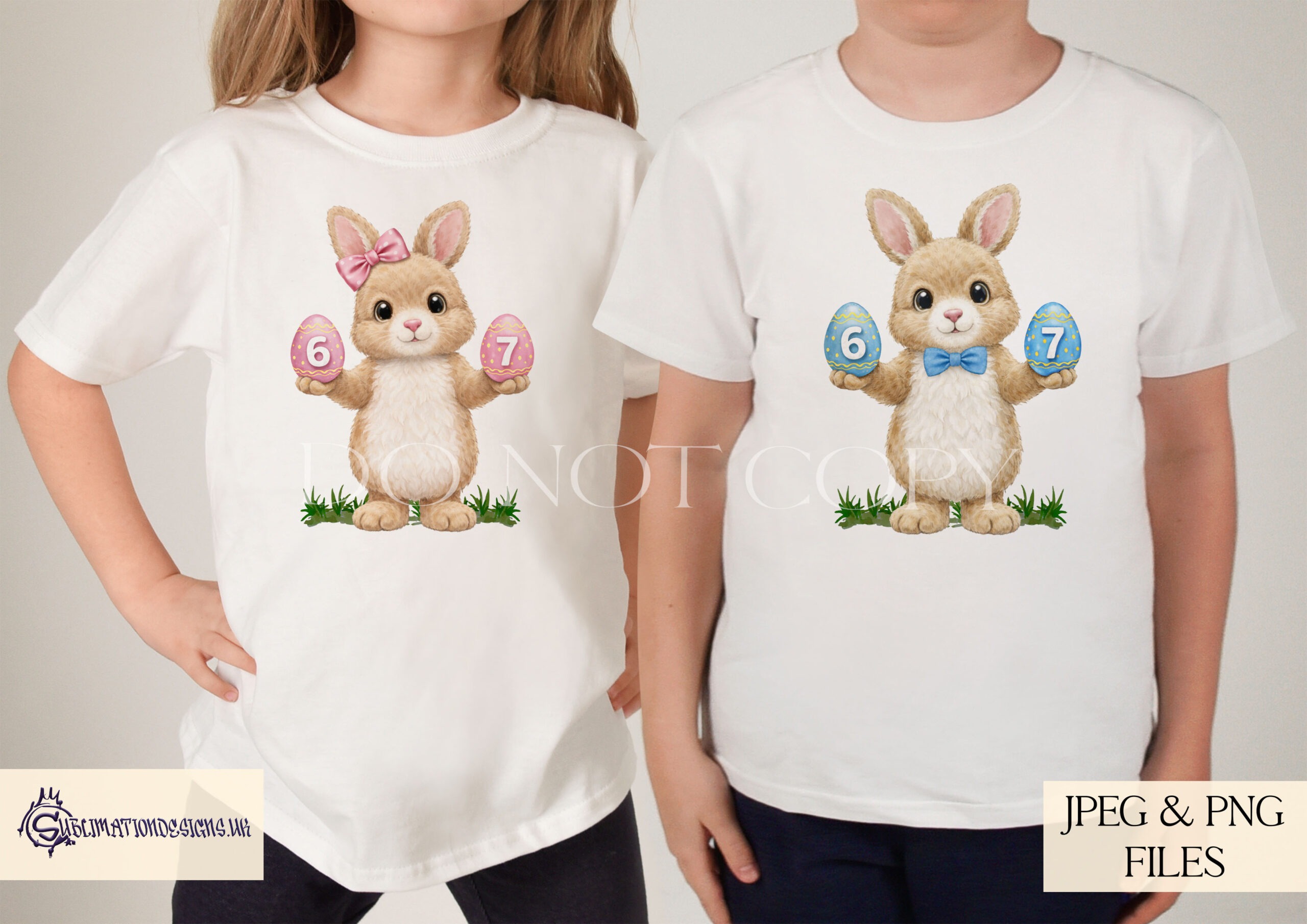 Each design features an Easter bunny holding two Easter eggs. One egg shows the number 6 and the other shows the number 7, making it perfect for young kids who still love the viral six seven trend.