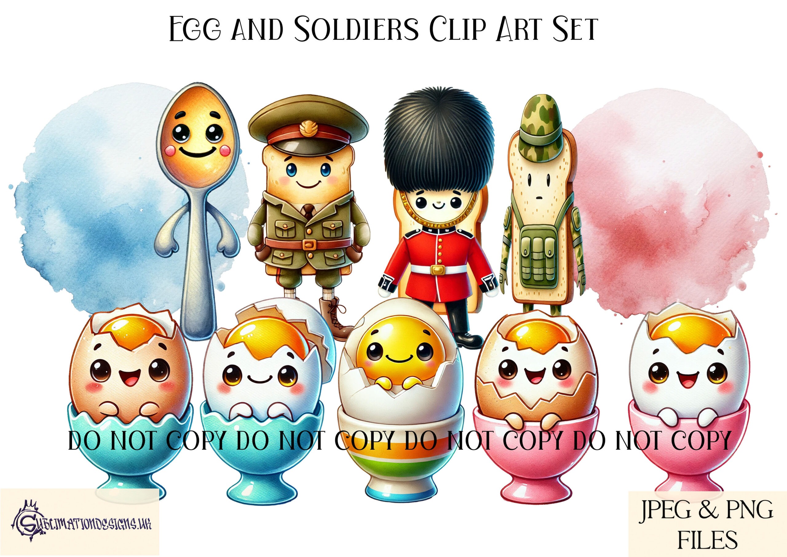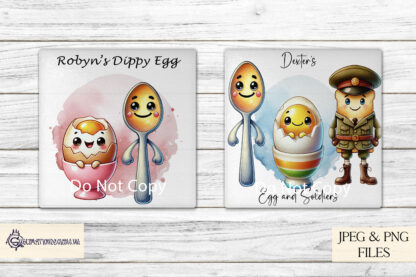 Bring fun to mealtime creations with our Egg and Soldiers Clip Art Set. This adorable collection features 10 elements, perfect for crafting personalised egg cups, placemats, or coasters for children. With 3 playful soldiers, 5 eggs, and 2 colourful background splashes, this set is ideal for adding charm to breakfast accessories or unique gifts.
