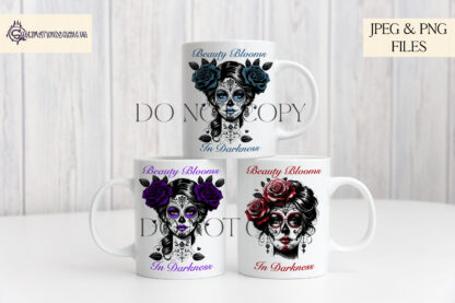 - “Beauty Blooms in Darkness” in red, blue, and purple variations.