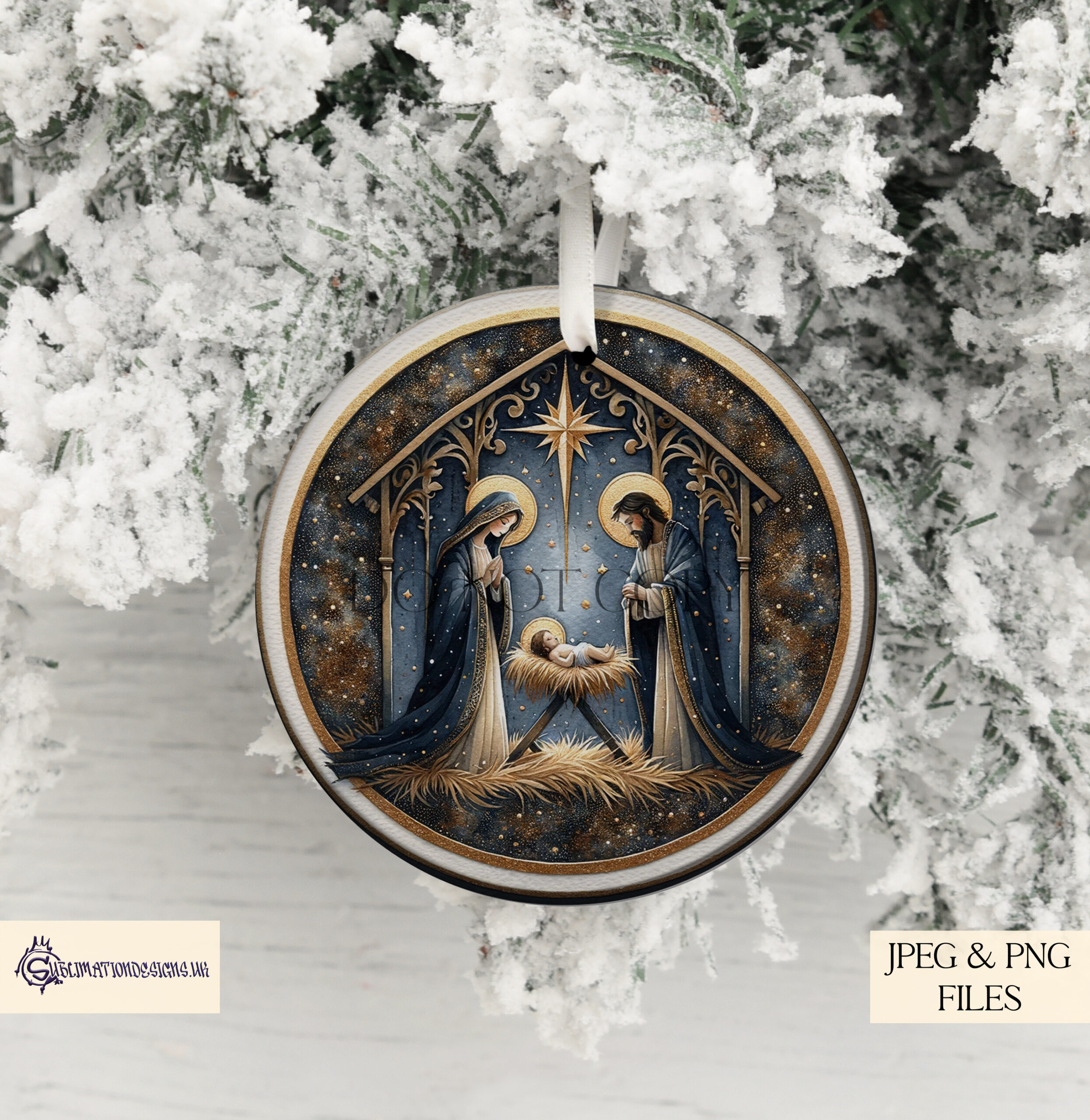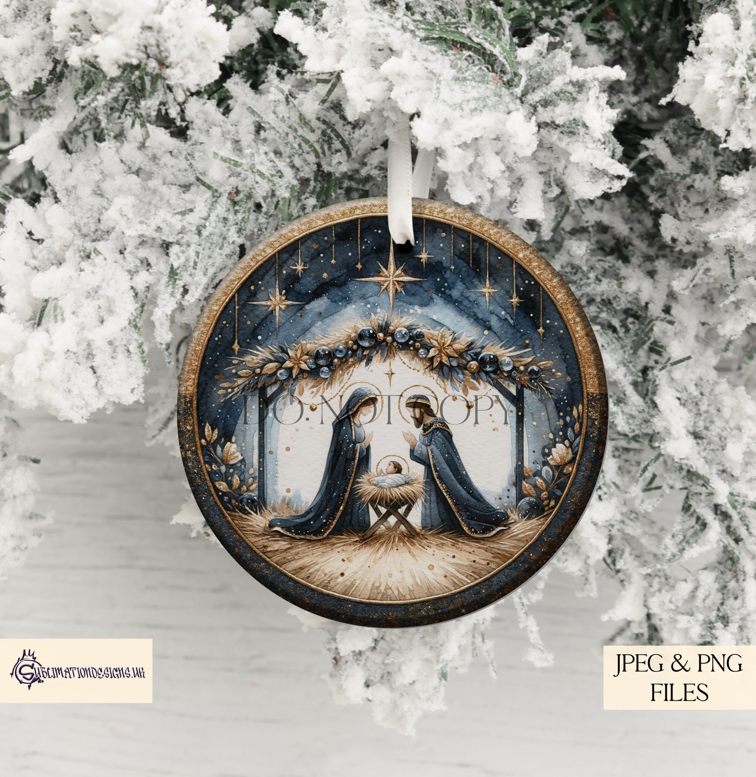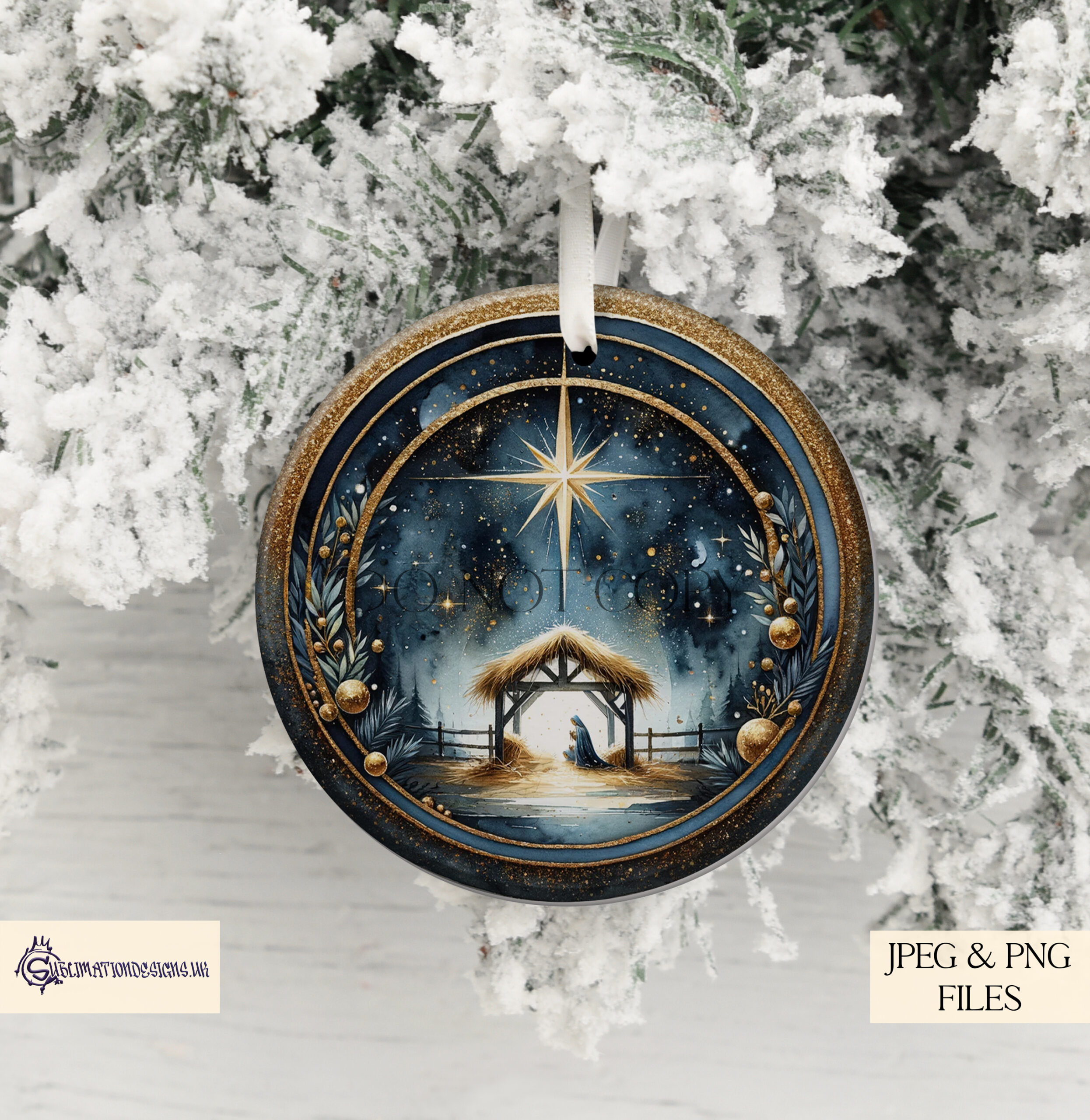 Elegant Nativity Scene Round Bauble Set | 3 Navy and Gold Designs | JPEG & PNG | 3 Mock-Ups | Commercial Licence