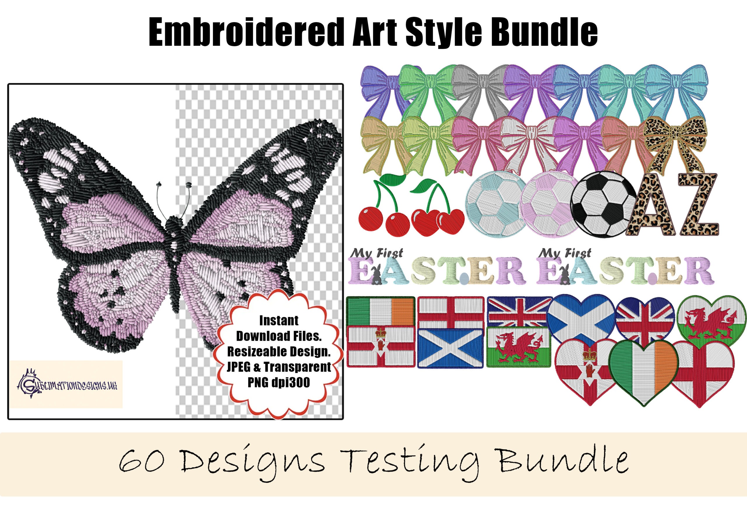 Due to the popularity of the embroidery-style effect, we have bundled together 60 designs into this Embroidery-Style Tester Bundle, allowing crafters to experiment with the look and feel of this unique style. This collection is perfect for sublimation printing on apparel, mugs, tote bags, and personalised gifts.