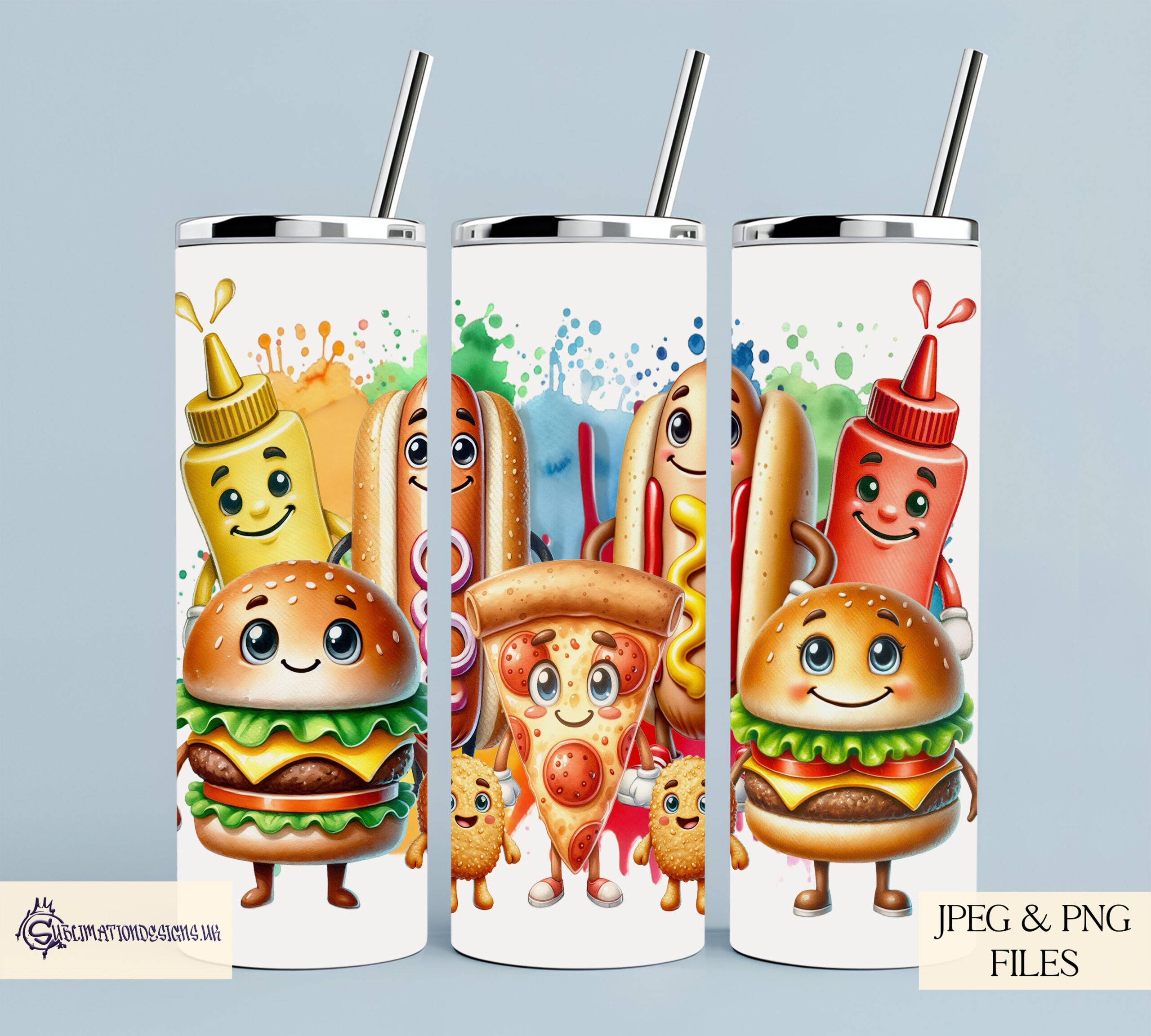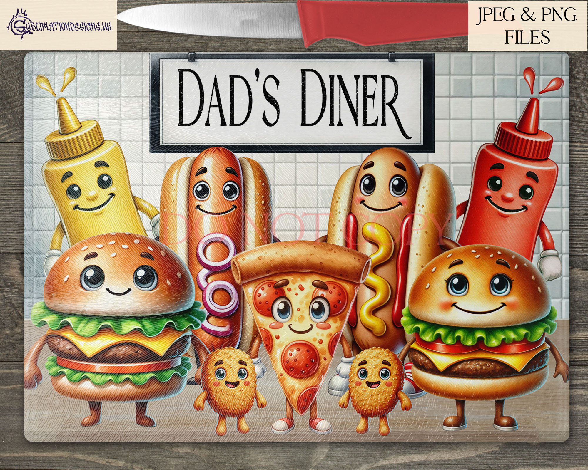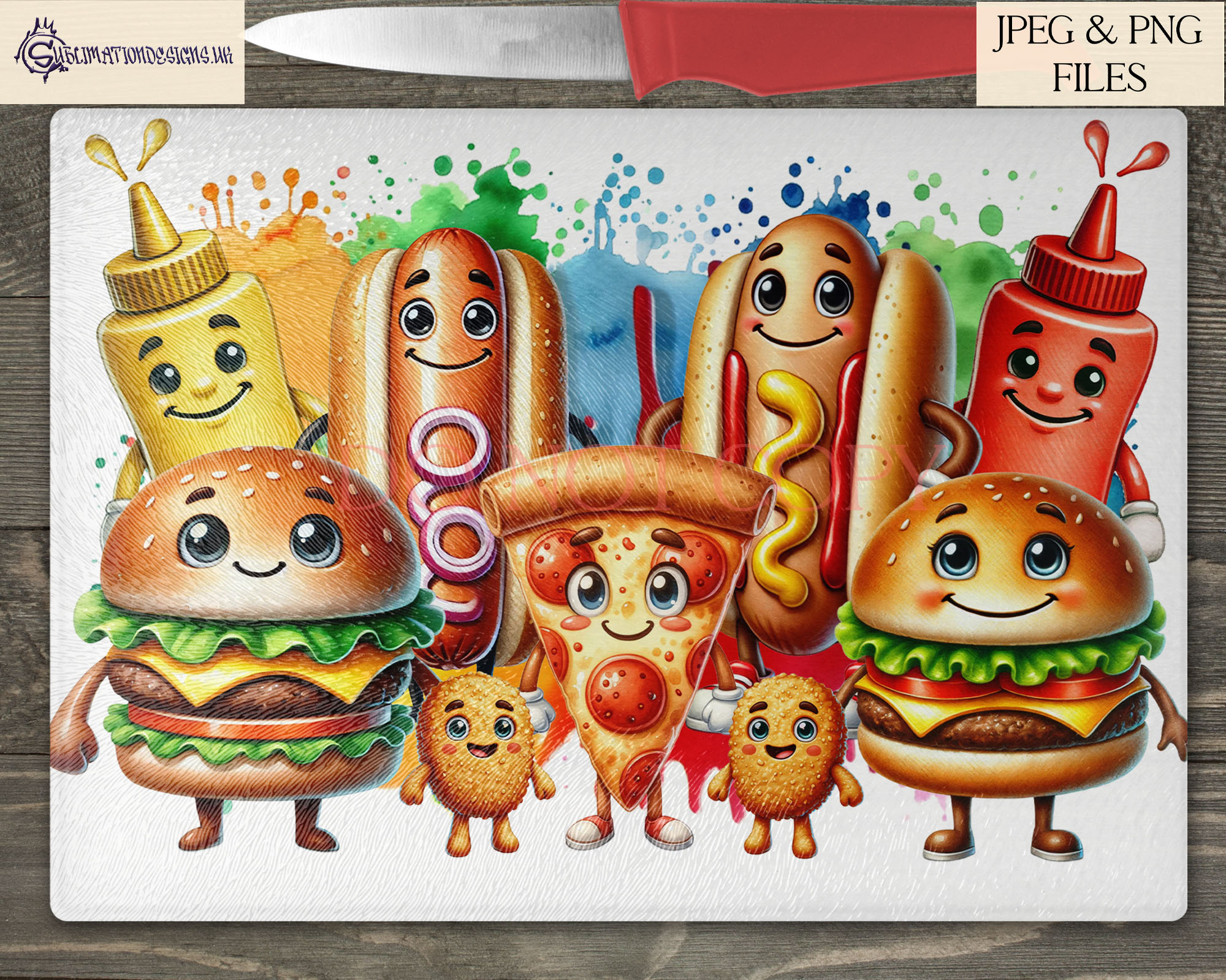 Add a fun and quirky touch to your kitchen with the Fast Food Jolly Character Chopping Board Design Set! This playful collection features three unique designs, each showcasing cheerful fast-food characters in different background styles. Perfect for sublimation chopping boards, tumblers, and kitchen décor, these designs bring a pop of colour and humour to any cooking space.