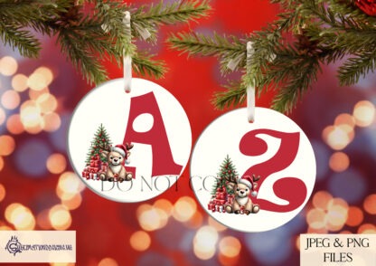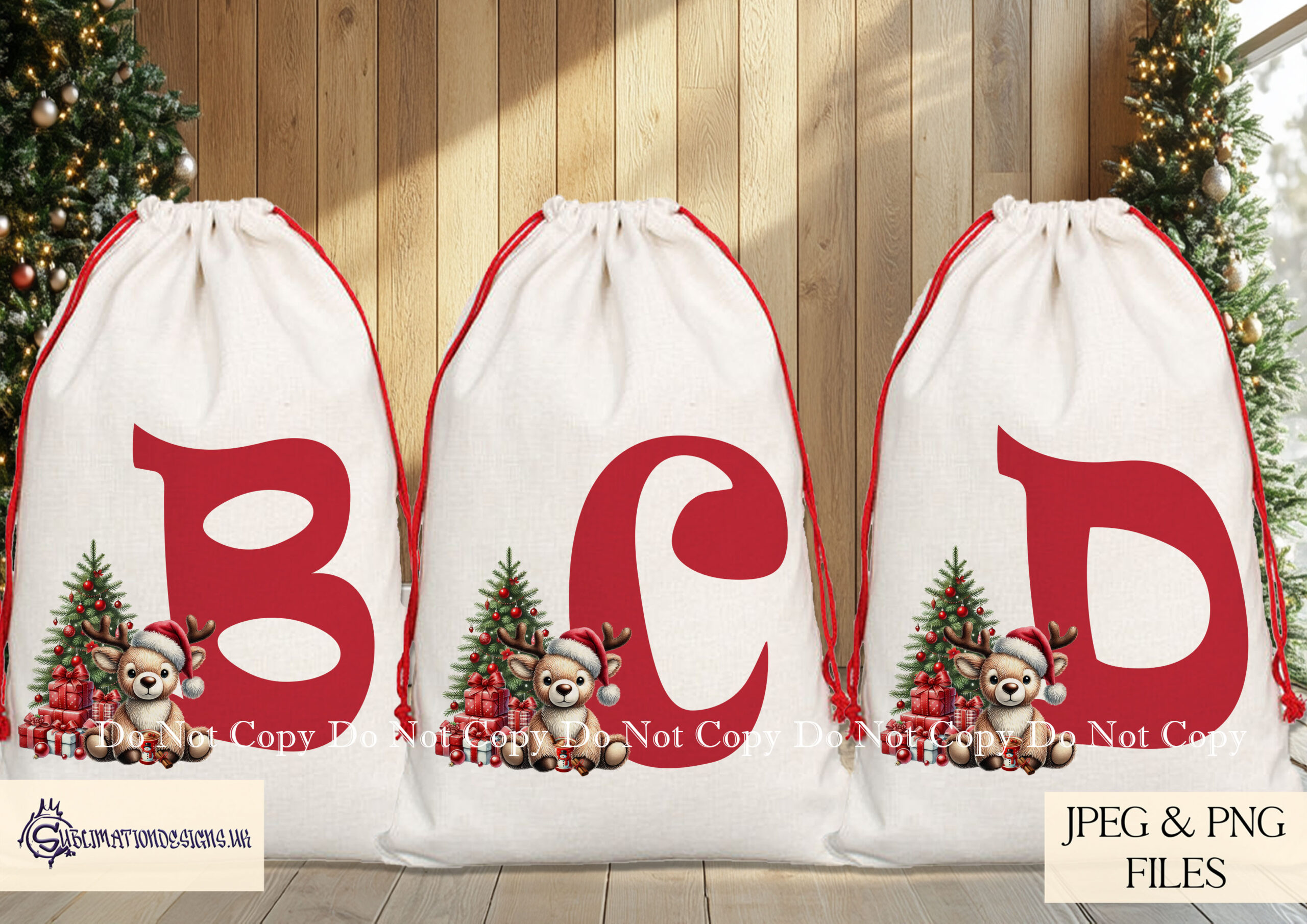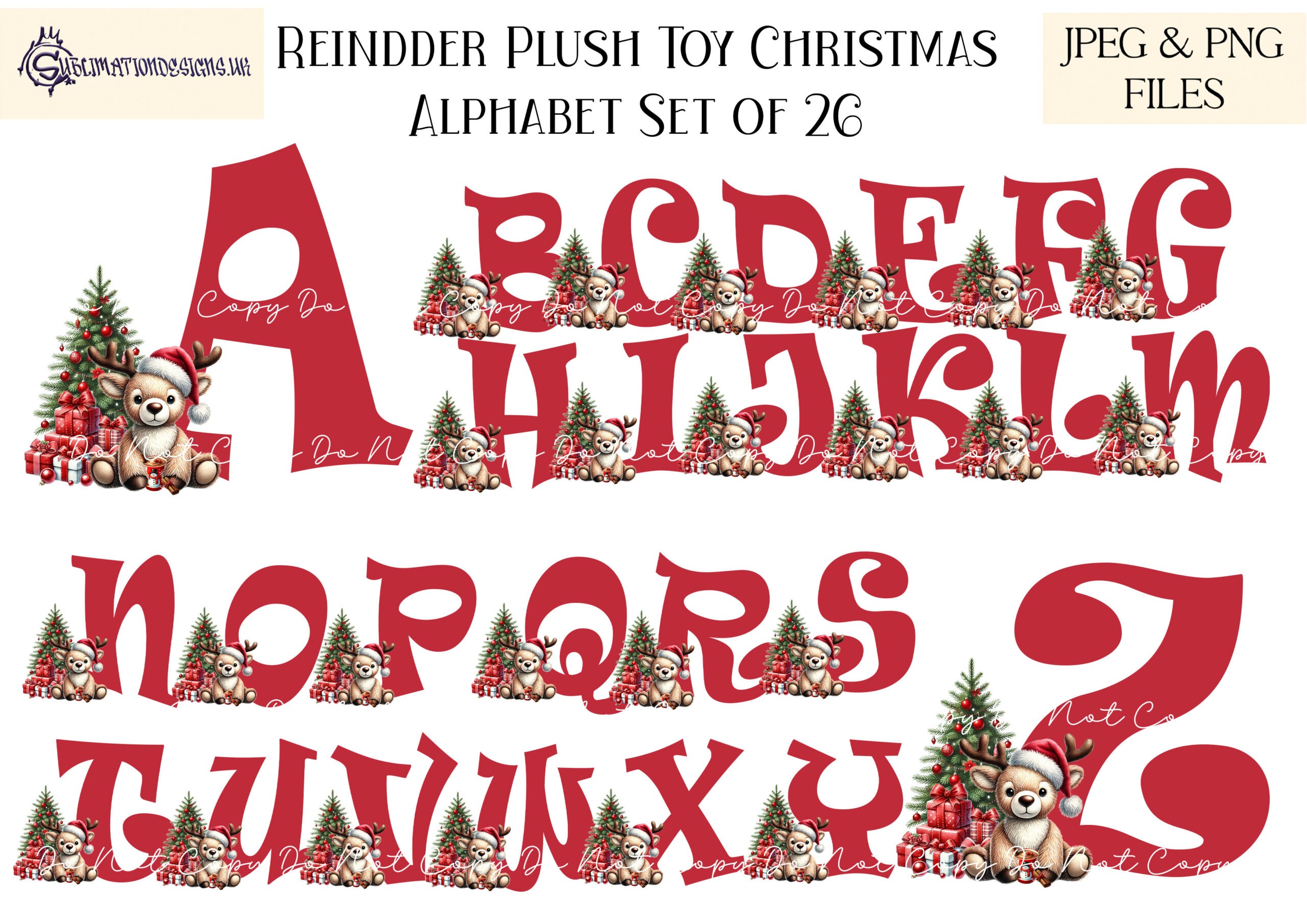 - 26 high-resolution designs featuring a different letter from A to Z with the plush toy reindeer and Christmas tree scene