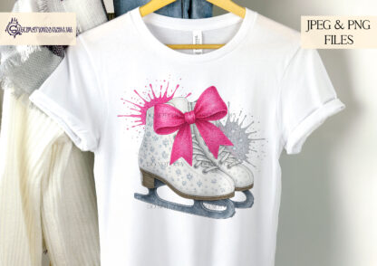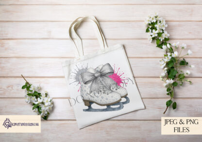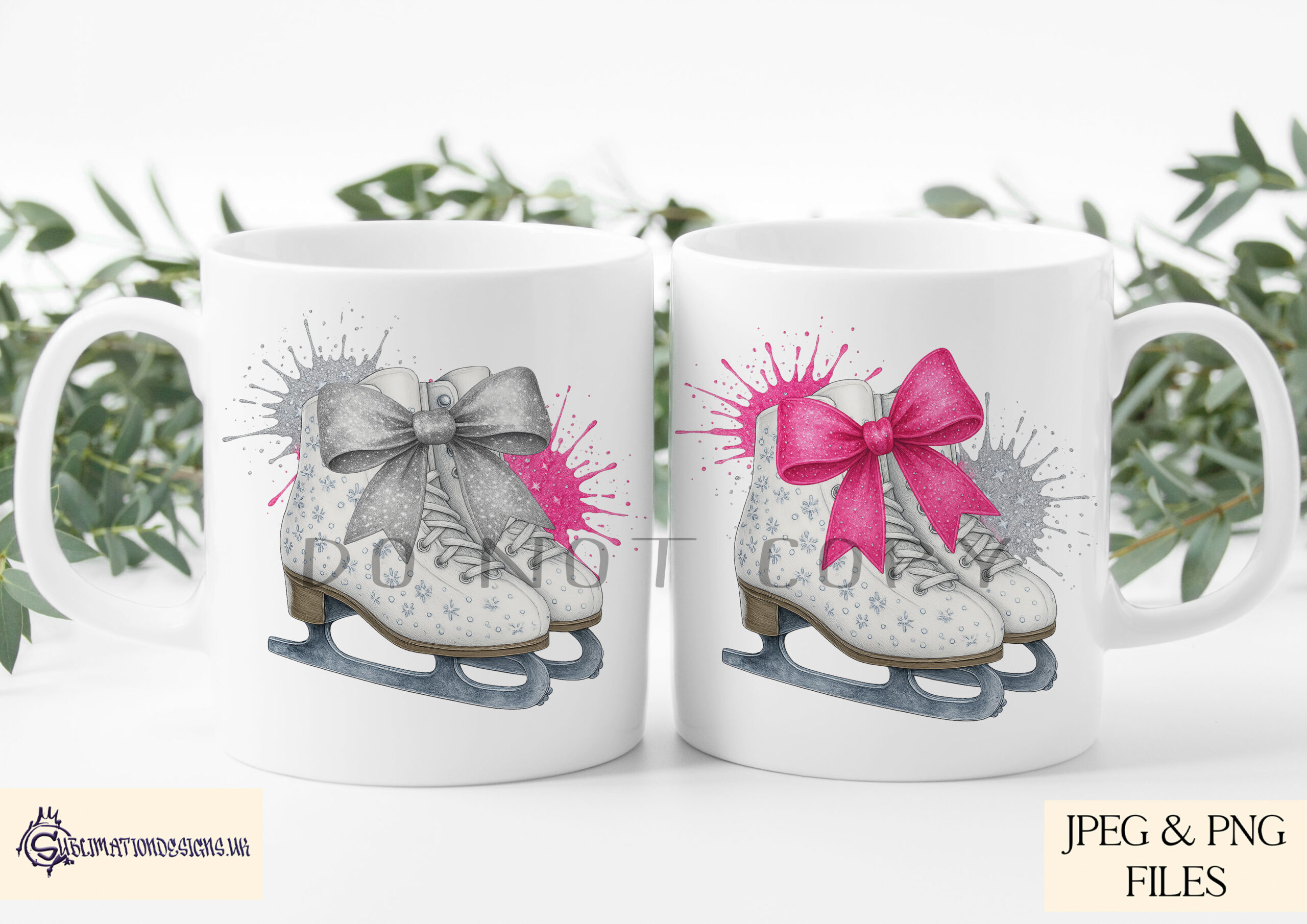 Add some sparkle to your creations with the Glitzy Ice Skates Designs Set. This chic and stylish duo features a pair of white ice skates, each adorned with a glittery bow in either pink or silver. Paired with matching paint splash backgrounds, these textless designs are ideal for crafting elegant and eye-catching products.