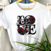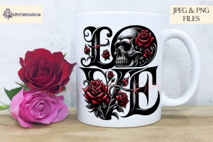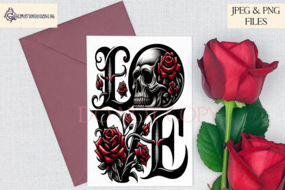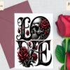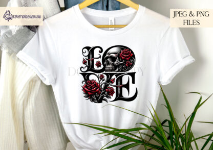 - The word “LOVE” in gothic-style font, with the “O” replaced by a skull and surrounded by red roses