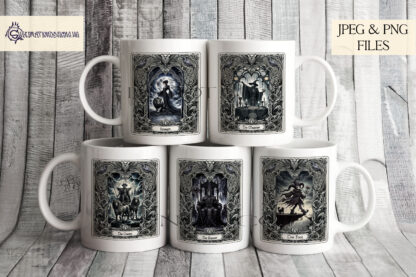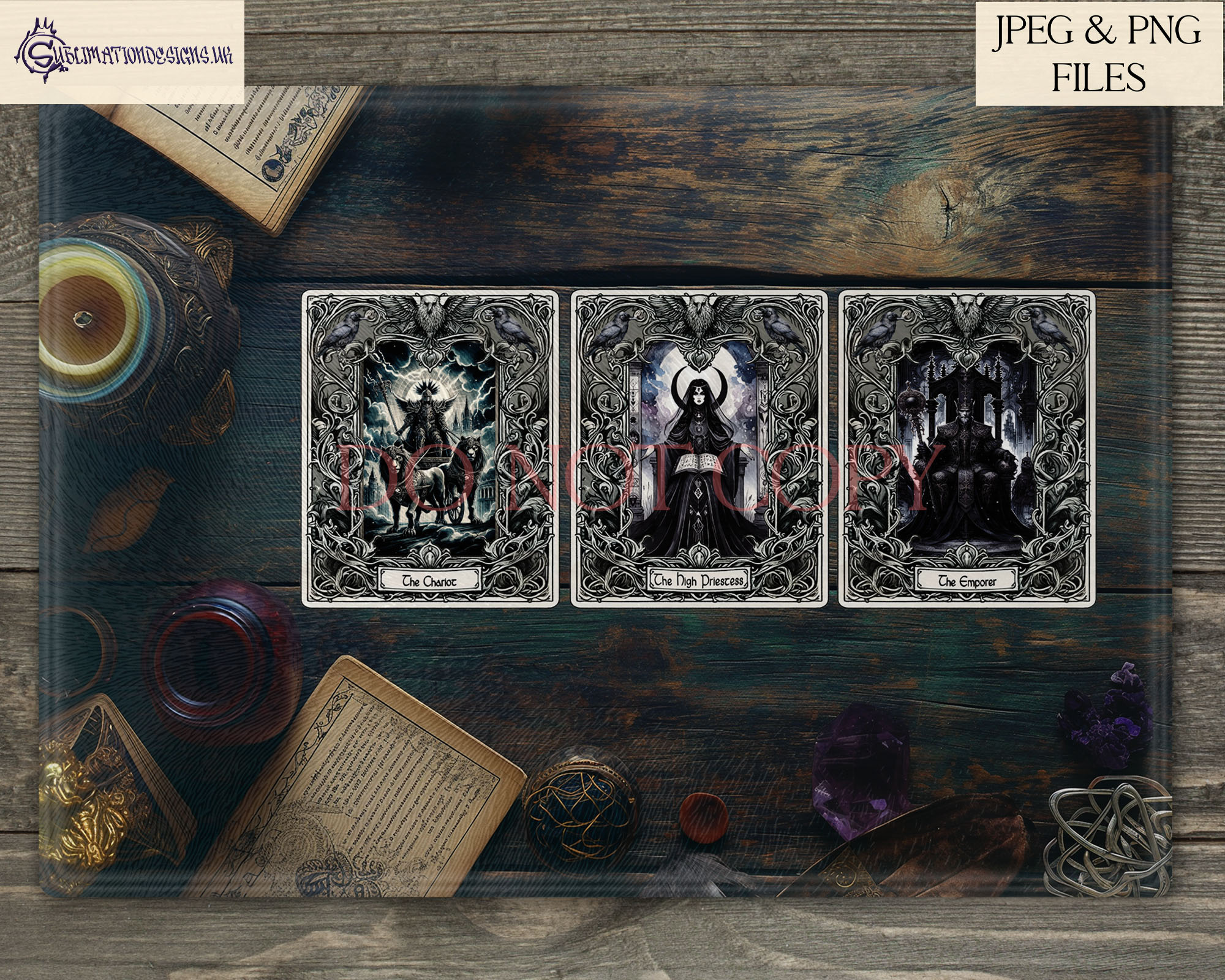These high-resolution designs are perfect for gothic wall art, t-shirts, mugs, chopping boards and more. Whether you’re creating spiritual décor or products for the alternative market, this set blends the mystique of the tarot with bold gothic flair.