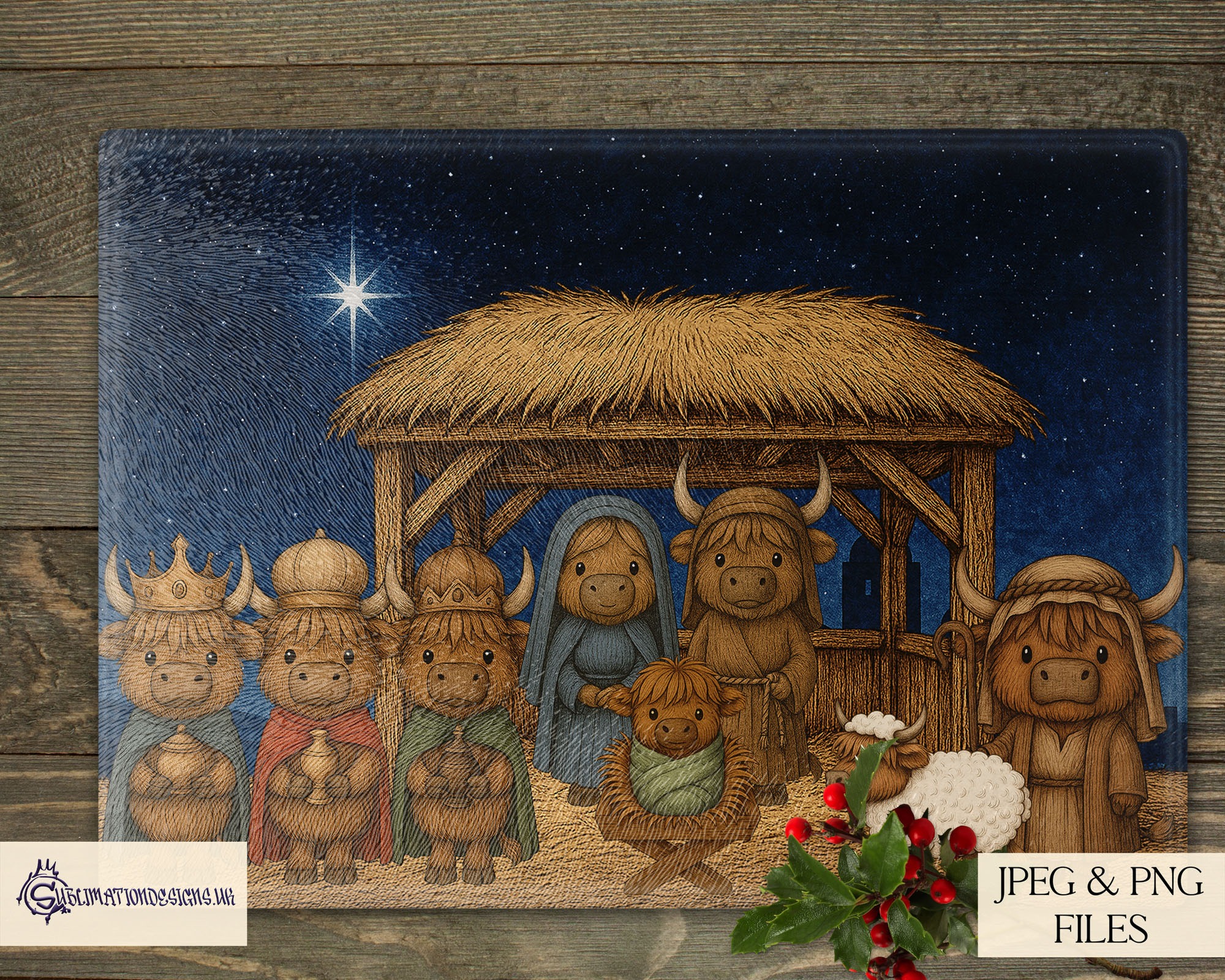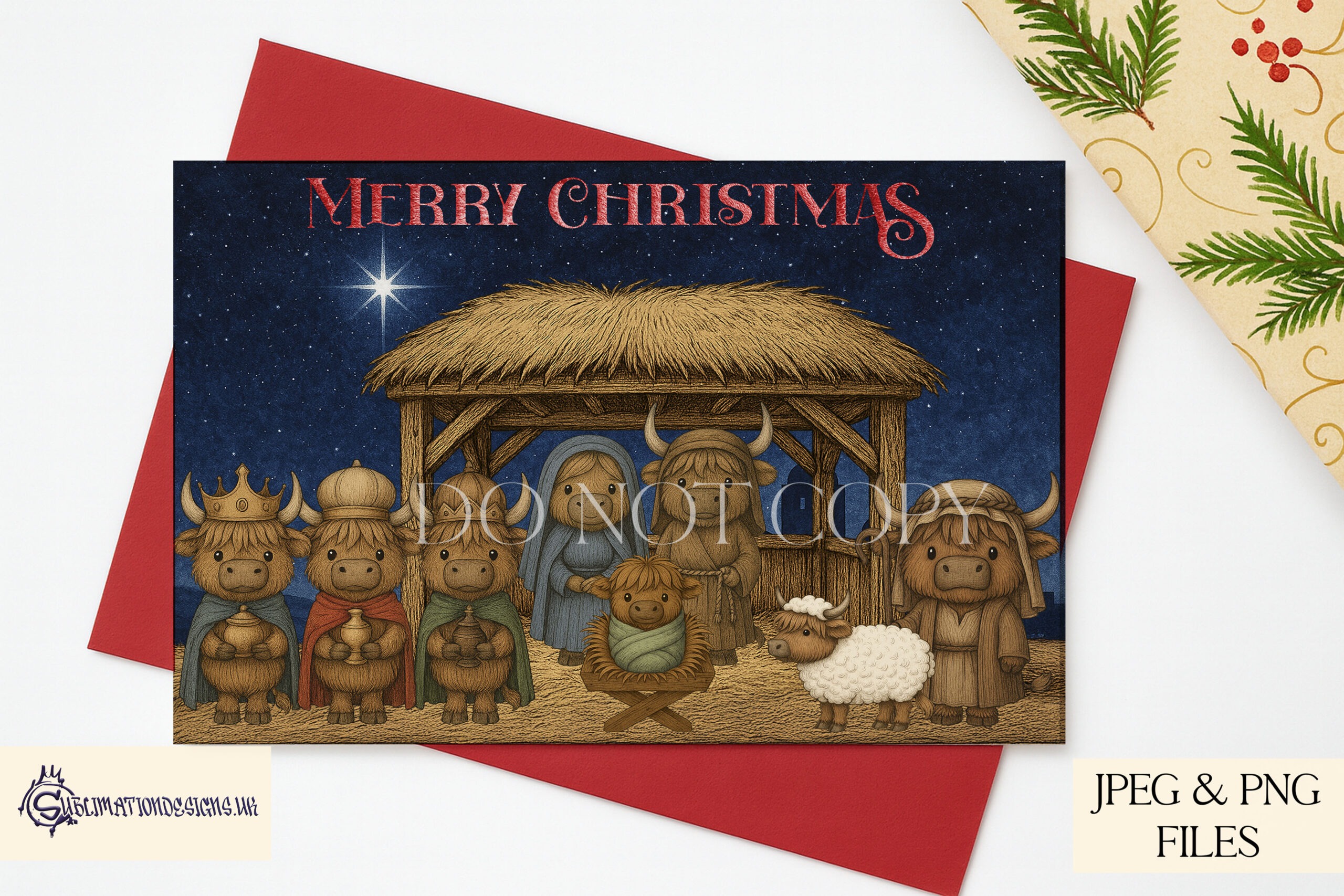 2 Highland cow nativity designs (JPEG & PNG, 300 DPI)