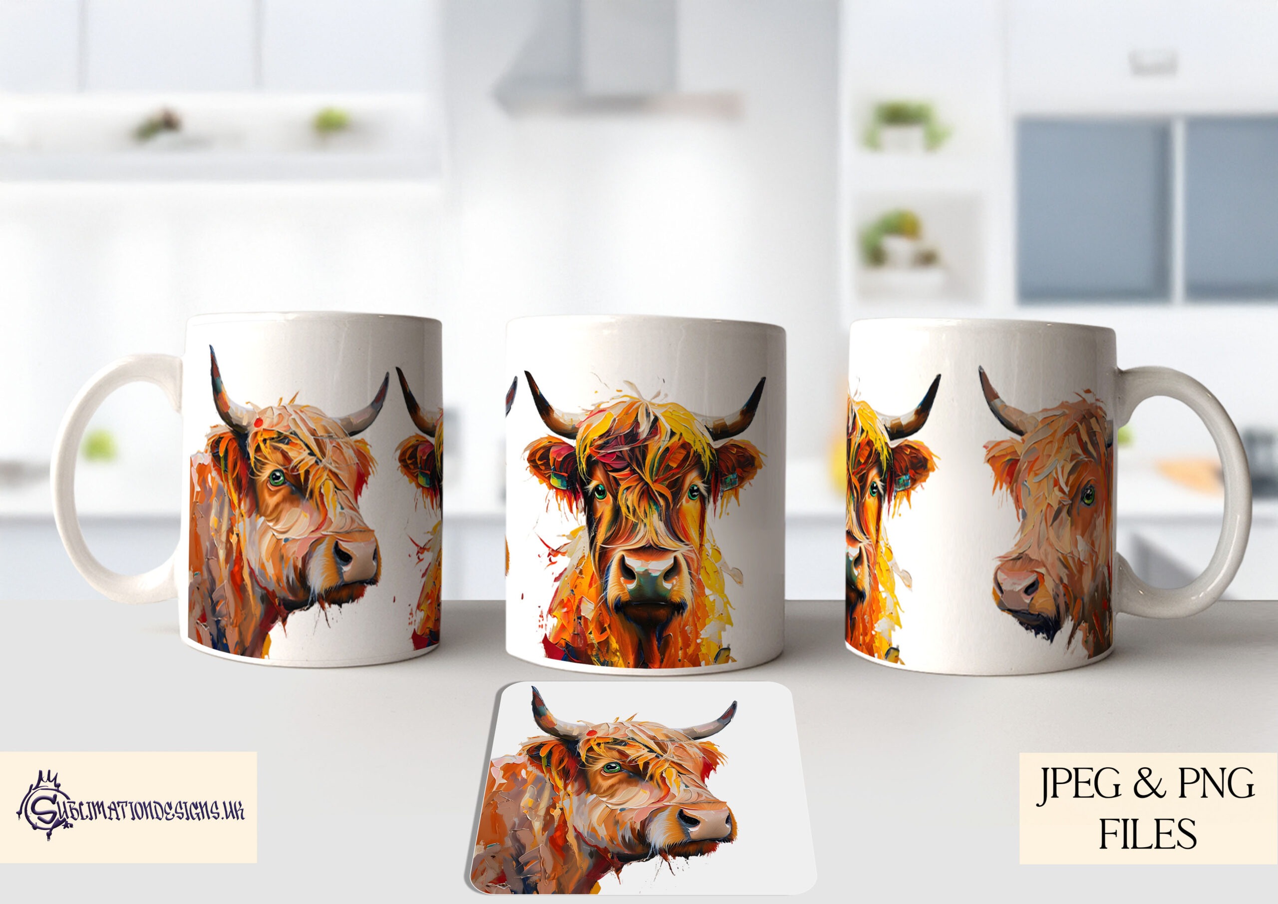 The Highland Cow Oil Painting Design Set is a stunning collection of digitally hand-painted Highland cows, designed to bring a bold and artistic touch to your creations. This set features rich, vibrant brushstrokes, making it perfect for kitchenware, mug wraps, coasters, and more.