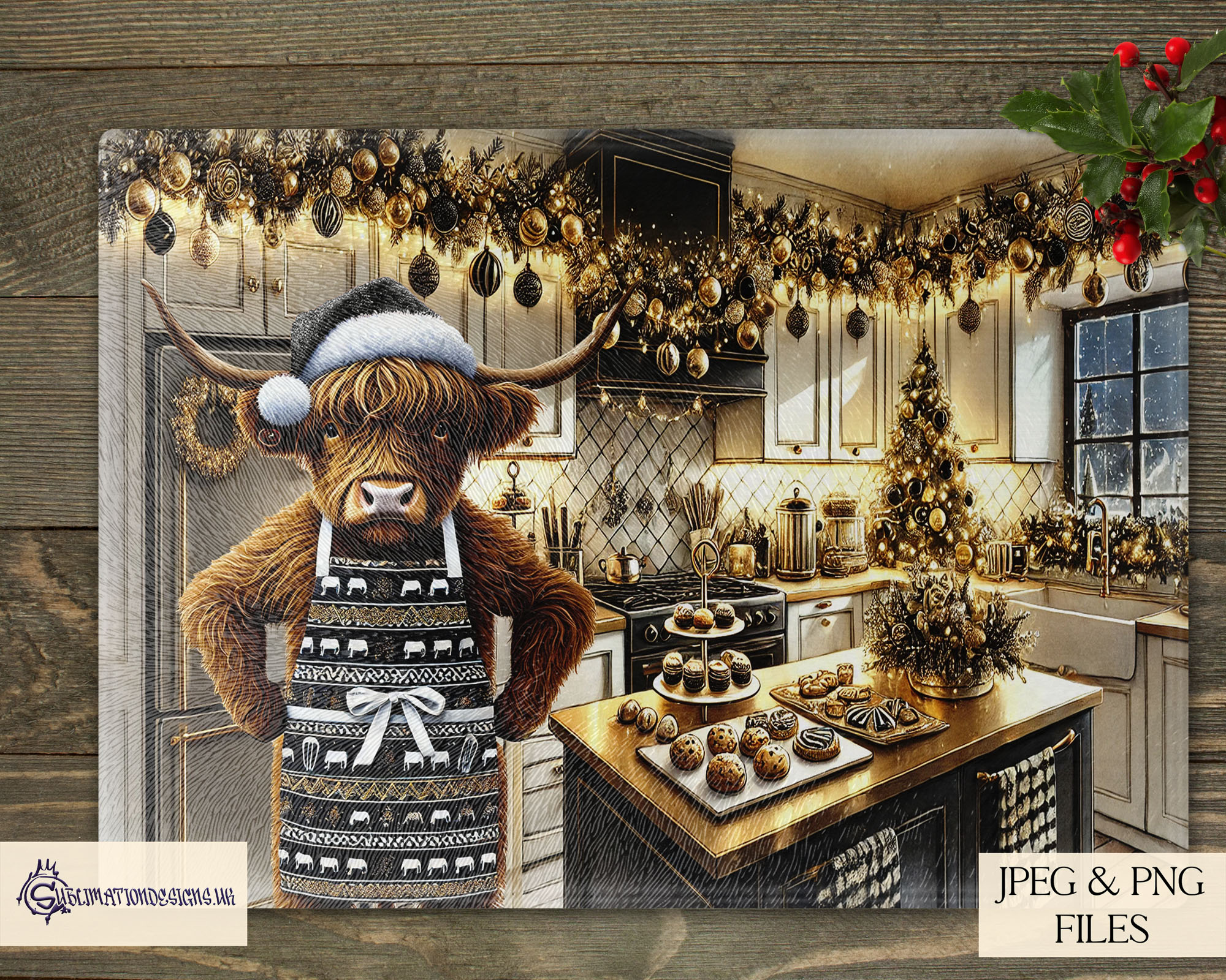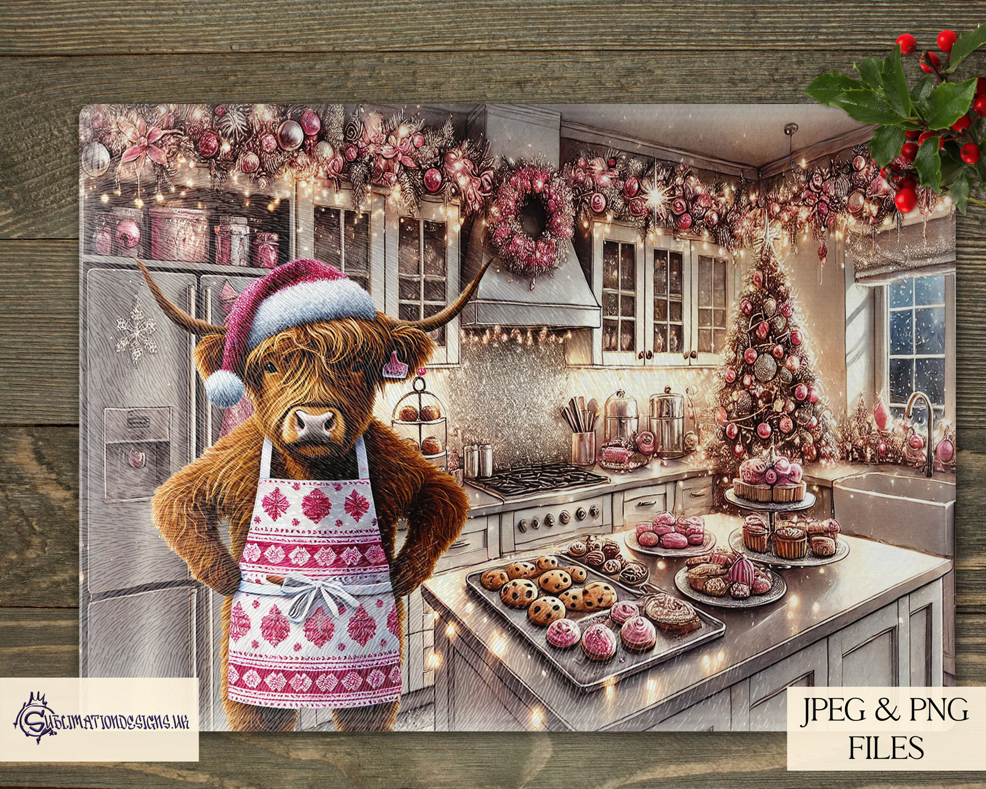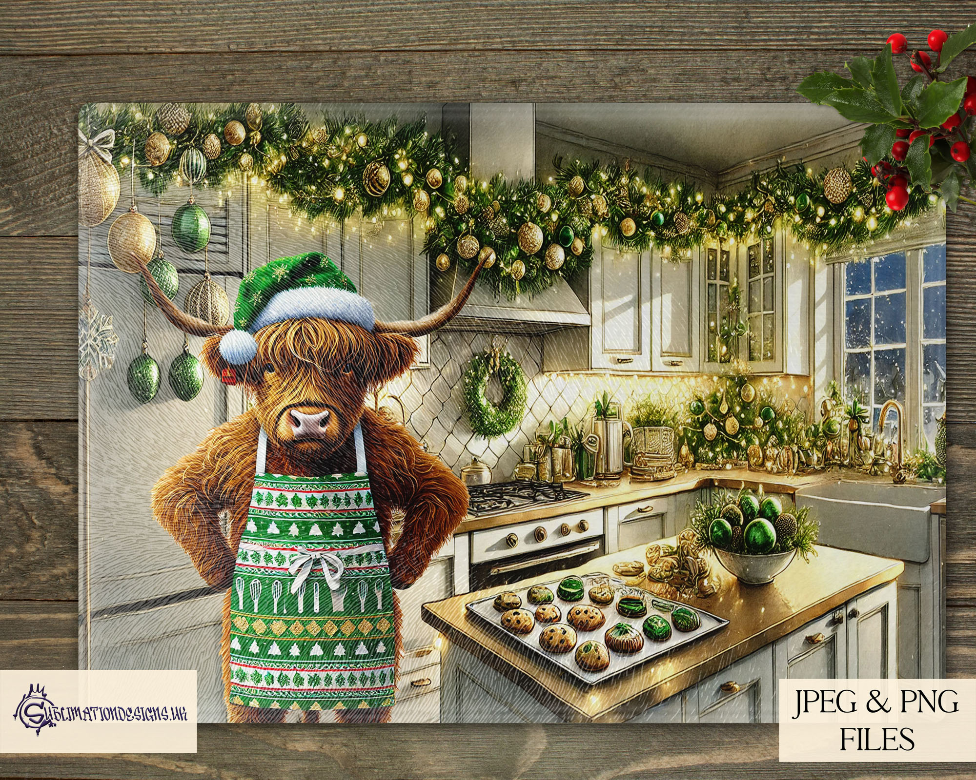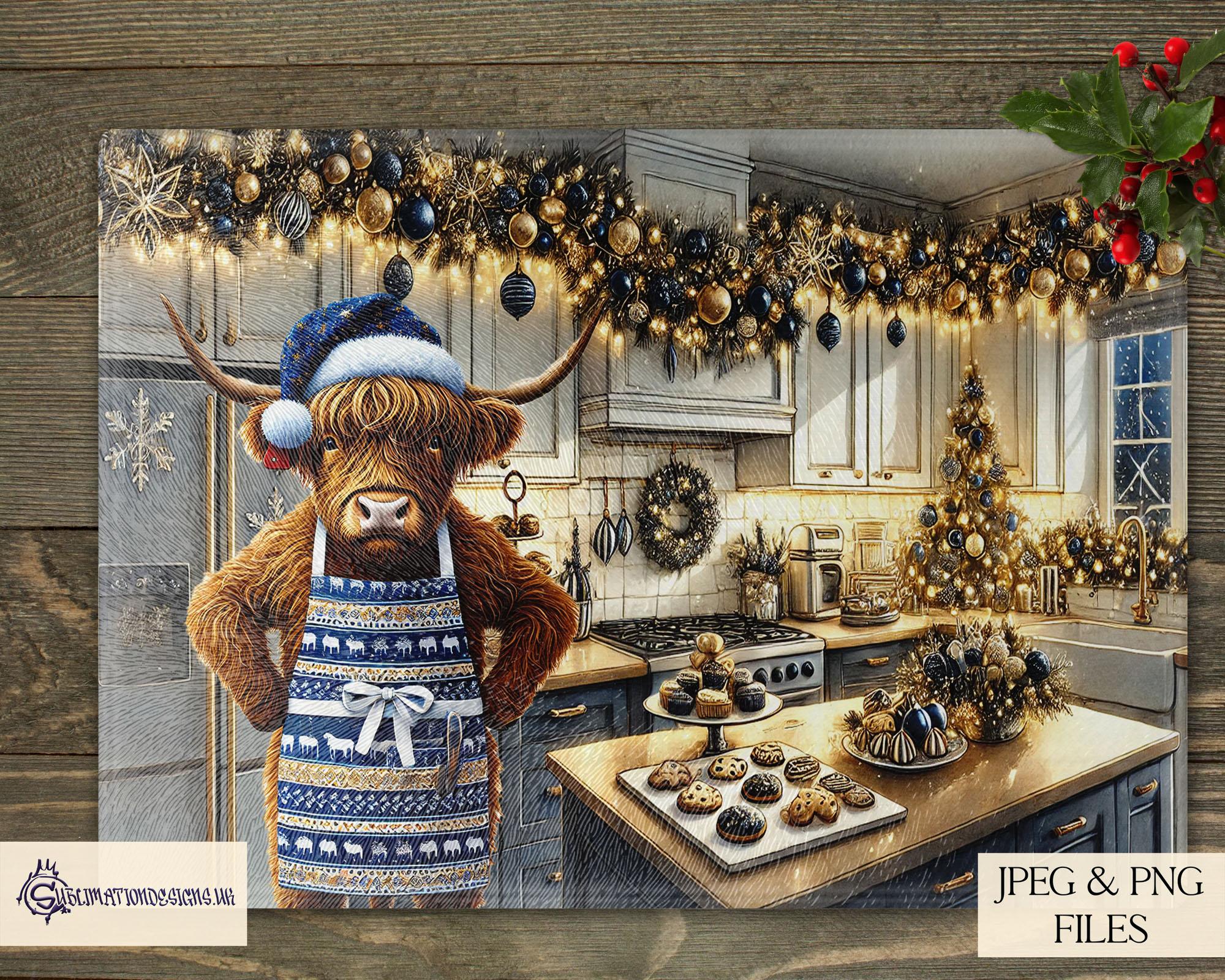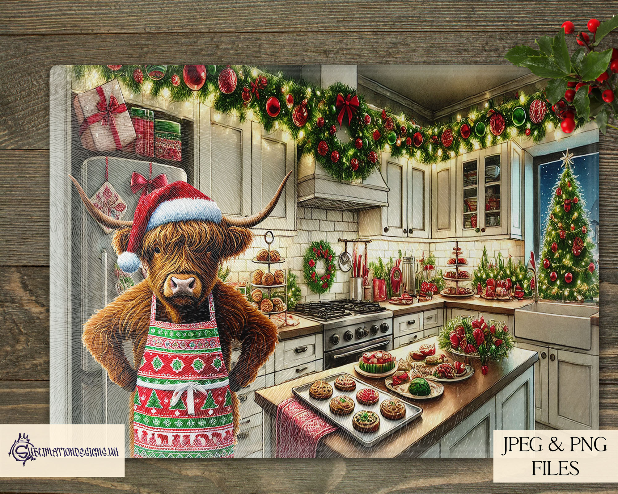 5 Highland Cows Christmas Kitchen designs (JPEG & PNG, 300 DPI)