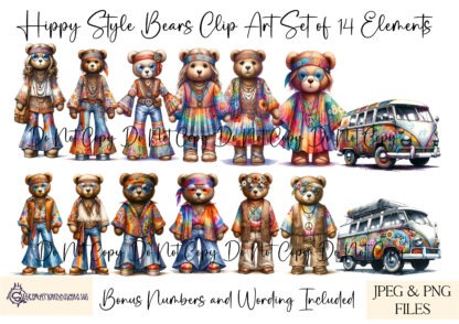 - Number of Designs: 12 hippy bears, 2 camper vans, and 15 additional PNG elements for wording & numbers
