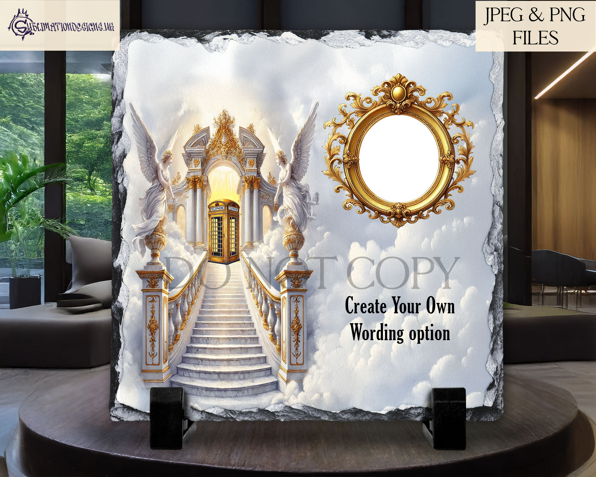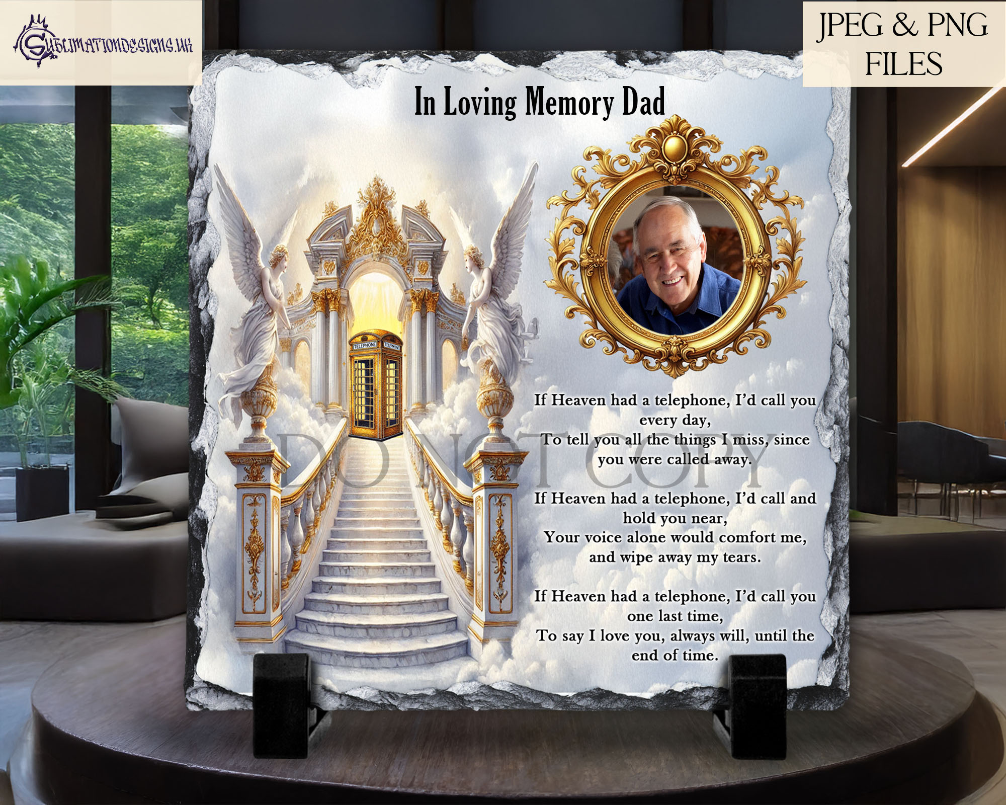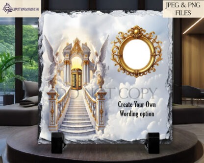 The If Heaven Had A Telephone Memorial Designs Set features an elegant and touching design, perfect for remembering a loved one. This set includes 3 unique designs inspired by the idea of a stairwell to heaven, with a beautiful gold telephone box. There is space to add a personal photo of your loved one, making this a sentimental keepsake.