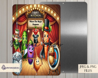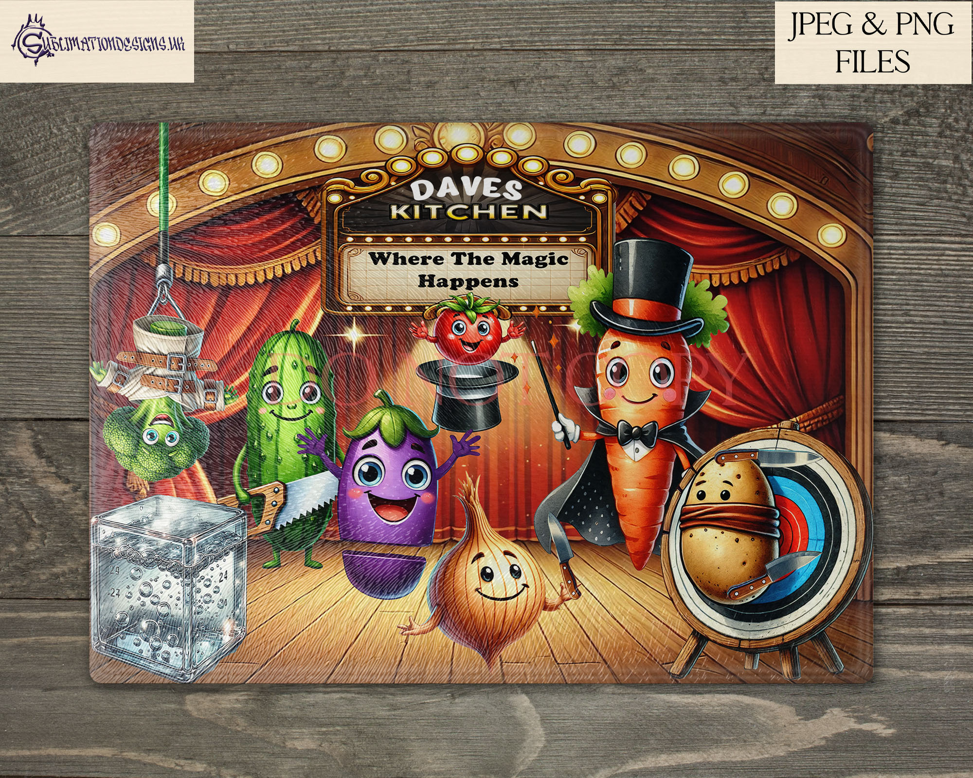 Introducing the Kitchen Magic Design Set, a fun and whimsical A4 landscape design, perfect for chopping boards, kitchen décor, and more. This entertaining design features vegetable characters performing classic magic tricks on stage, bringing humour and creativity to your kitchen projects.
