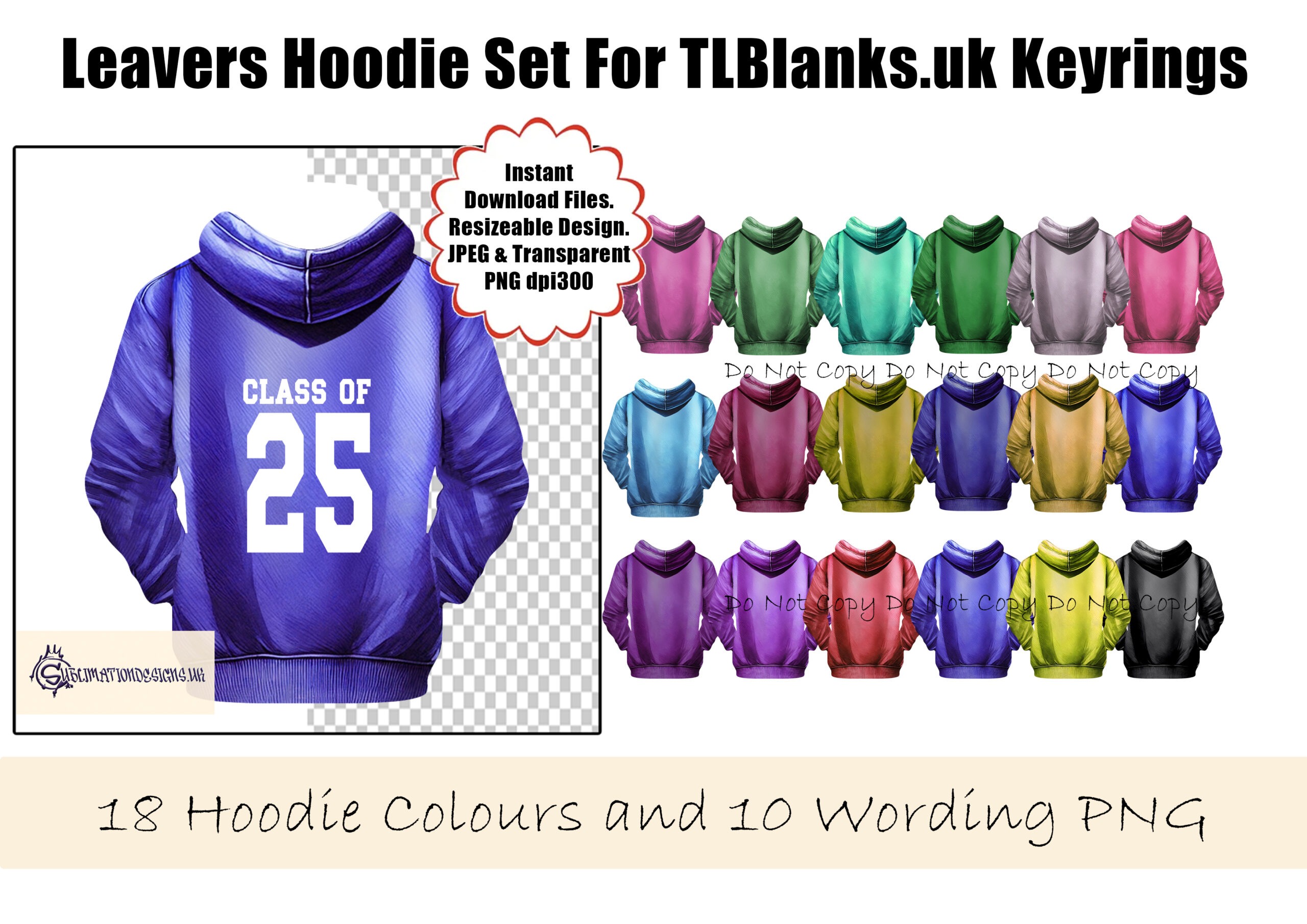The Leavers Hoodie Clip Art Set is a versatile and stylish collection designed for graduation keepsakes, school leavers’ gifts, and personalised memorabilia. Featuring multiple hoodie colour variations, this set is shaped to fit hoodie shape 4 keyrings from tlblanks.uk, but is also perfect for mugs, leavers’ books, framed prints, and other custom products.